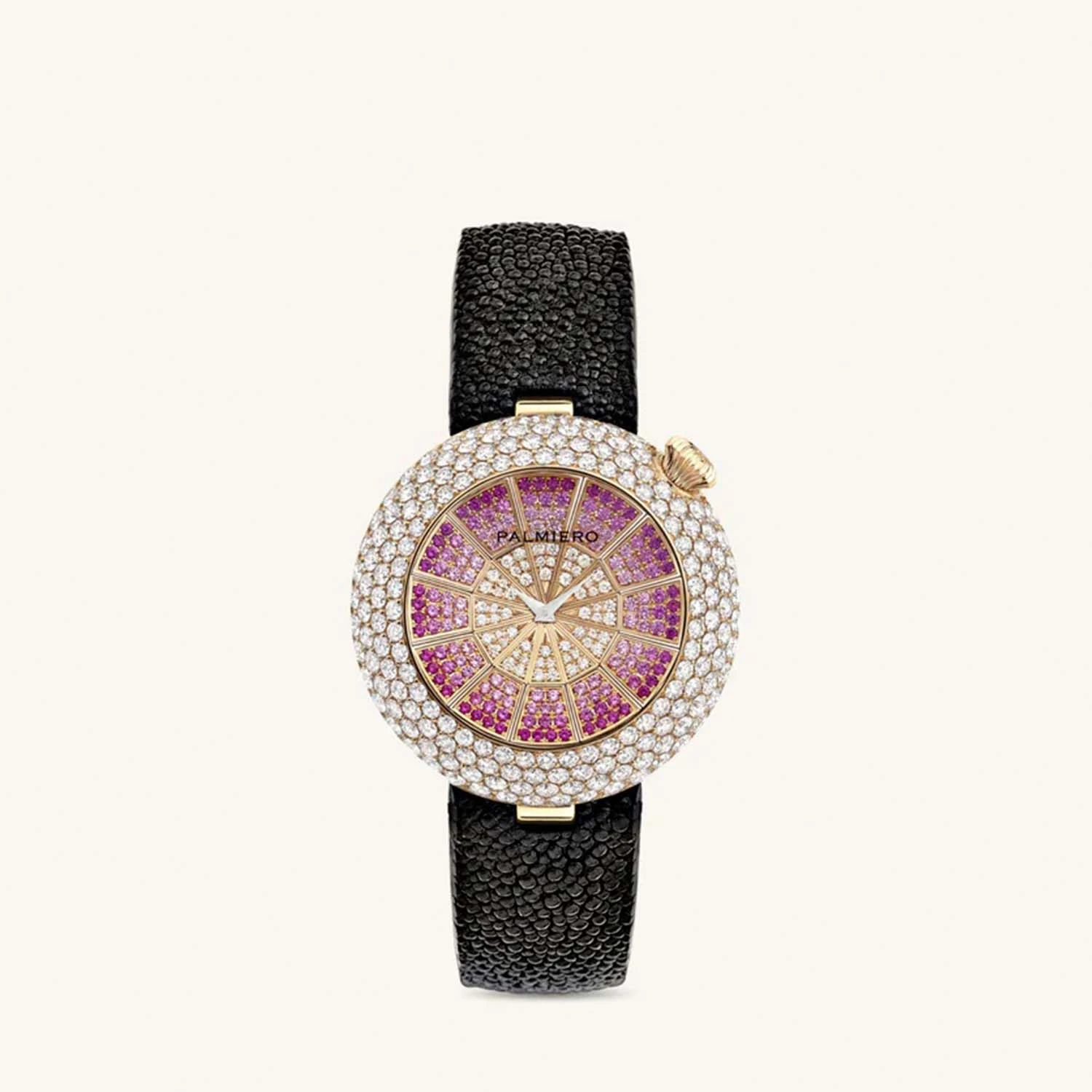 600 камней, бриллианты 9,23 карата, сапфиры 1,18 карат, размер корпуса 39 мм, общий вес изделия 89,