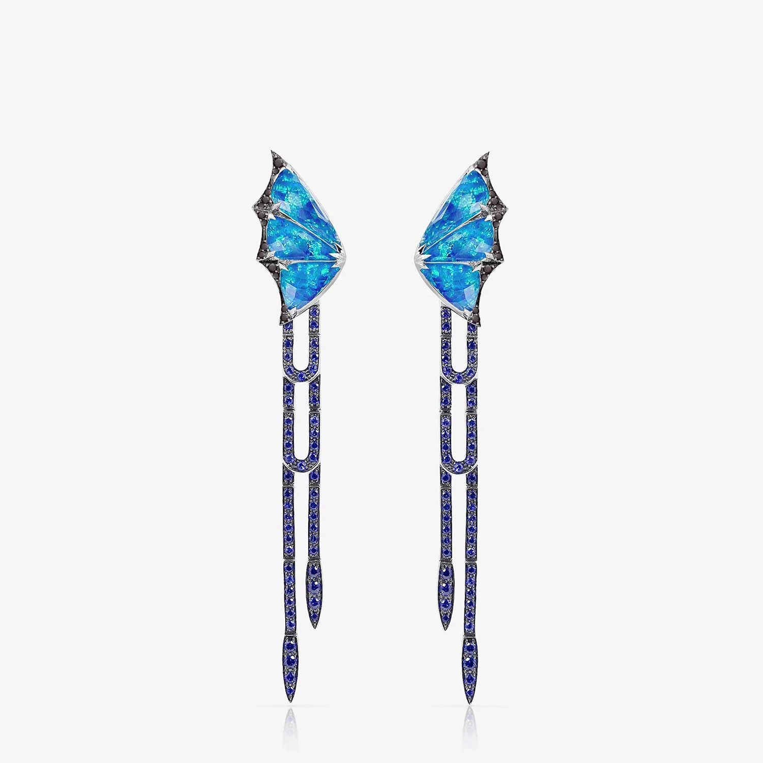 Серьги из белого золота 18 карат с крыльями и черной опаловой дымкой и синими сапфирами с паве из черных бриллиантов. Длина 75 мм, ширина 12,5 мм. Общий вес: 16,61 г.