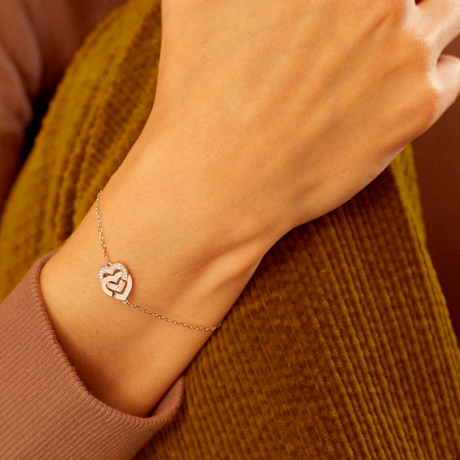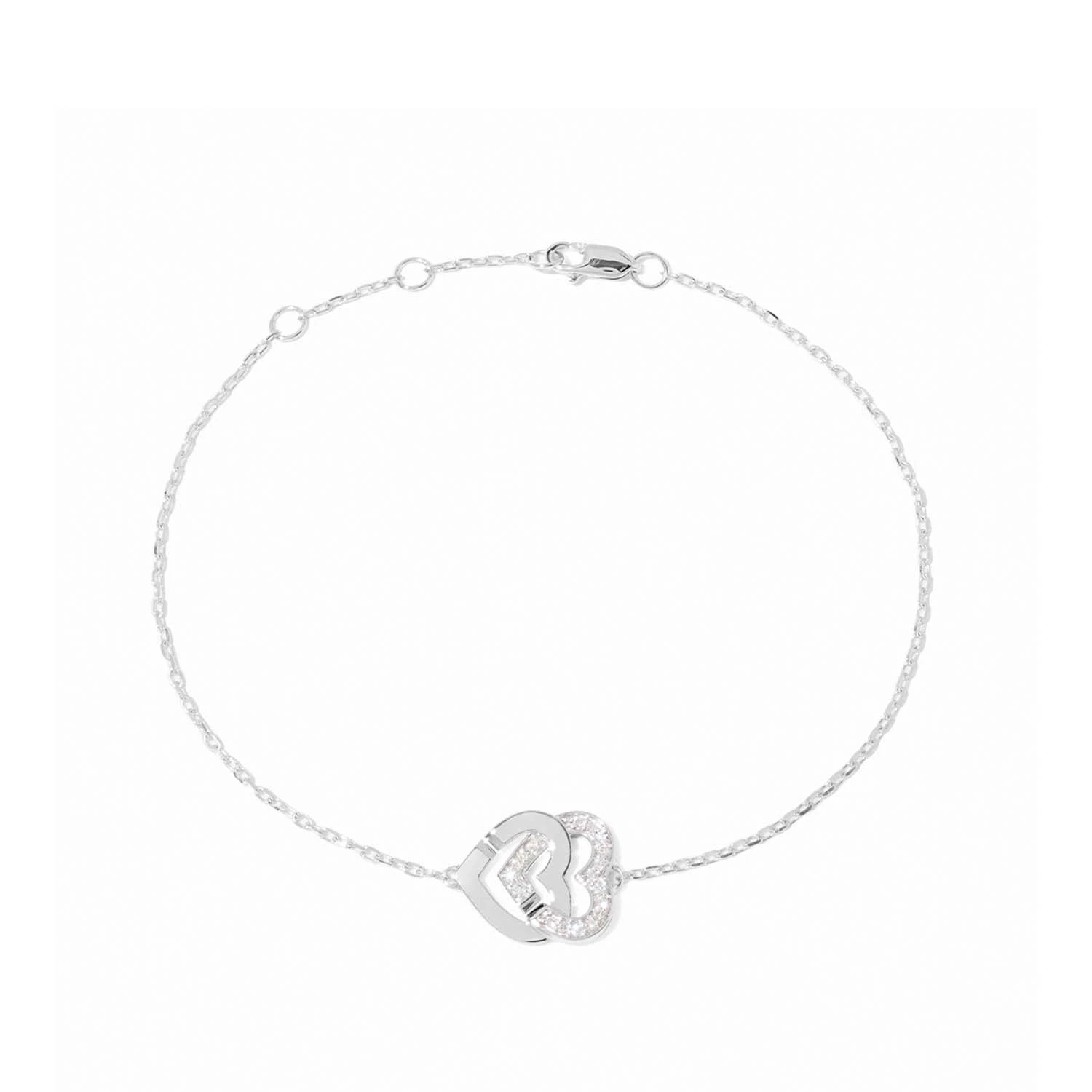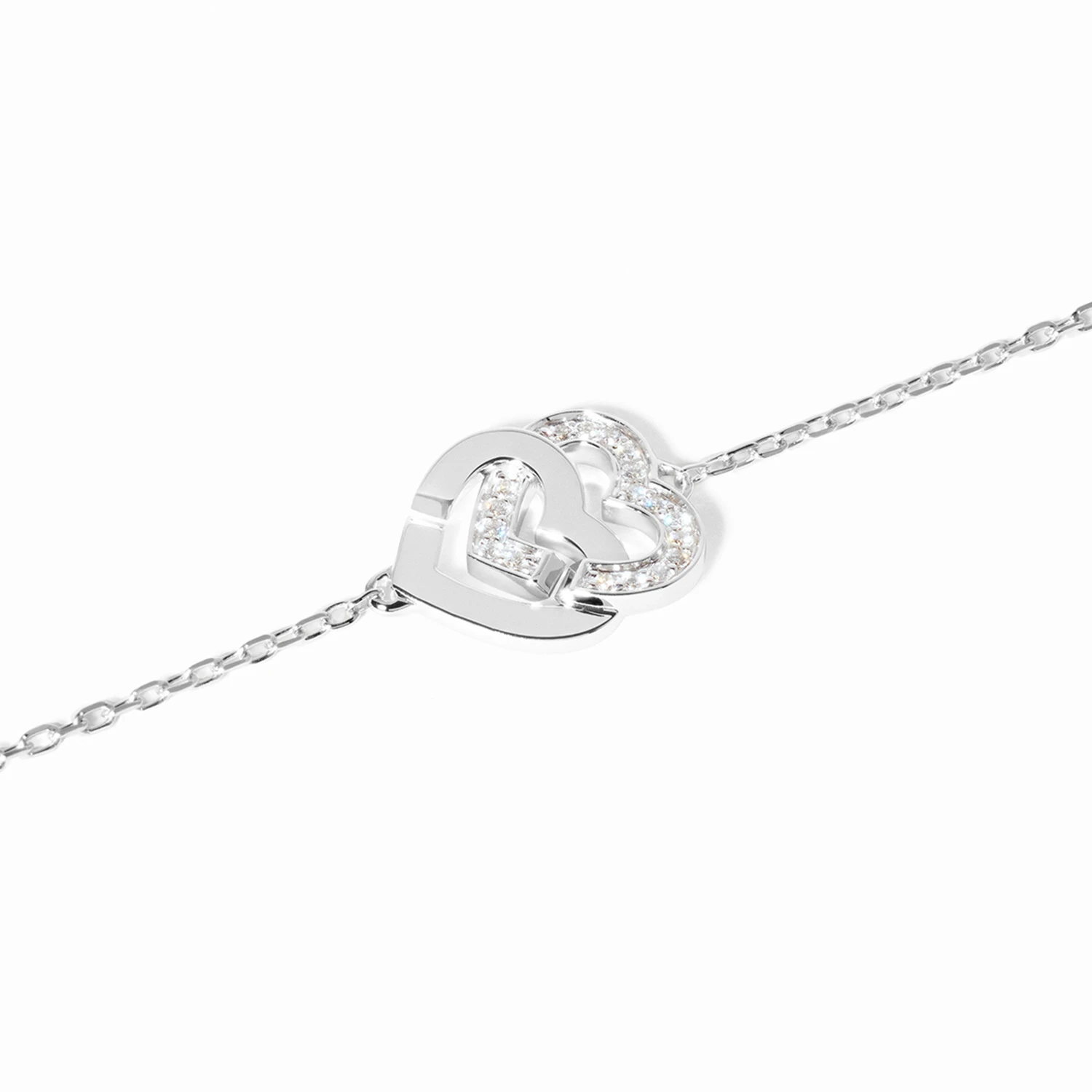 Роскошный браслет Double C?urs из белого золота 18 карат, инкрустированный бриллиантами. Два переплетённых сердца на тонкой цепочке создают изящную и выразительную композицию, где сияние камней подчёркивает каждую линию. Холодный блеск белого золота усиливает эффект чистоты и благородства, придавая украшению статусное и утончённое звучание. Символ единства и вечной связи раскрывается в элегантной, по-настоящему драгоценной форме. Длина цепочки: 17 см. Регулируется до 15 и 16 см благодаря двум ко