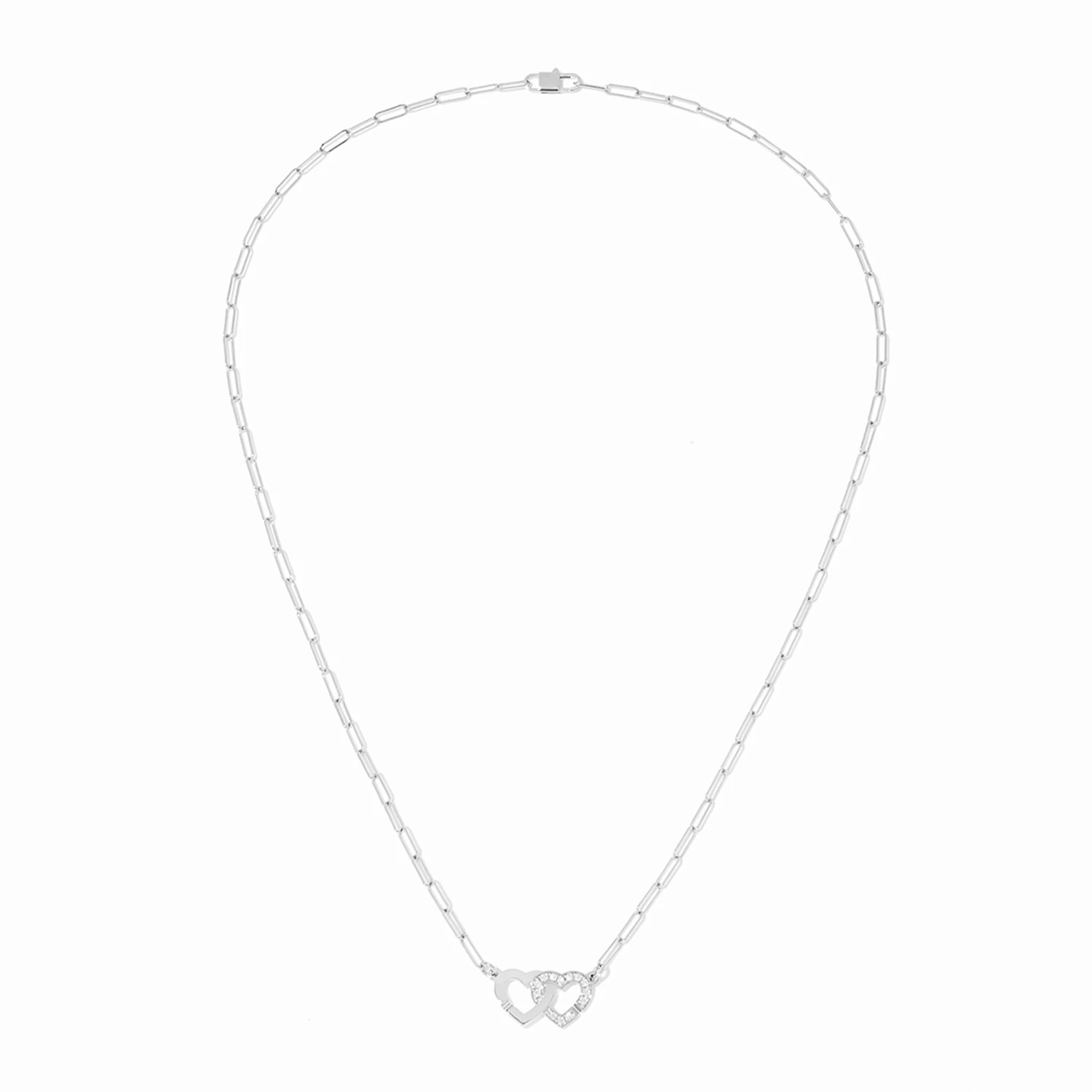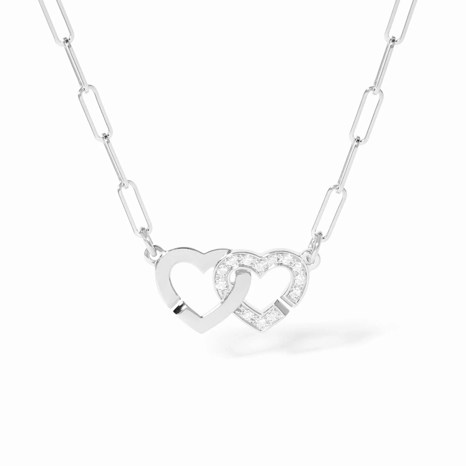 Колье Double C?urs из белого золота 18 карат с бриллиантовой инкрустацией. Два переплетённых сердца образуют лёгкую, почти воздушную композицию, где пространство становится частью дизайна. Сияние камней деликатно очерчивает контуры формы, усиливая её современную графику, а холодный блеск белого золота придаёт украшению чистоту и выразительность. Символ единства и гармонии раскрывается в лаконичном, но эмоциональном образе, который остаётся актуальным вне времени. Длина: 42 см.