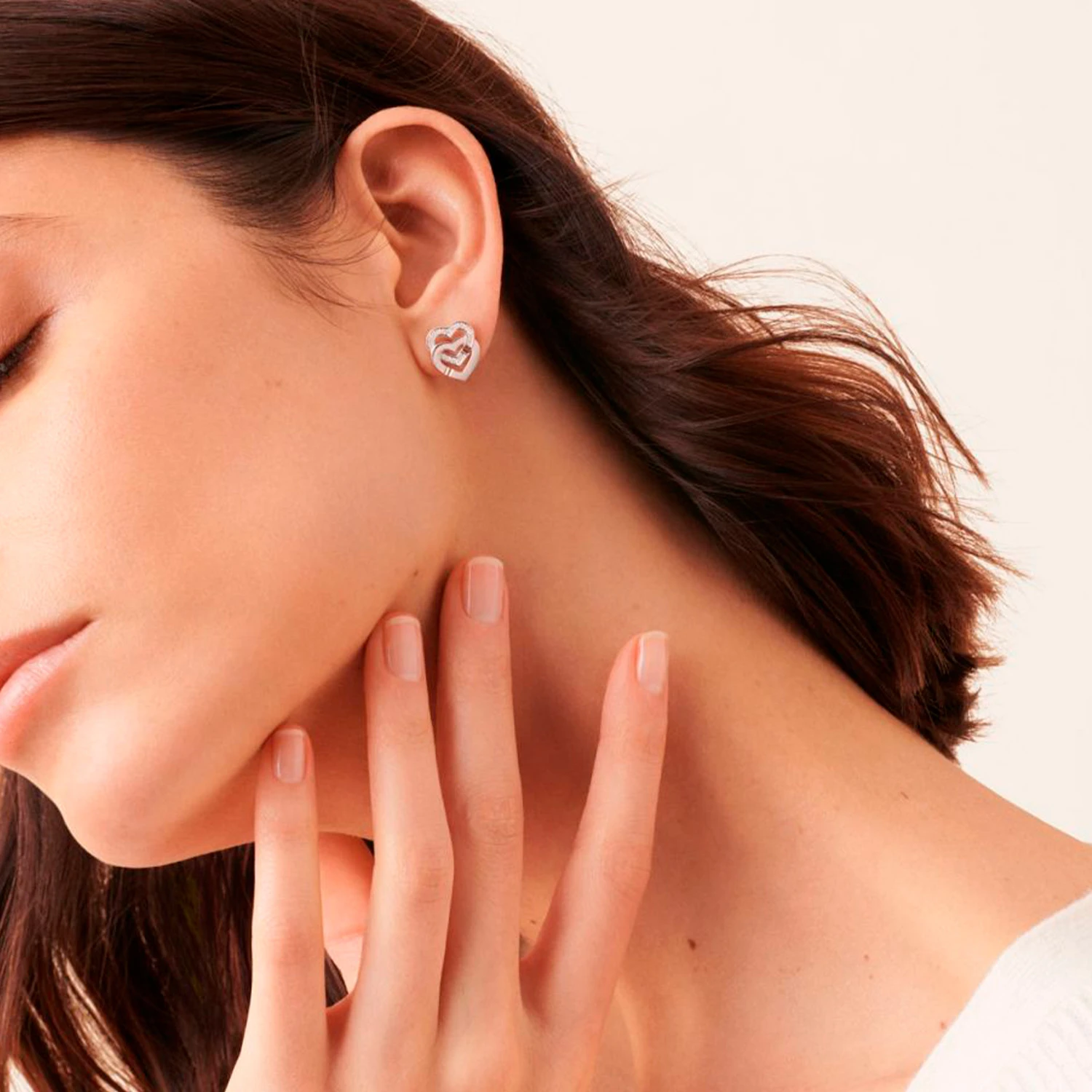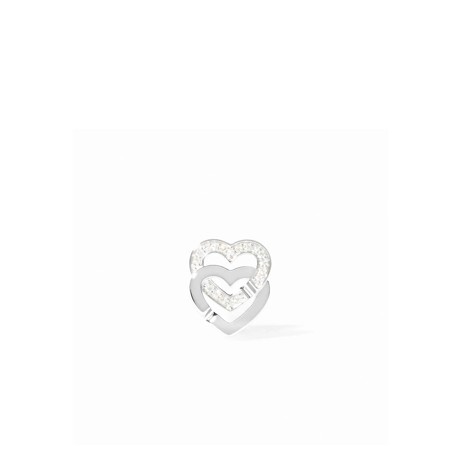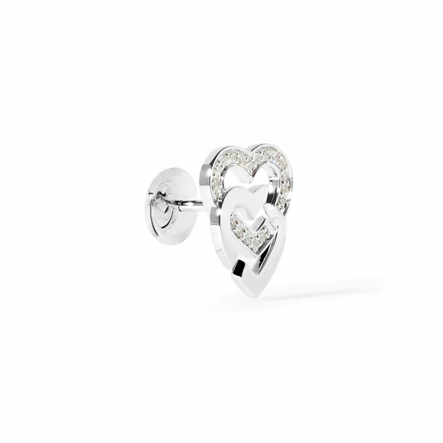 Моносерьга Double C?urs, маленькая модель, из белого золота 18 карат с бриллиантами. Два переплетённых сердца в вертикальной композиции создают современный и изящный силуэт, усыпанный сияющими камнями. Лаконичный символ «Ты и Я» превращает украшение в деликатный знак единства и привязанности. Представлена к продаже по одной серьге.