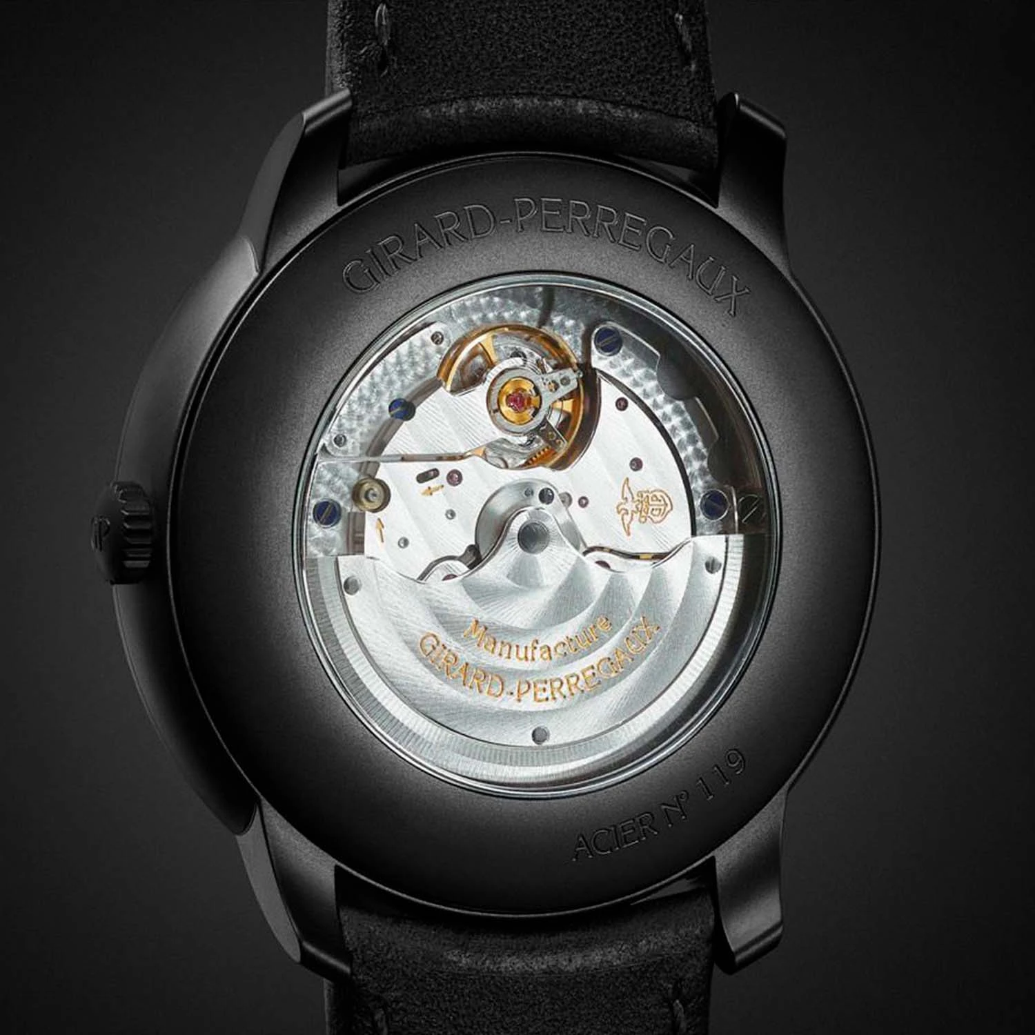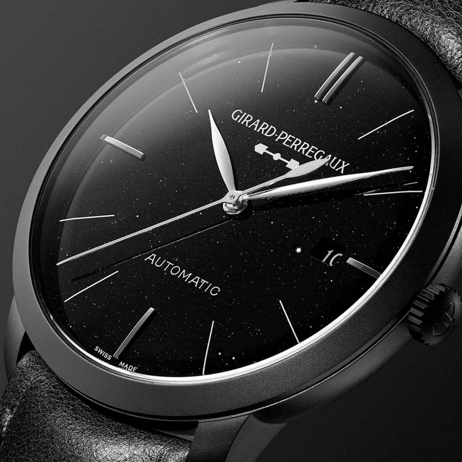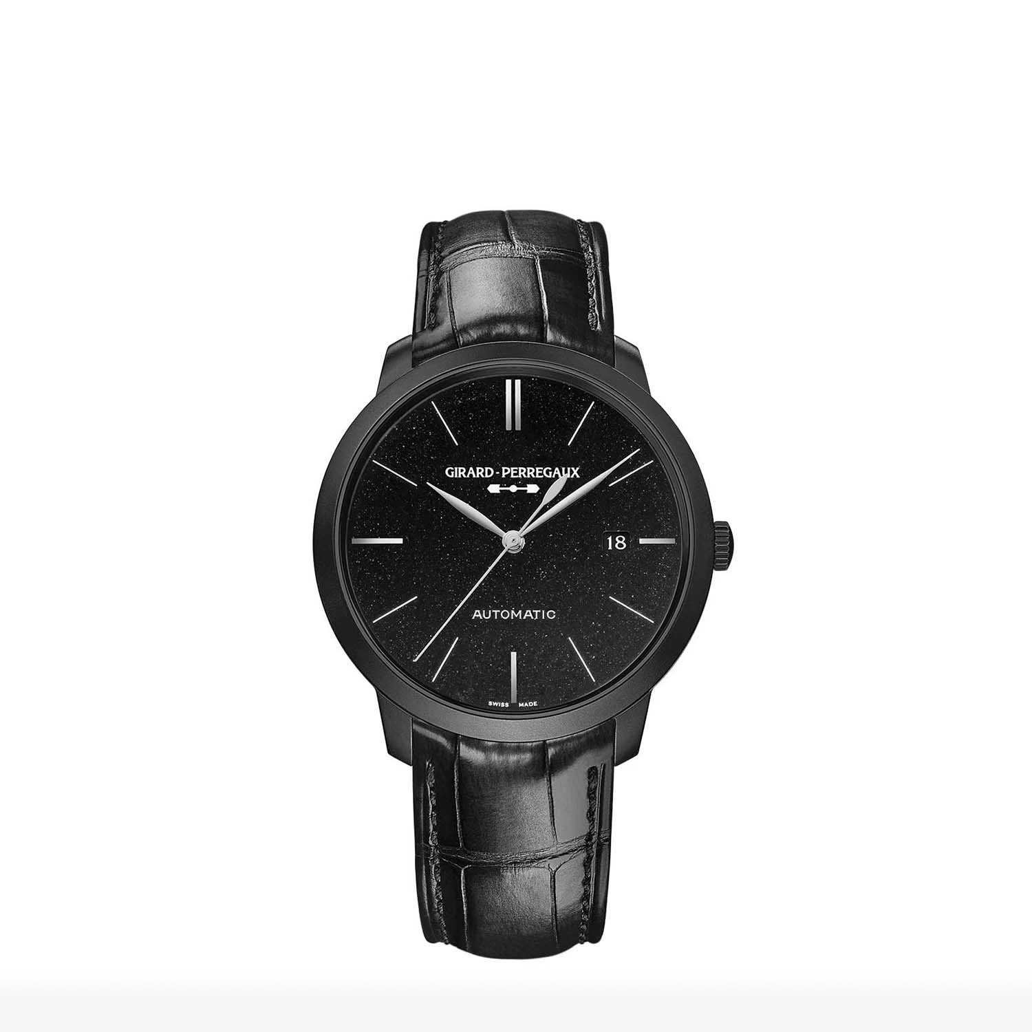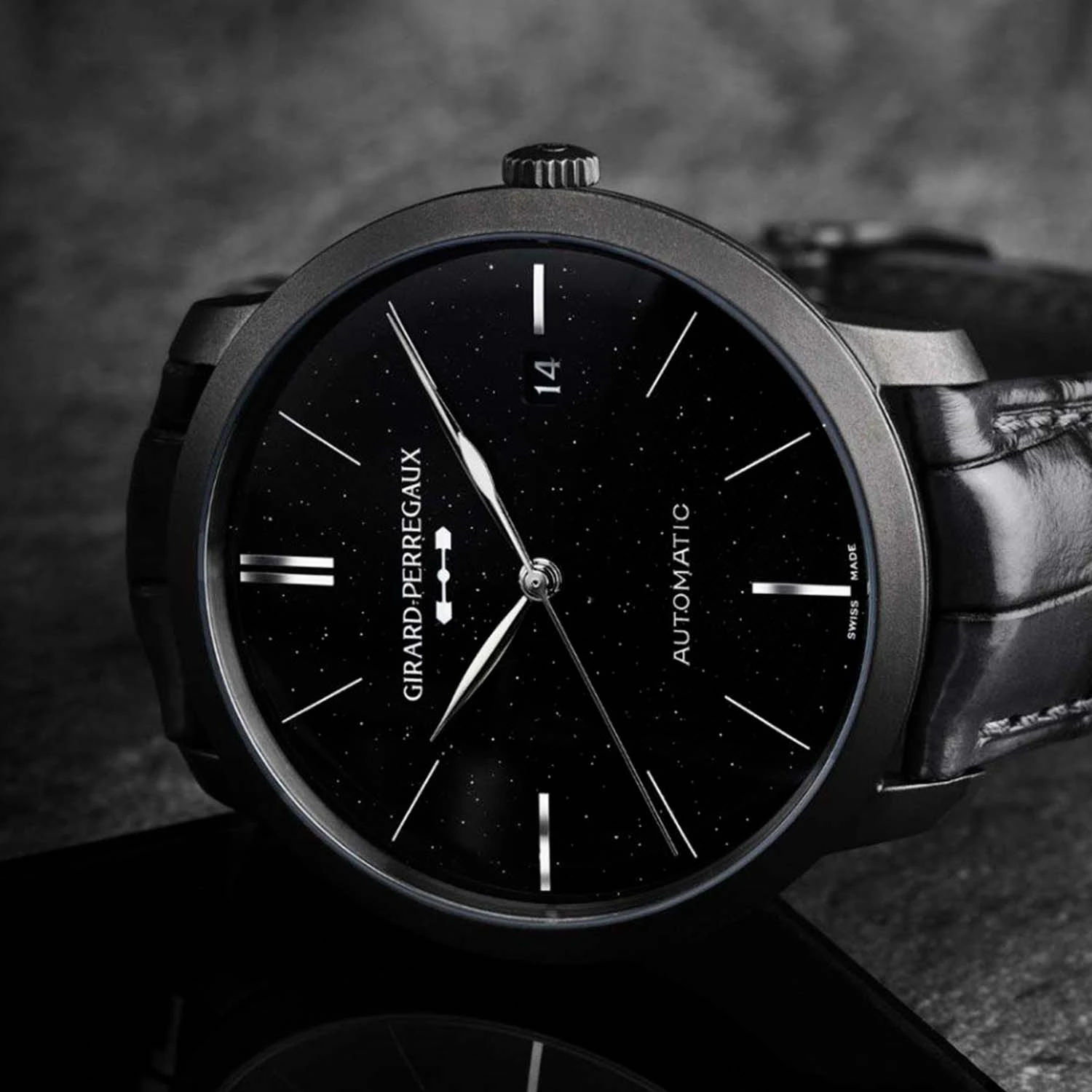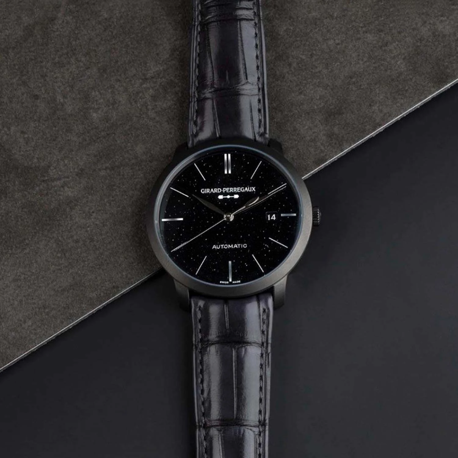 1966 Orion watch, self-winding movement, 40 mm diameter, 9.4 mm thickness, DLC-coated steel case, black aventurine dial, alligator strap, water-resistant 30 metres. Functions: hours, minutes, seconds, date