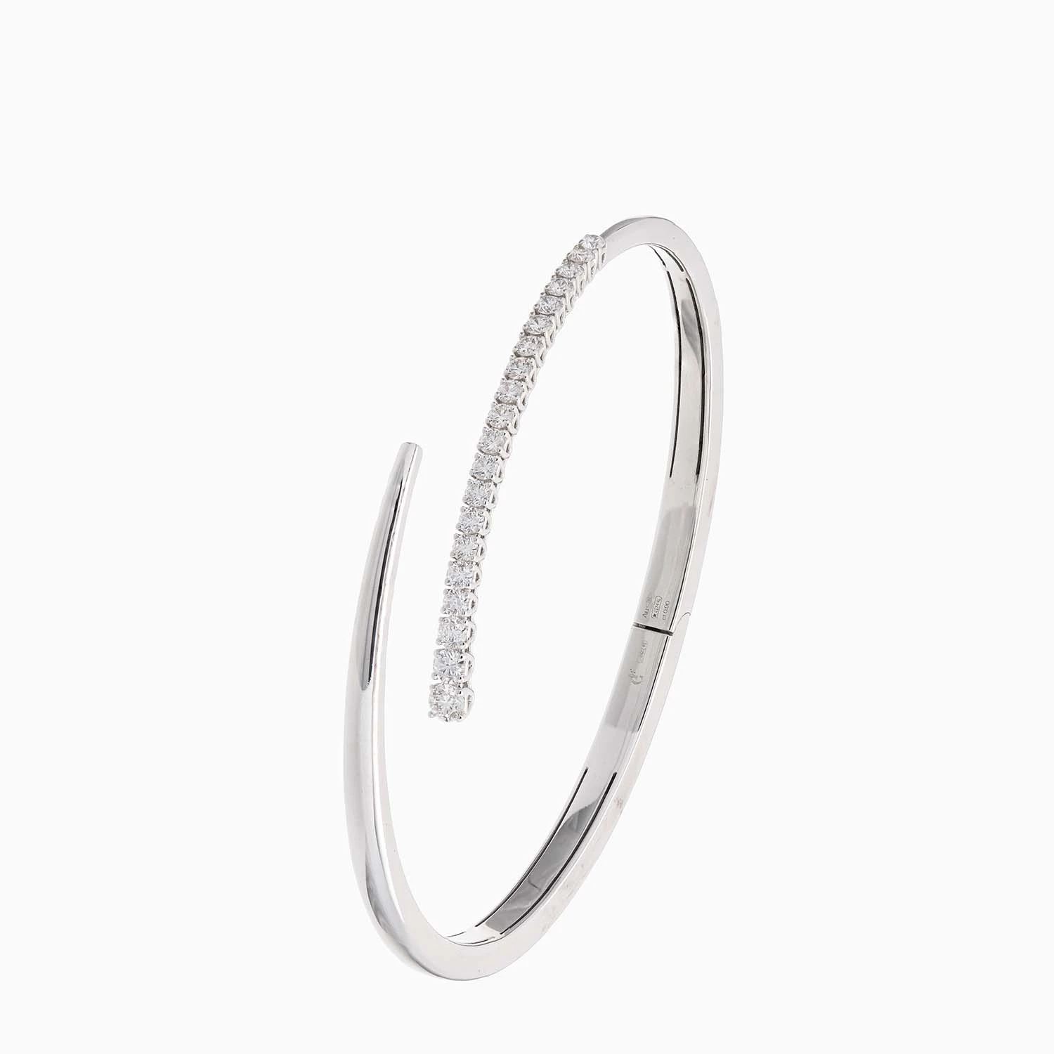 An elegant 18K white gold rigid bangle bracelet adorned with diamonds looks stunning both as a standalone piece and when paired with other jewelry, drawing all attention to your hands. Total weight: 15.87 g.