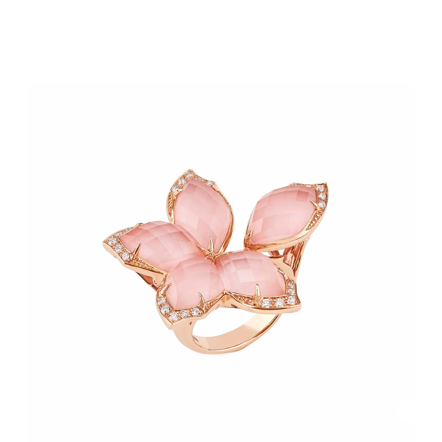 18 carat rose gold ring with pink opals and diamond pave setting. Total weight 16.56g.