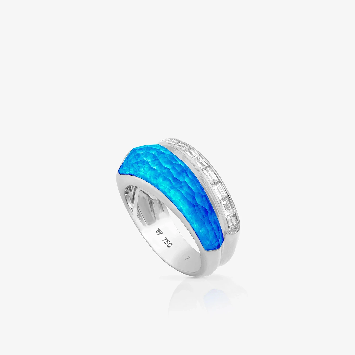 18 carat white gold ring set with black opals and white diamonds of baguette-cut. Strap width 17.3 mm. Total weight 18.75g.