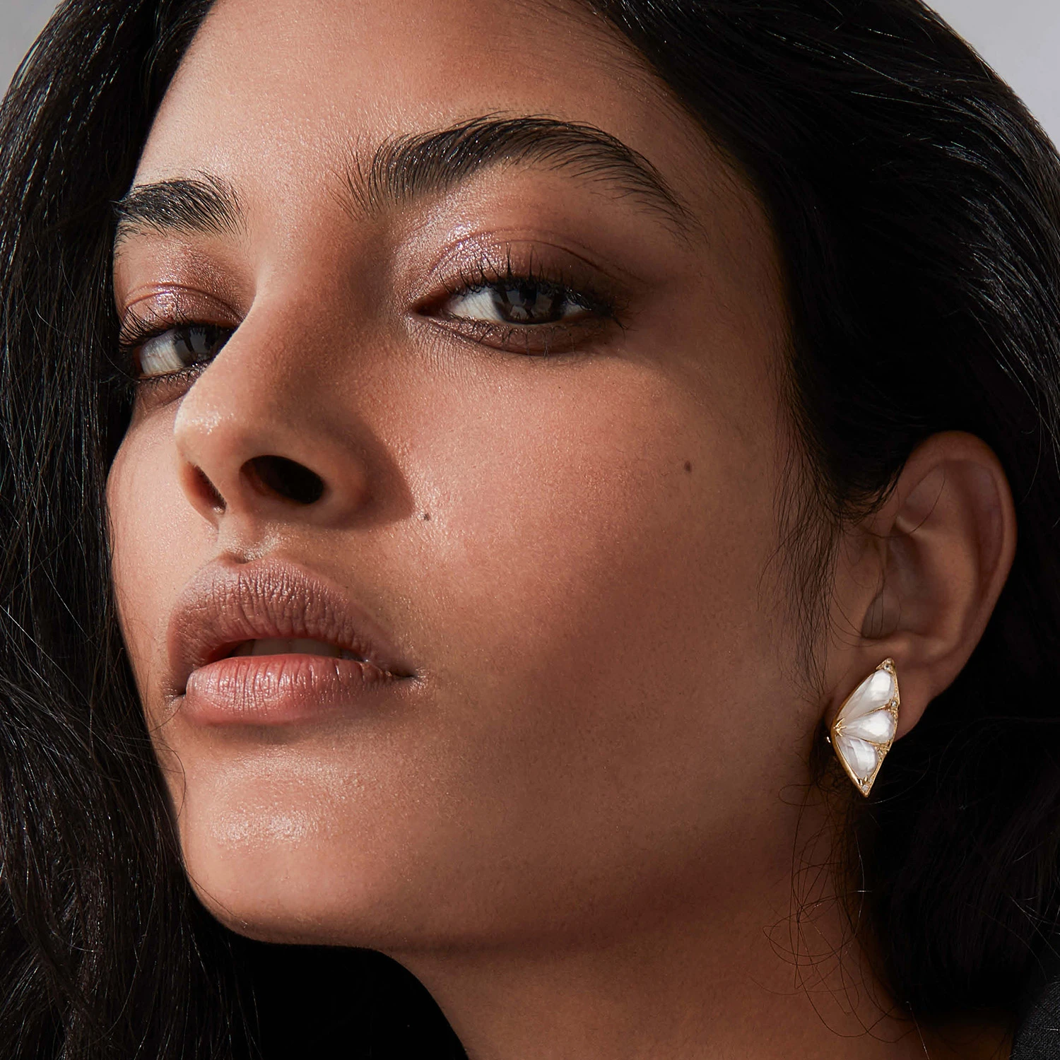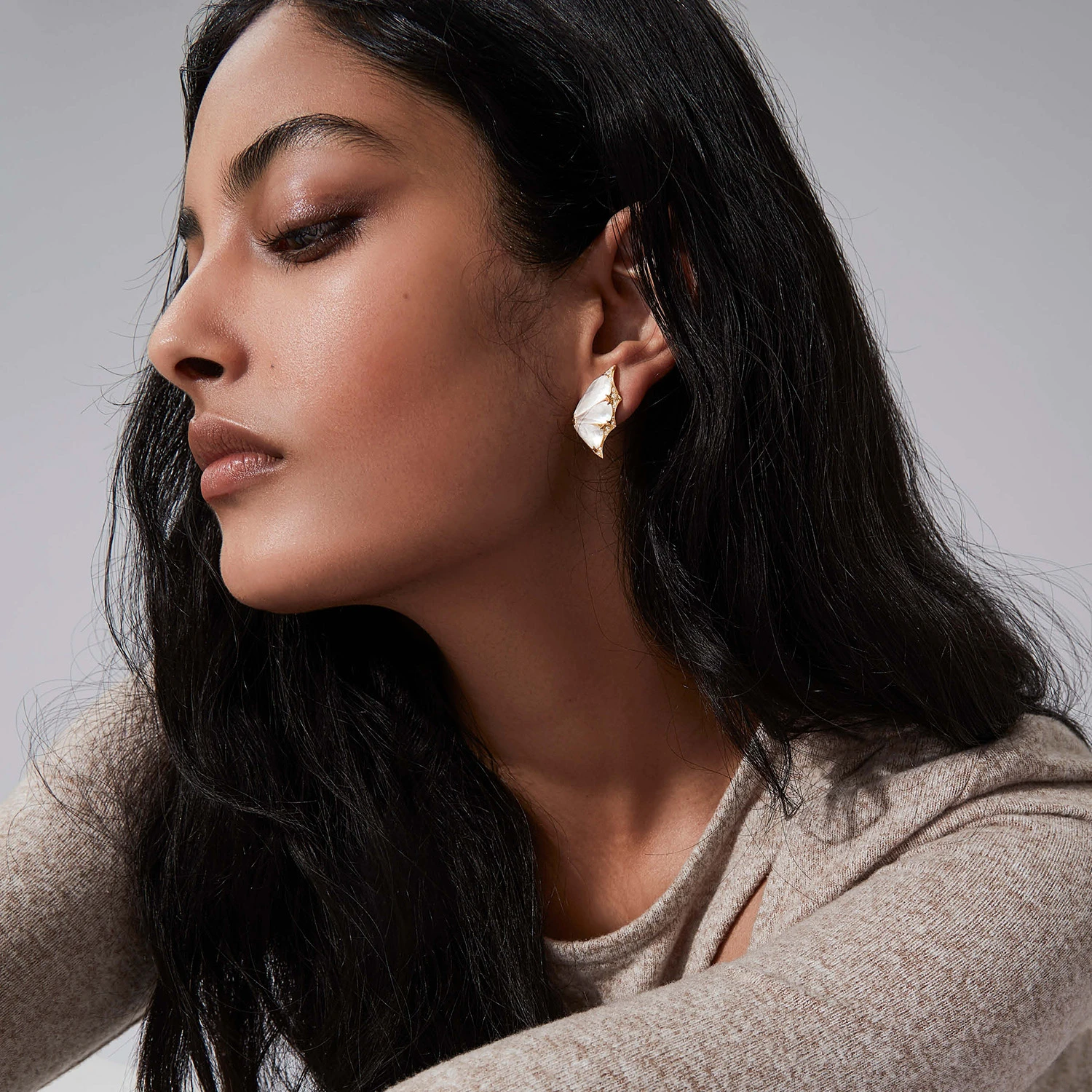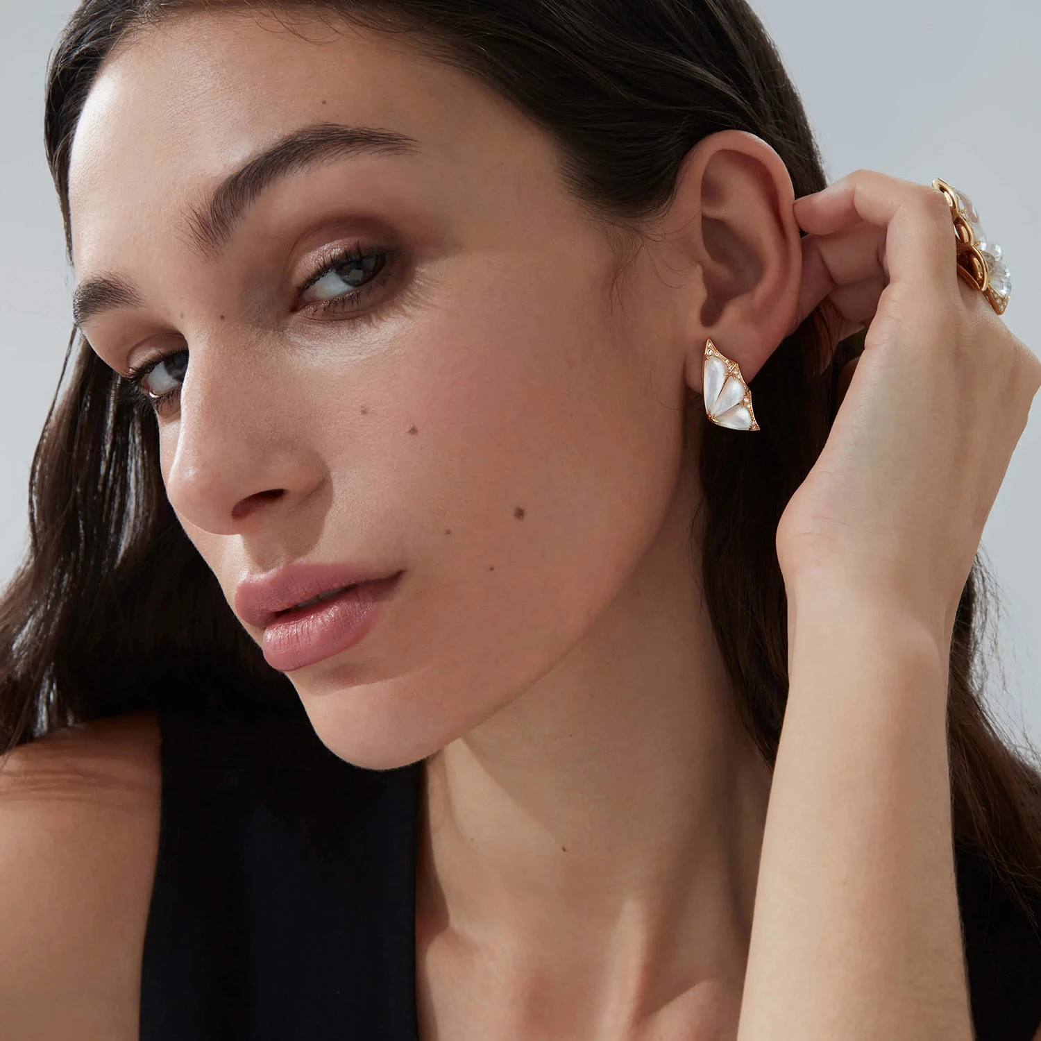 18 carat yellow gold earrings with white mother-of-pearl and white diamonds. Length 25 mm, Width 12.7 mm, Total weight 11.61 gr