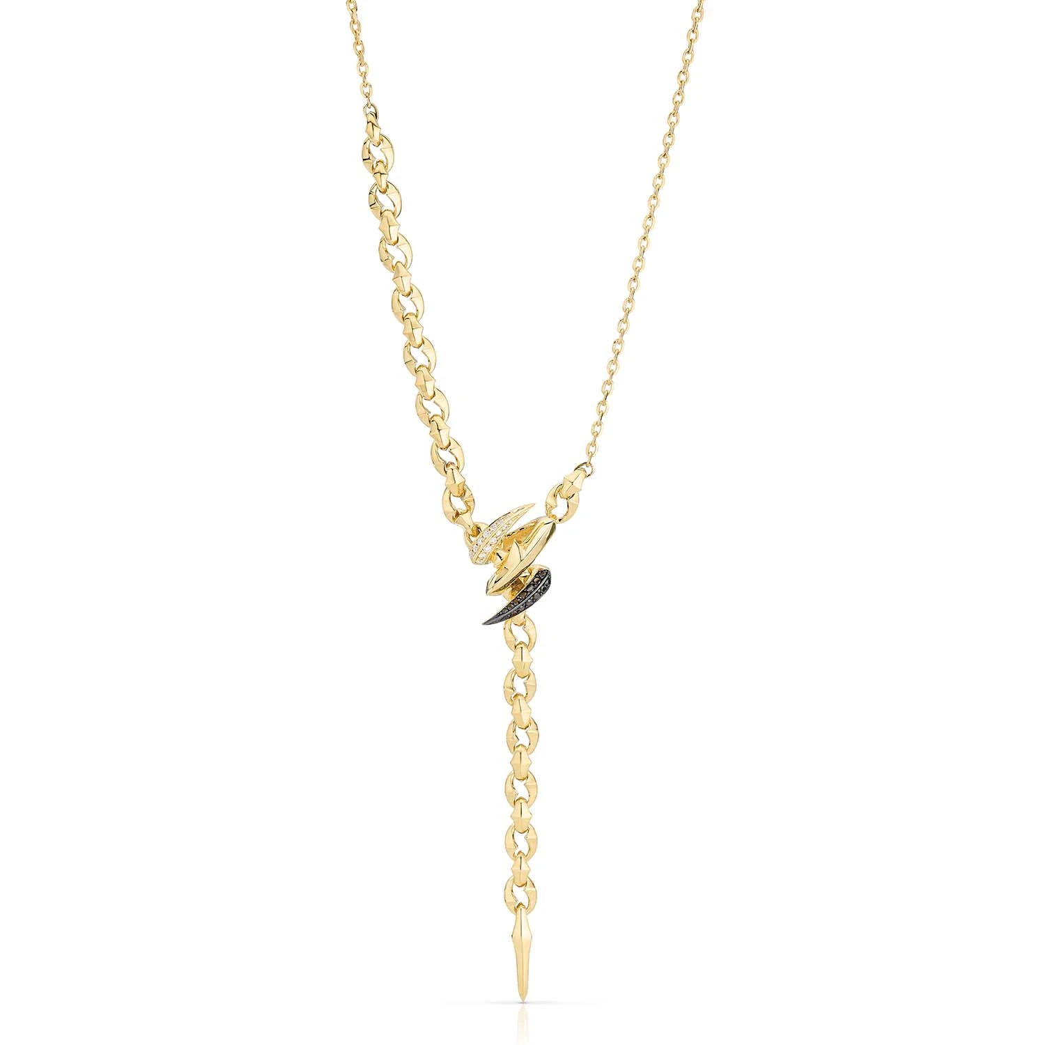 18 carat yellow gold necklace set with white diamonds and black diamond pave setting. Length 40.64 cm.
