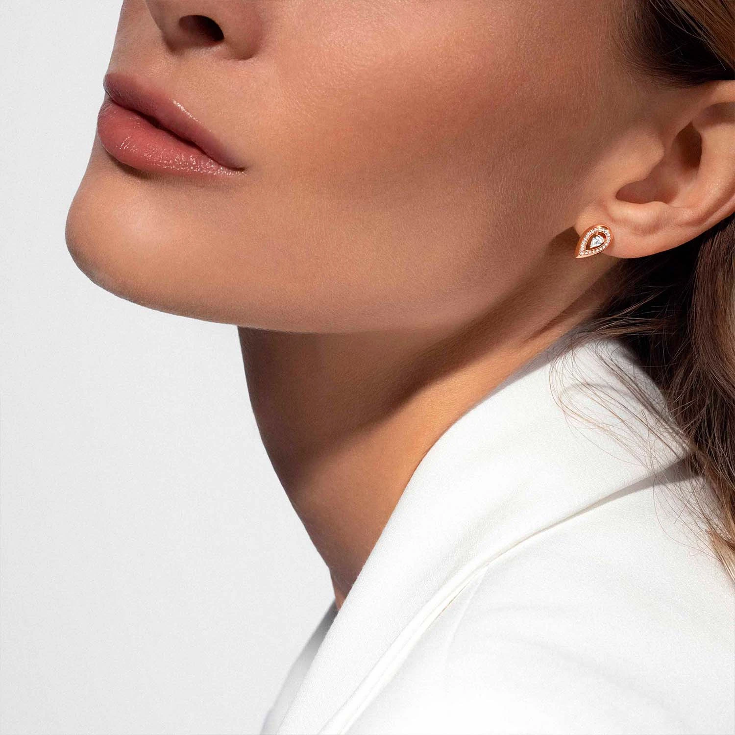 18 carat rose gold earrings set with diamond pave, pear cut.