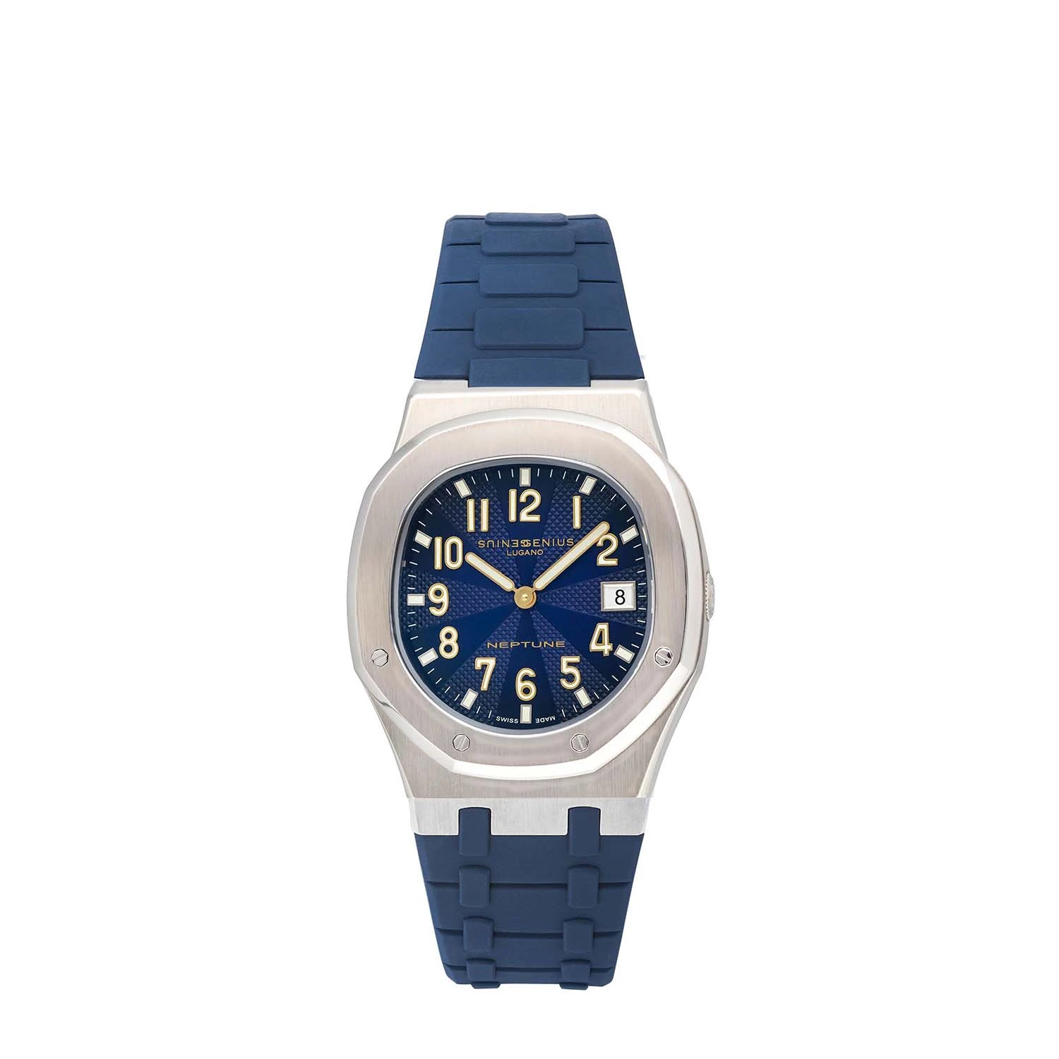 The Neptune watch features a quartz movement housed in a 39 х 49.8 х 10.6 mm stainless steel case, weighing 100 g. The crown is adorned with the GG logo. The textured dark blue guilloche dial pairs harmoniously with a lightweight silicone strap in a matching tone. Water-resistant up to 50 meters. The elegant and minimalist design makes this model especially suitable for active city dwellers.