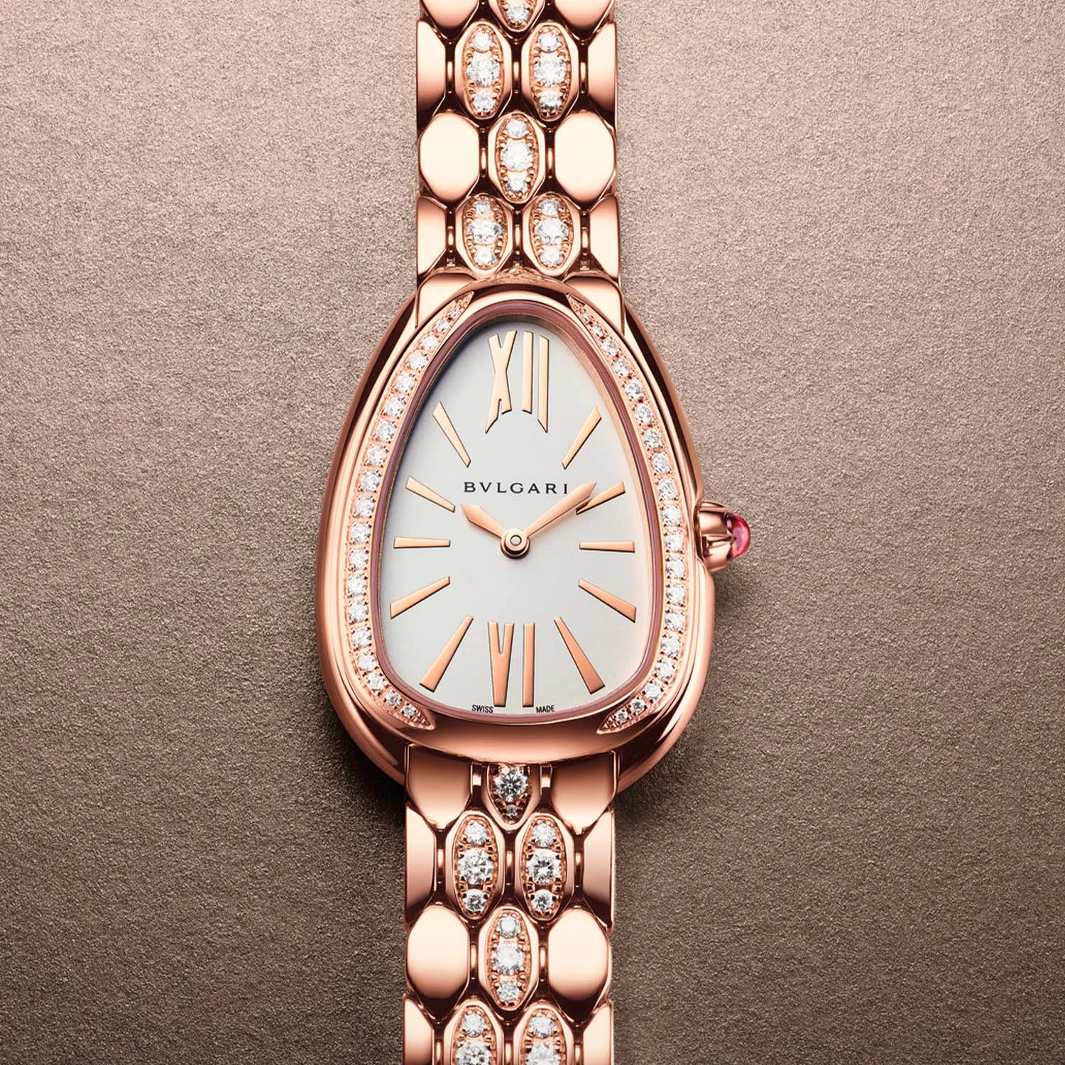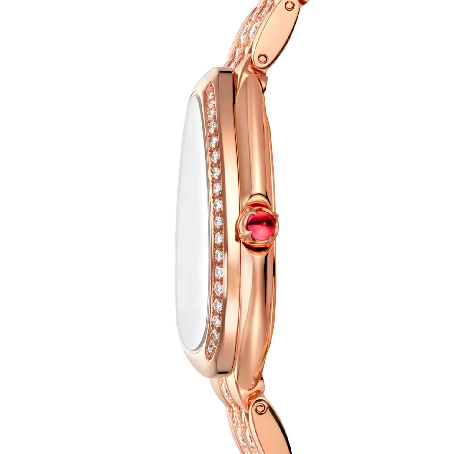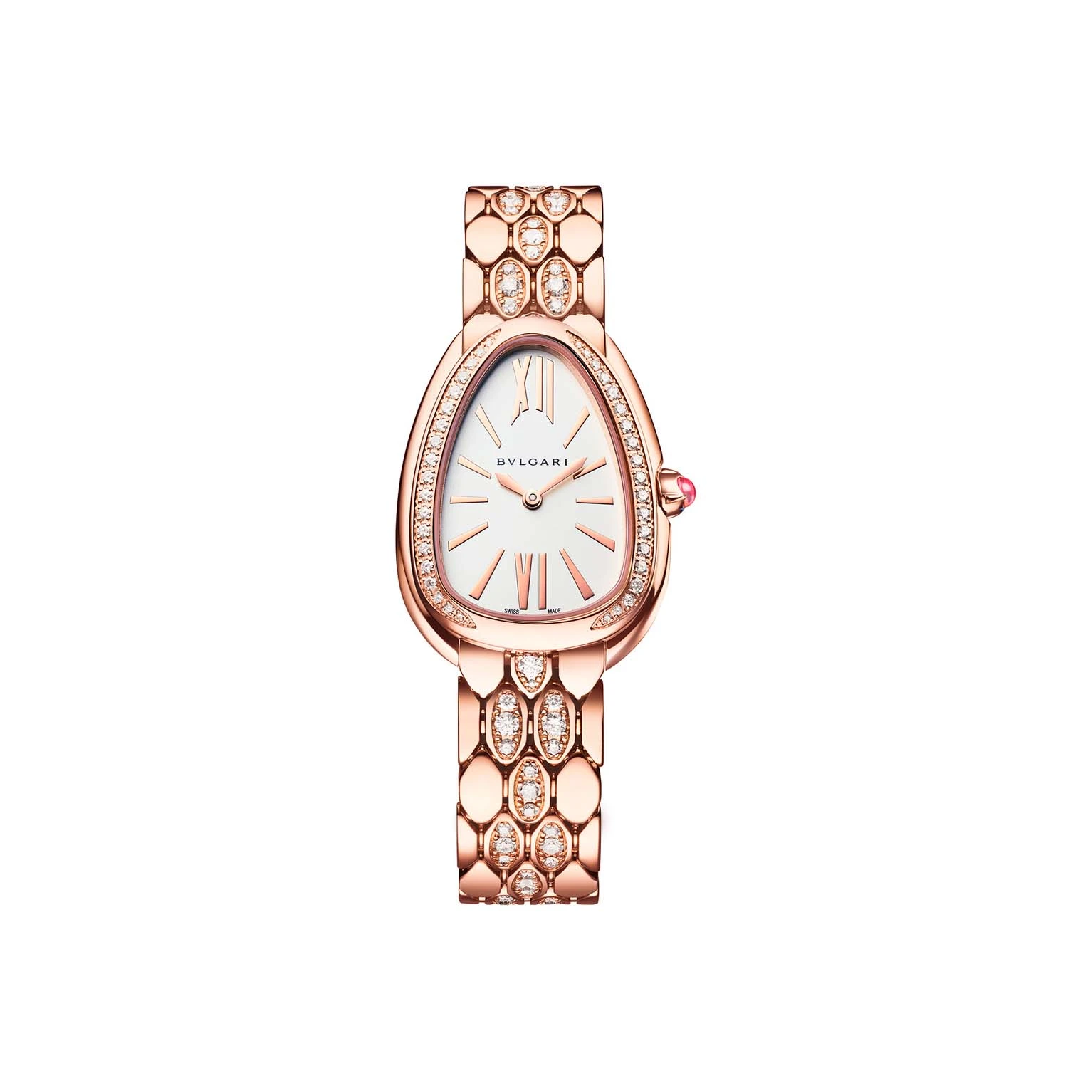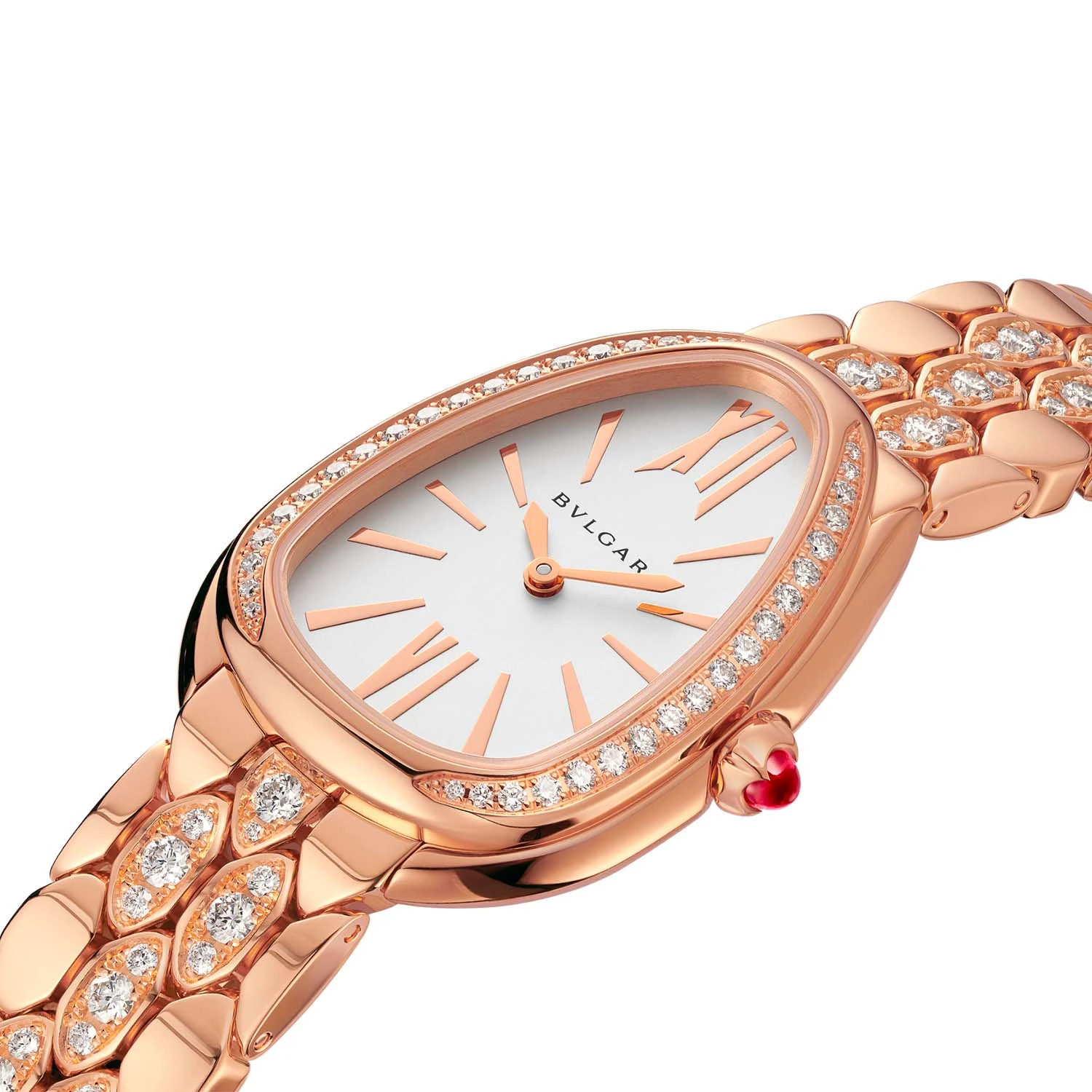 Serpenti Seduttori watch, quartz movement, 18 carat pink gold case 33 mm in diameter set with diamonds, 18 carat pink gold crown set with cabochon-cut pink rubellite, white dial and 18 carat pink gold bracelet set with diamonds. Water resistant up to 30 metres.