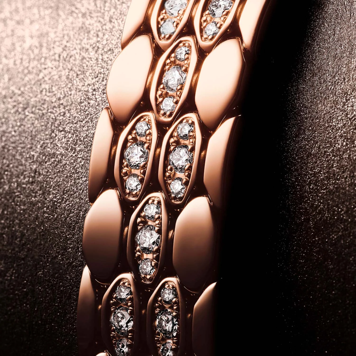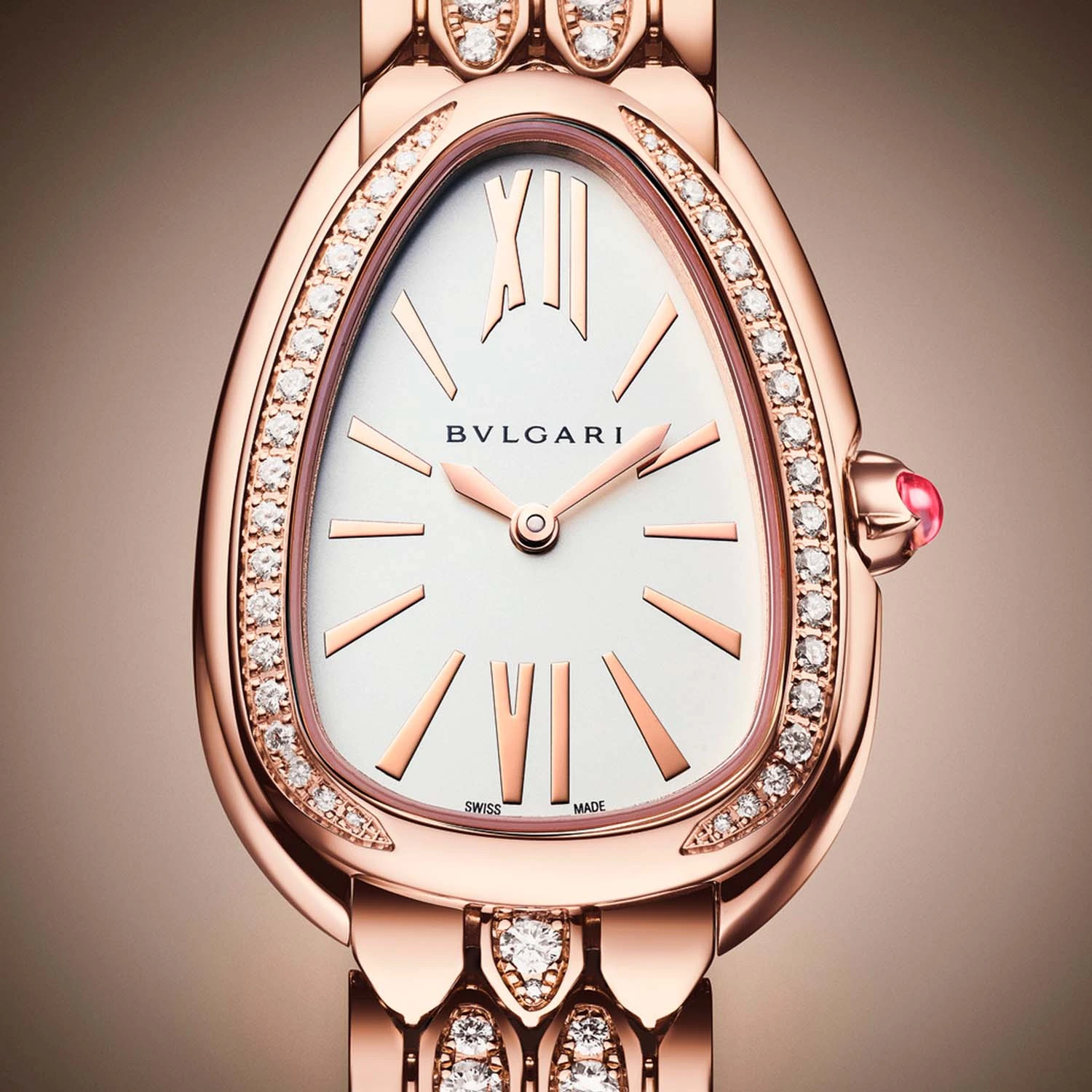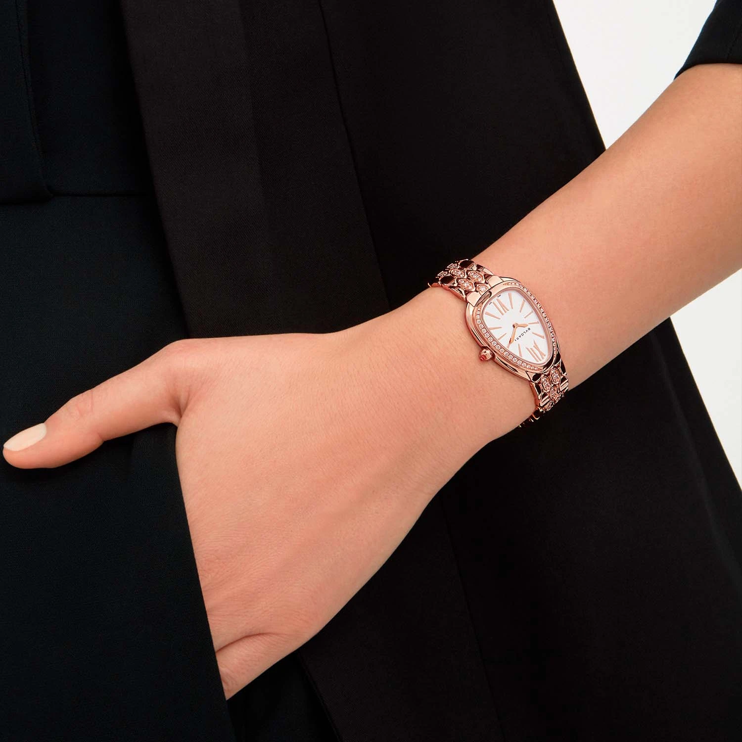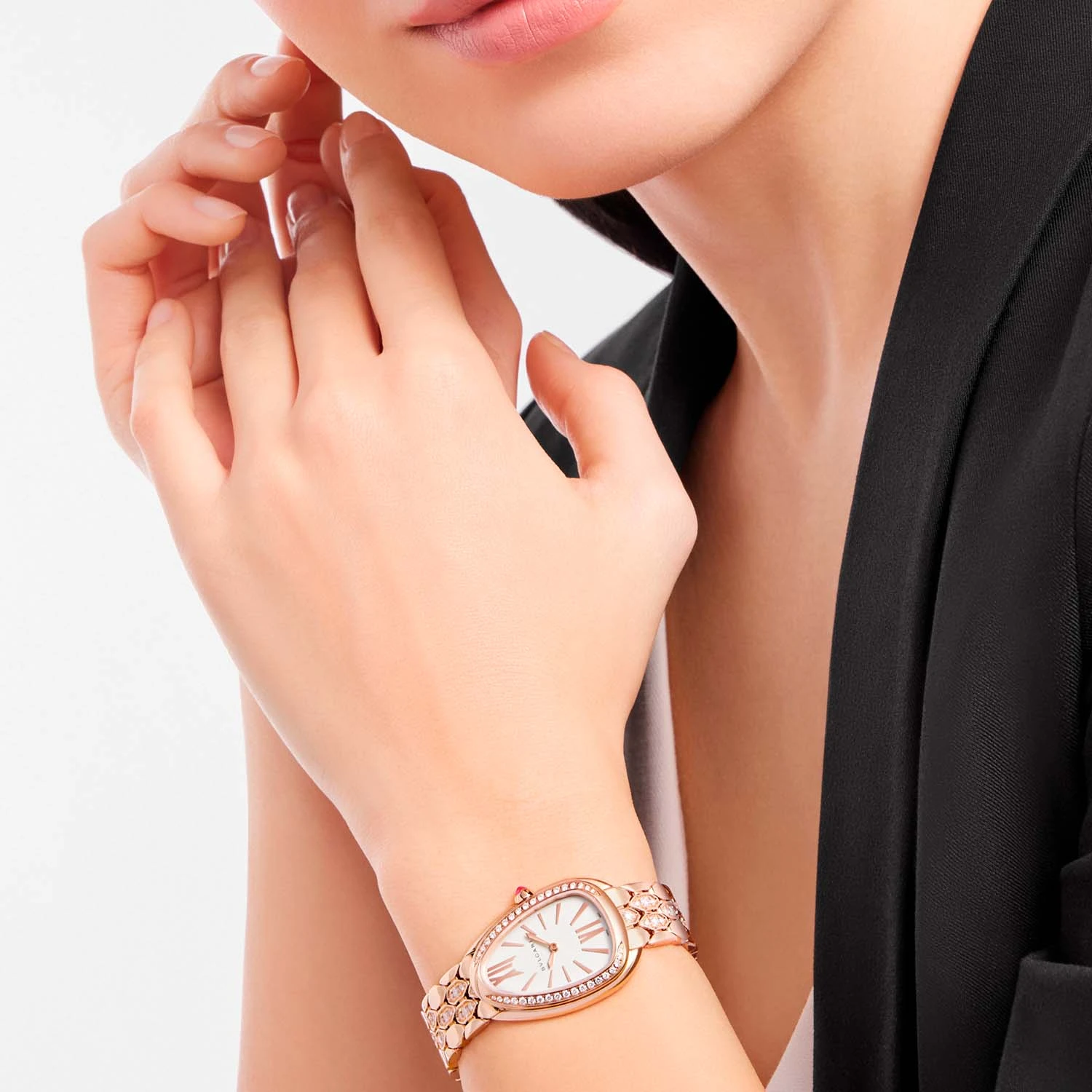 Serpenti Seduttori watch, quartz movement, 18 carat pink gold case 33 mm in diameter set with diamonds, 18 carat pink gold crown set with cabochon-cut pink rubellite, white dial and 18 carat pink gold bracelet set with diamonds. Water resistant up to 30 metres.
