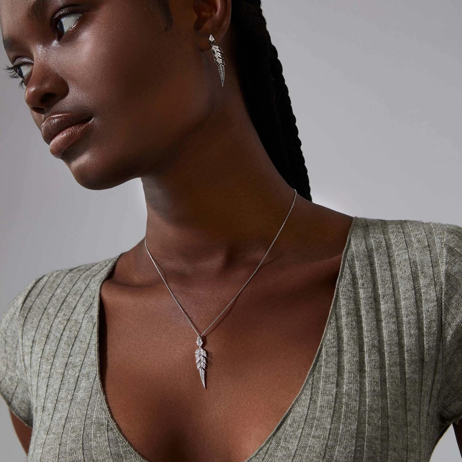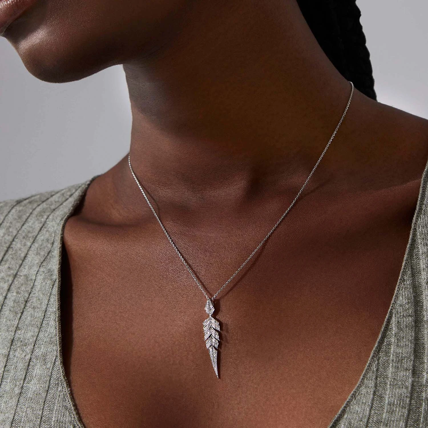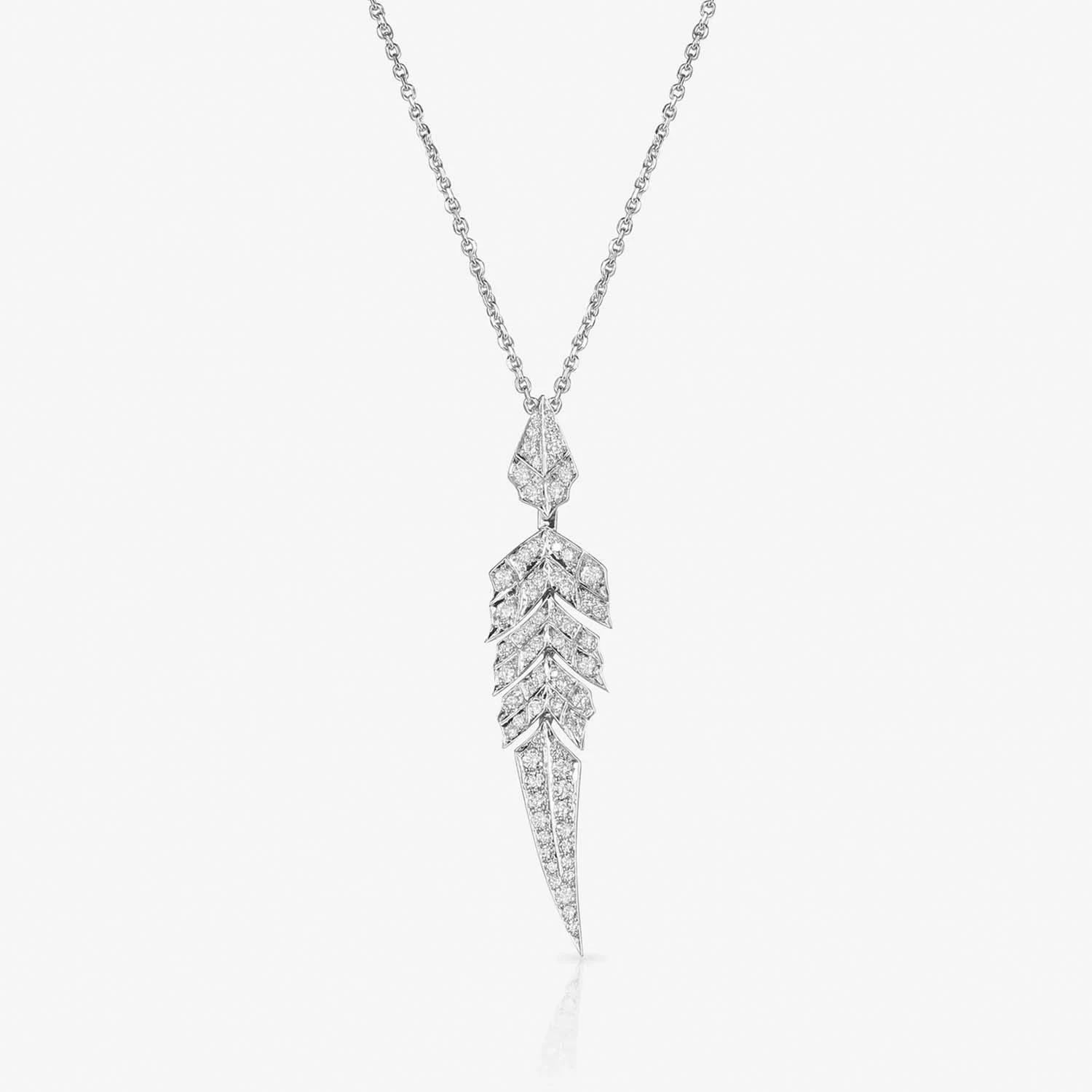 18 carat white gold necklace with diamond pave setting. In the centre, a pendant symbolising the tail and feathers of a pheasant, encrusted with diamonds. The length of the chain is 43.18 cm. The length of the pendant is 40mm, the width of the pendant is 9.4mm. Total weight 4.71g.