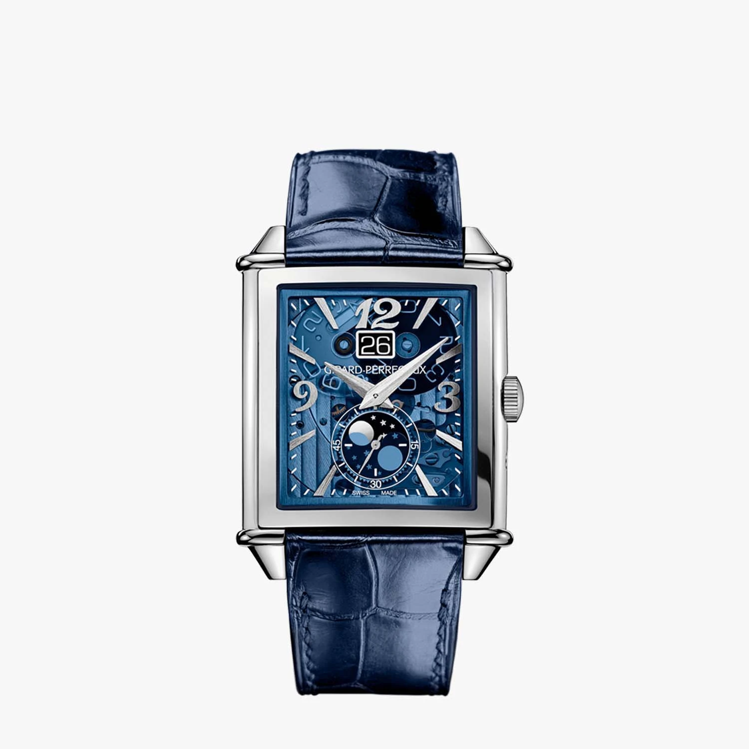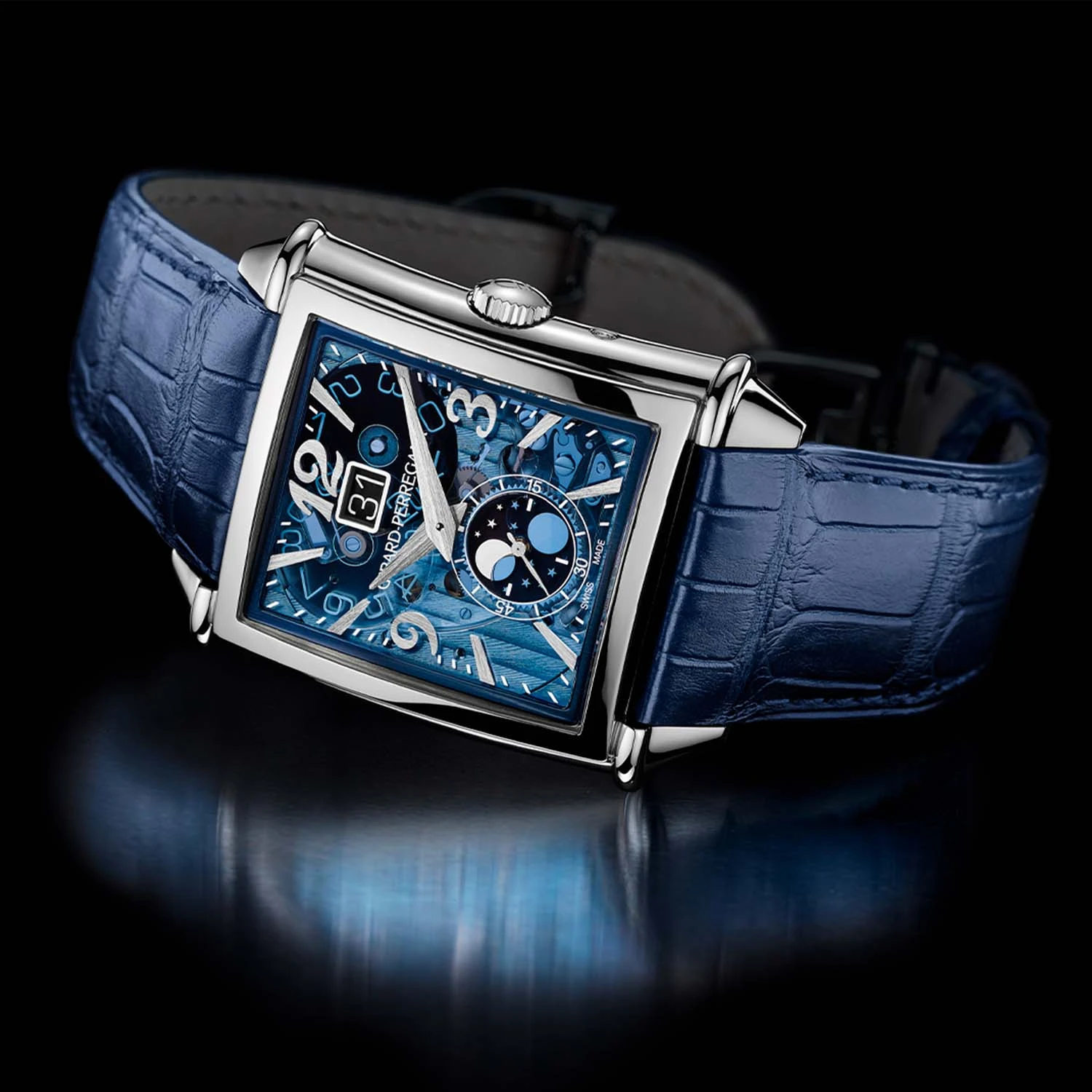 Vintage 1945 XXL Large Date and Moon Phases watch, automatic winding movement, case size 36.10*35.25 mm, thickness 11.74 mm, stainless steel case, sapphire crystal case back, polycrystalline dial, alligator strap, water resistance 30 m. Functions: hours, minutes, seconds, date, moon phase indication.