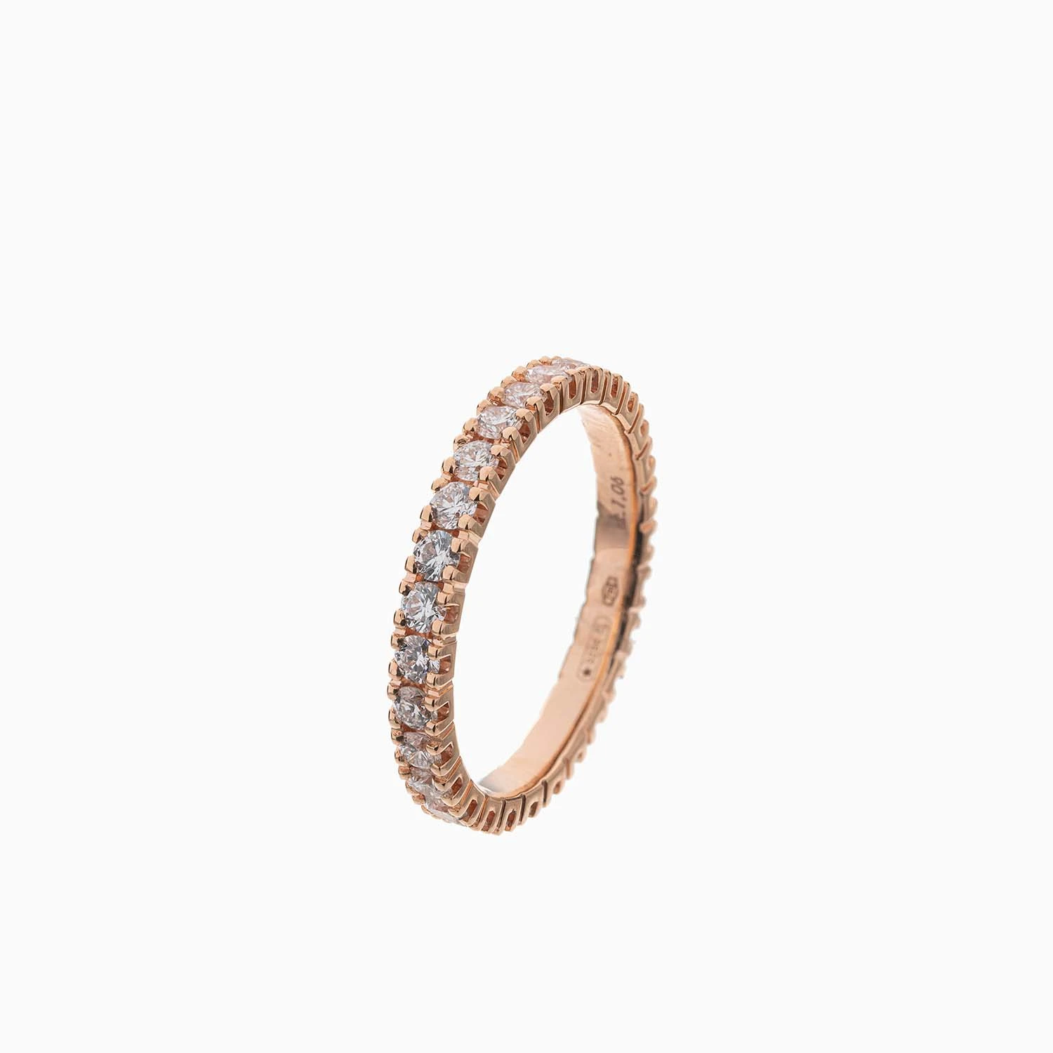 Кольцо из 18-каратного розового золота, полностью усыпанное бриллиантами и носящее название "Вечность", является идеальным выбором для обручального кольца. Оно олицетворяет бесконечную любовь и вечную красоту. Общий вес изделия 2,05 гр.