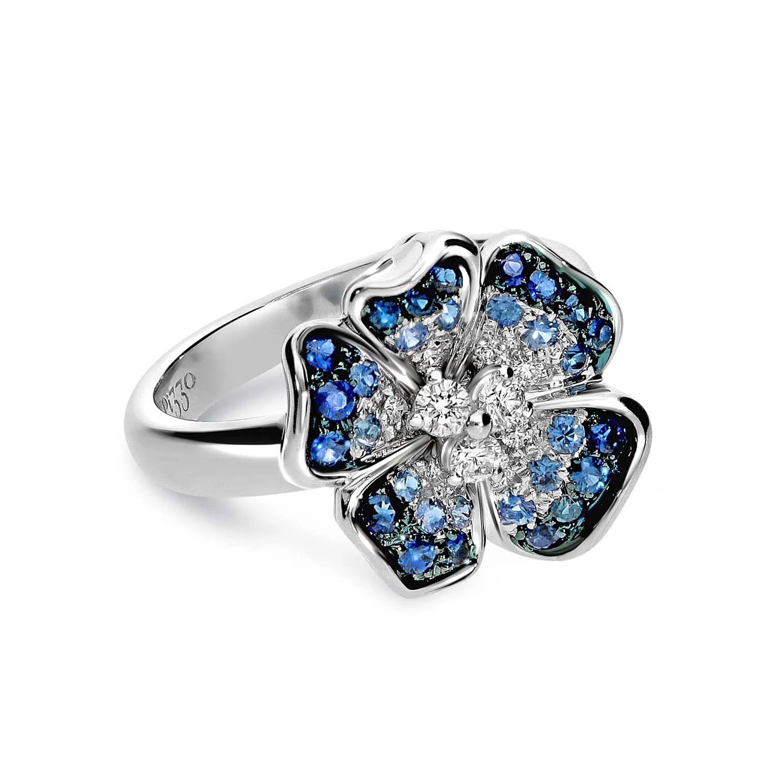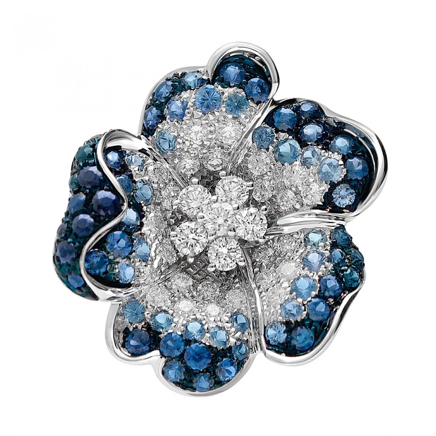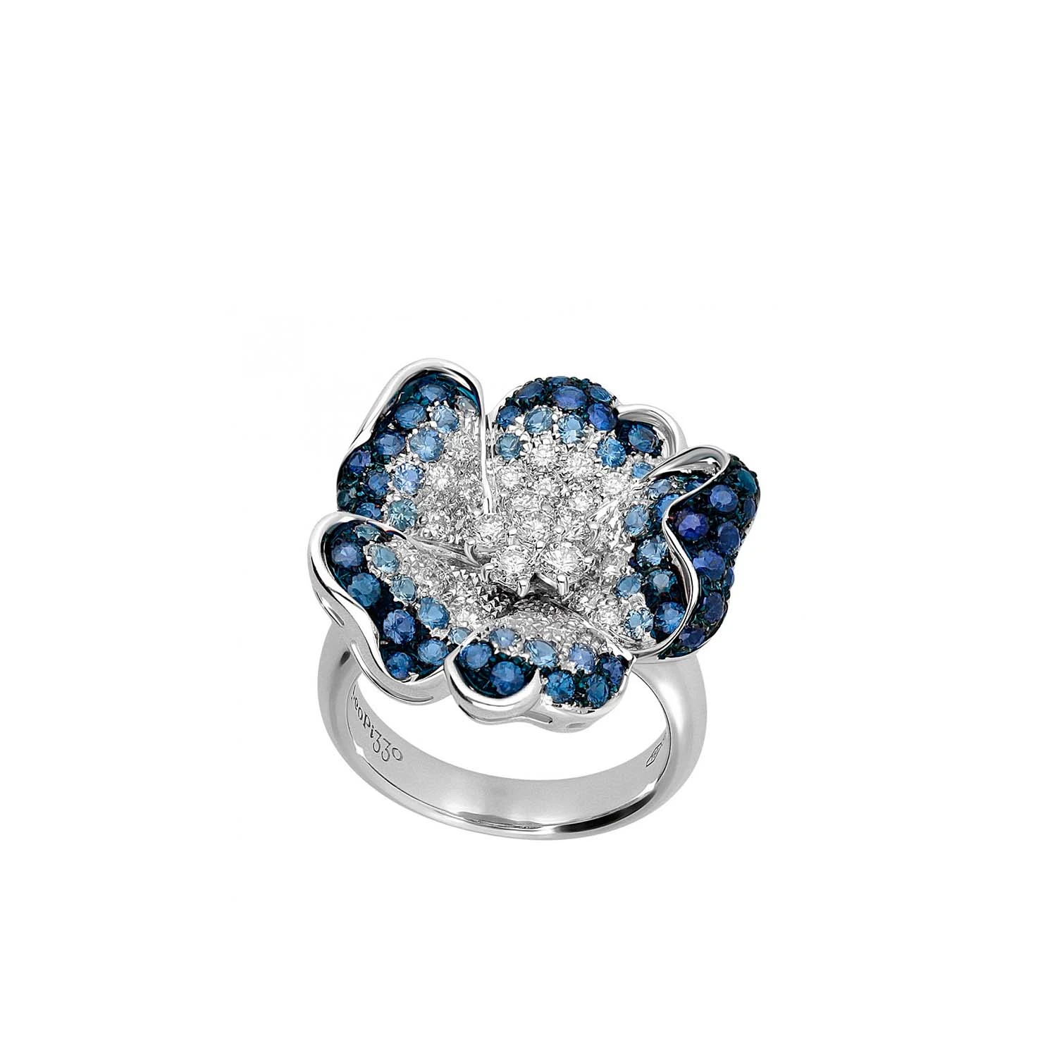 Кольцо Flora из 18-каратного белого золота с бриллиантами и сапфирами. Дизайн вдохновлён итальянскими садами, где природа раскрывается в симфонии цвета. Характерные мотивы коллекции подчёркивают вечное совершенство природы и придают изделию утончённую, гармоничную выразительность. Вес золота: 7,45 г.