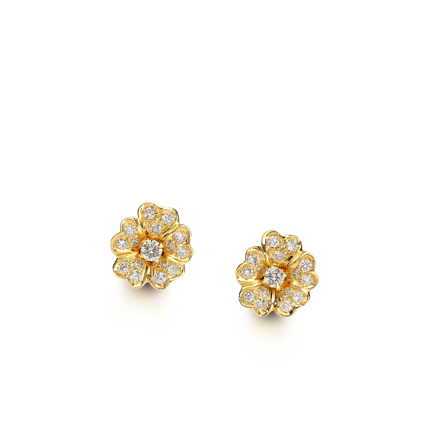 Серьги из 18-каратного жёлтого золота с бриллиантовым цветочным мотивом. Сияющий цветок становится эффектным акцентом, а плавные контуры лепестков подчёркивают утончённость формы и природное происхождение образа. Вес золота: 3,32 г.