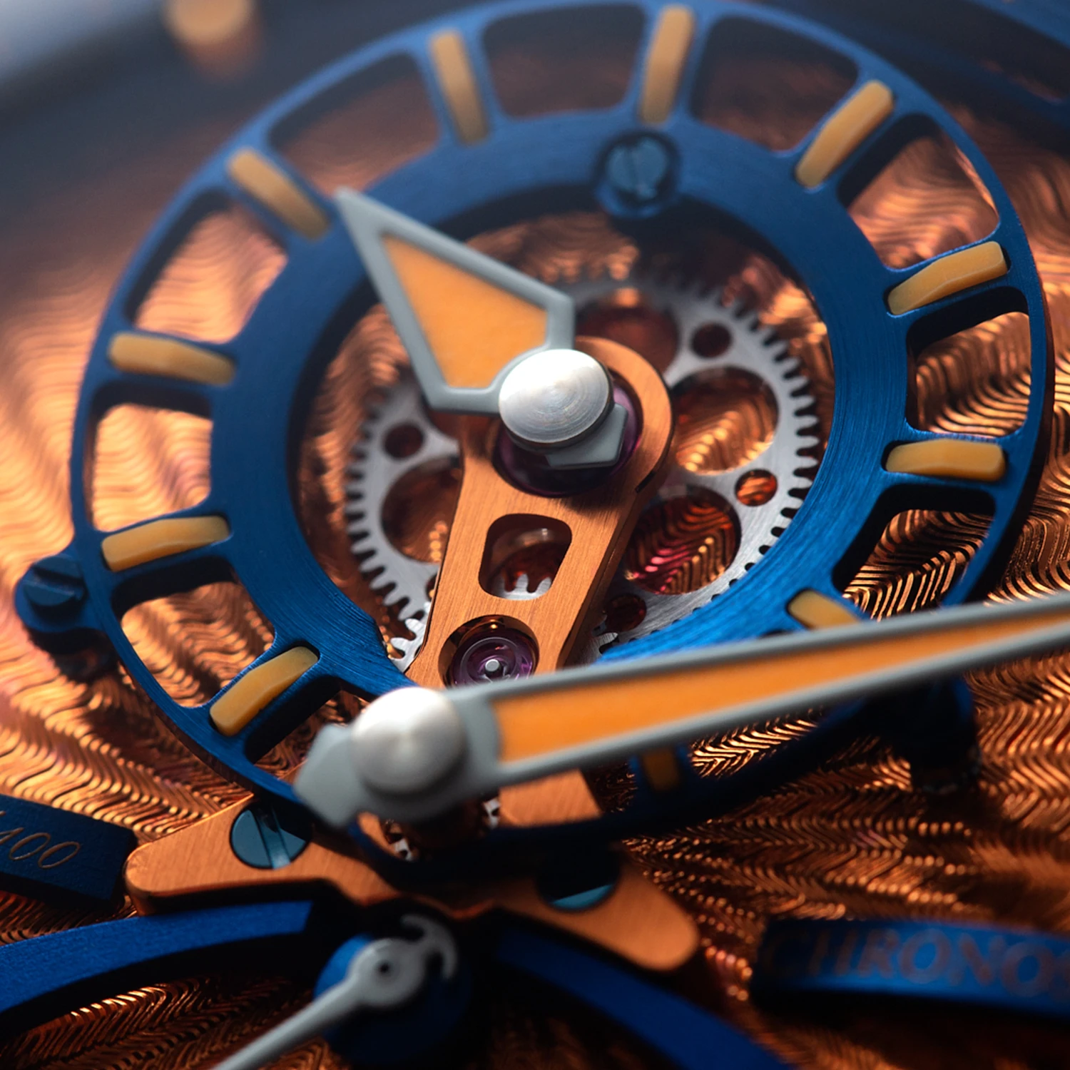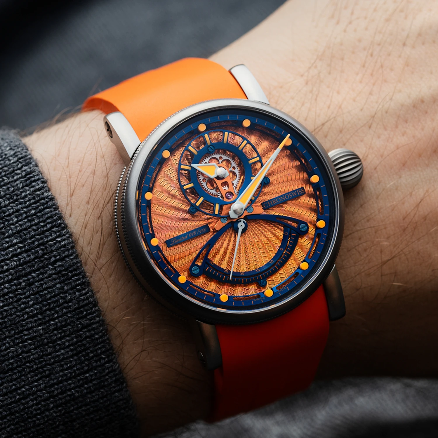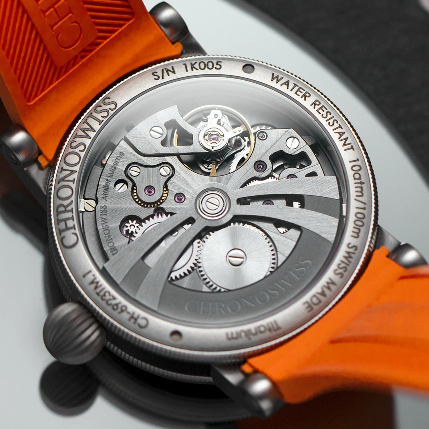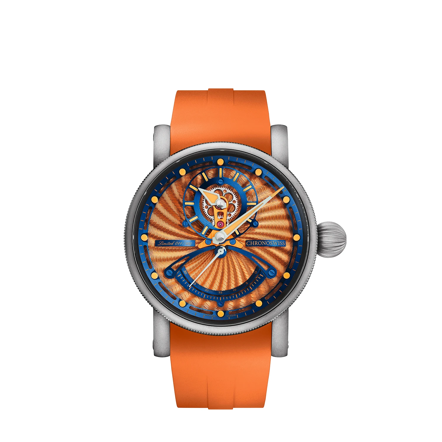 Часы ReSec Helium Manufacture, мануфактурный механизм с автоматическим заводом, корпус диаметром 42 мм из титана, безель из титана, гильошированный вручную циферблат с сияющим оранжевым цветом, открытый механизм, выпуклое сапфировое стекло с антибликовым покрытием, прозрачная задняя крышка, ремешок каучук. Функции: часы, минуты, секунды. Запас хода 55 часов. Водонепроницаемость 100 м. Лимитированная серия из 100 экземпляров.
