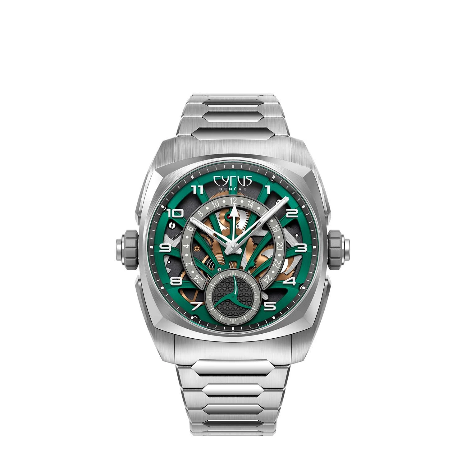 Часы Klepcys GMT Palm Green, мануфактурный механизм с автоматическим заводом, корпус диаметром 42 мм выполнен из полированного титана, циферблат с открым ажурным мостом в цвете Palm Green, индикаторы часов - арабские цифры на сапфировом стекле с антибликовым покрытием, две заводные головки, титановый браслет. Водонепроницаемость 100 м. Лимитированная серия из 38 экземпляров.