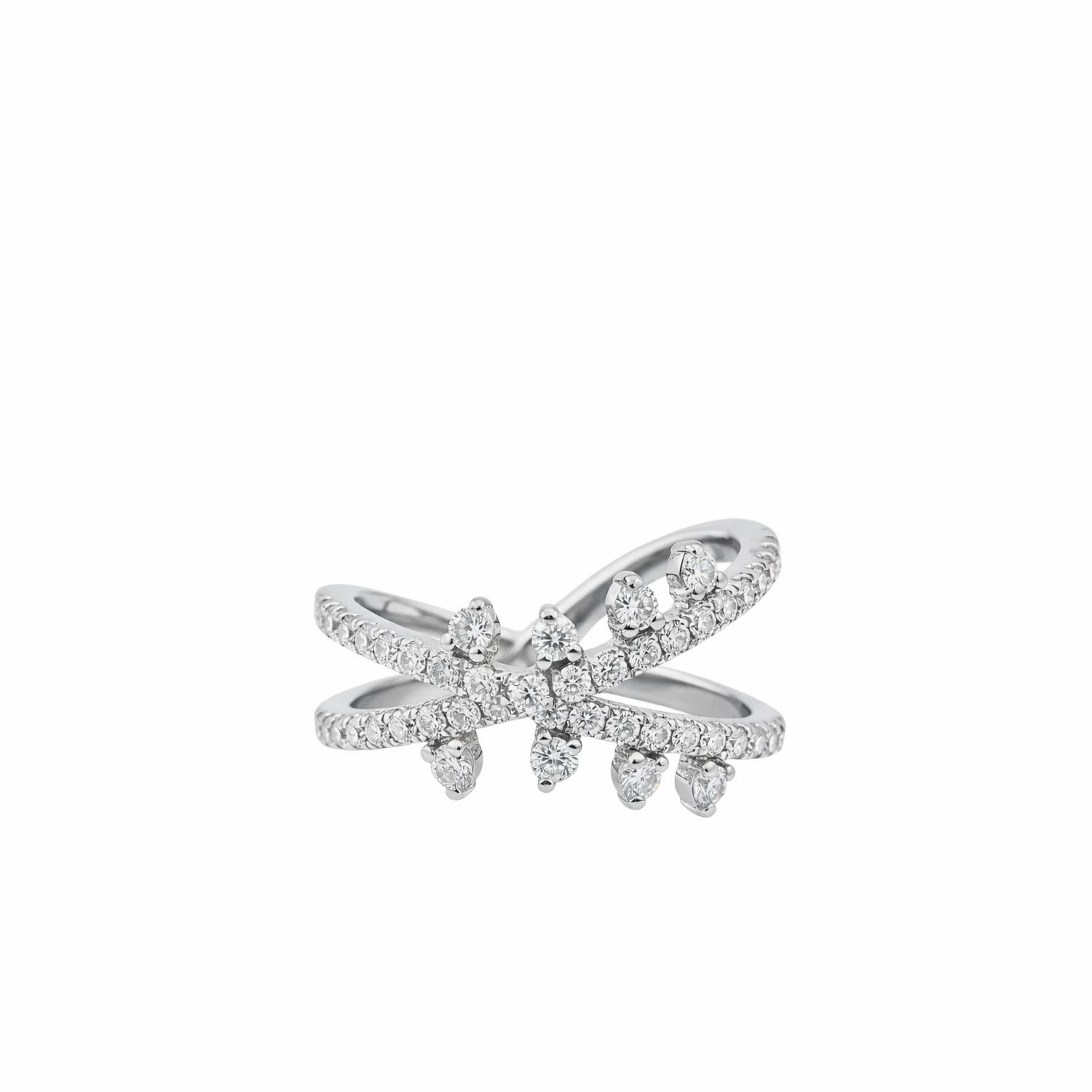 Кольцо из 18-каратного белого золота с бриллиантами. Изящный дизайн с перекрещивающимися линиями, украшенными бриллиантами, дополнен акцентами в виде маленьких «лепестков». Лёгкая, воздушная композиция подчёркивает женственность и создаёт деликатное сияние. Вес золота: 3,41