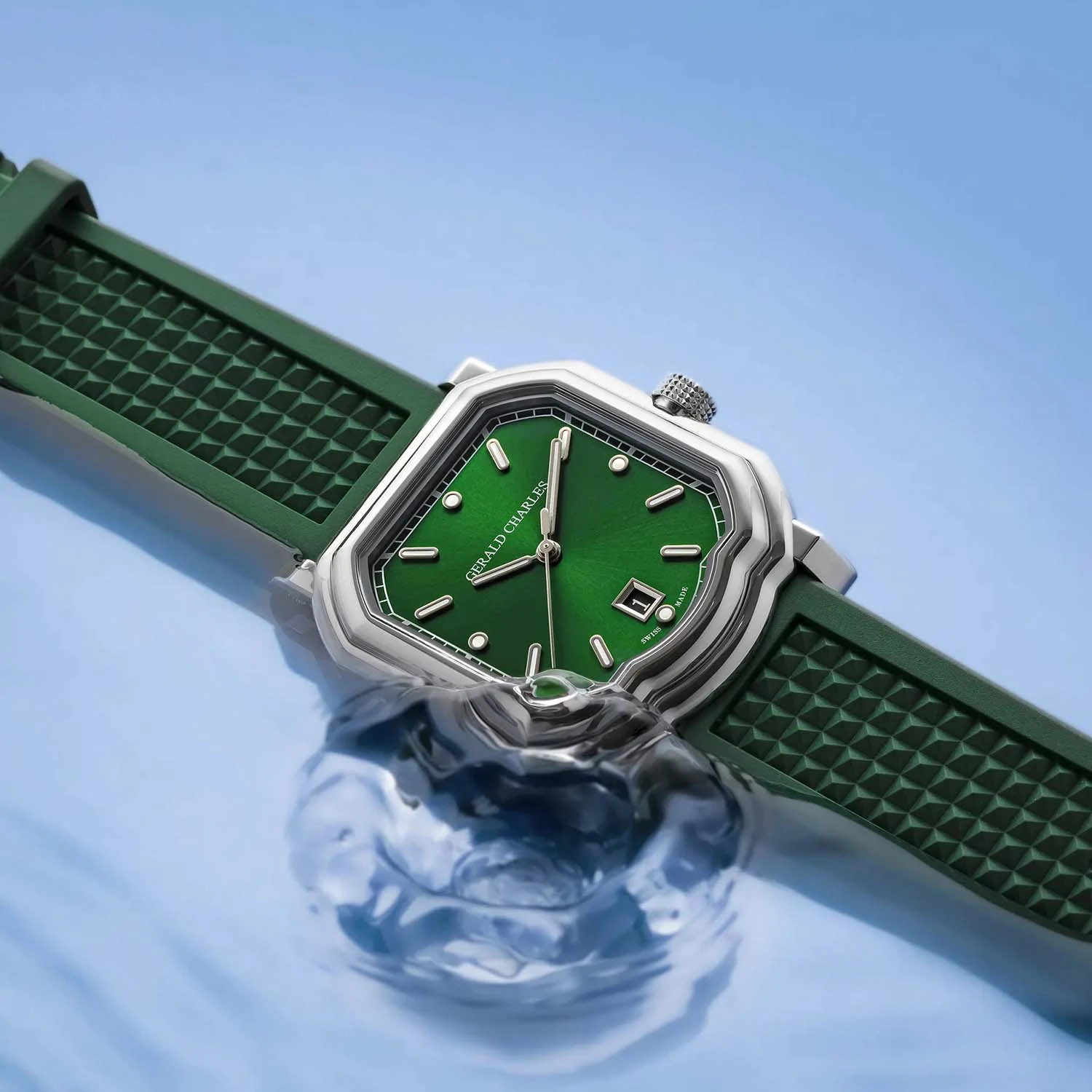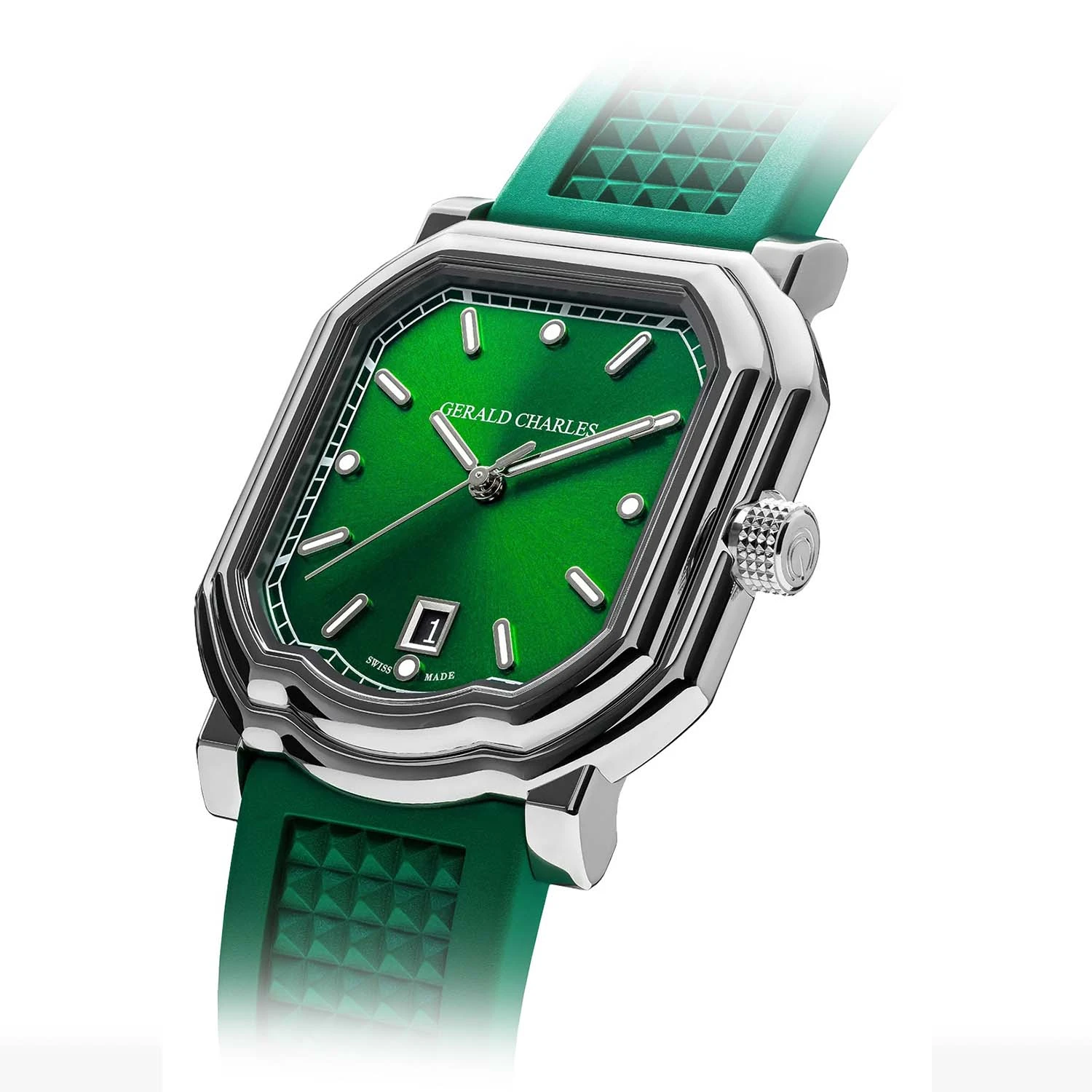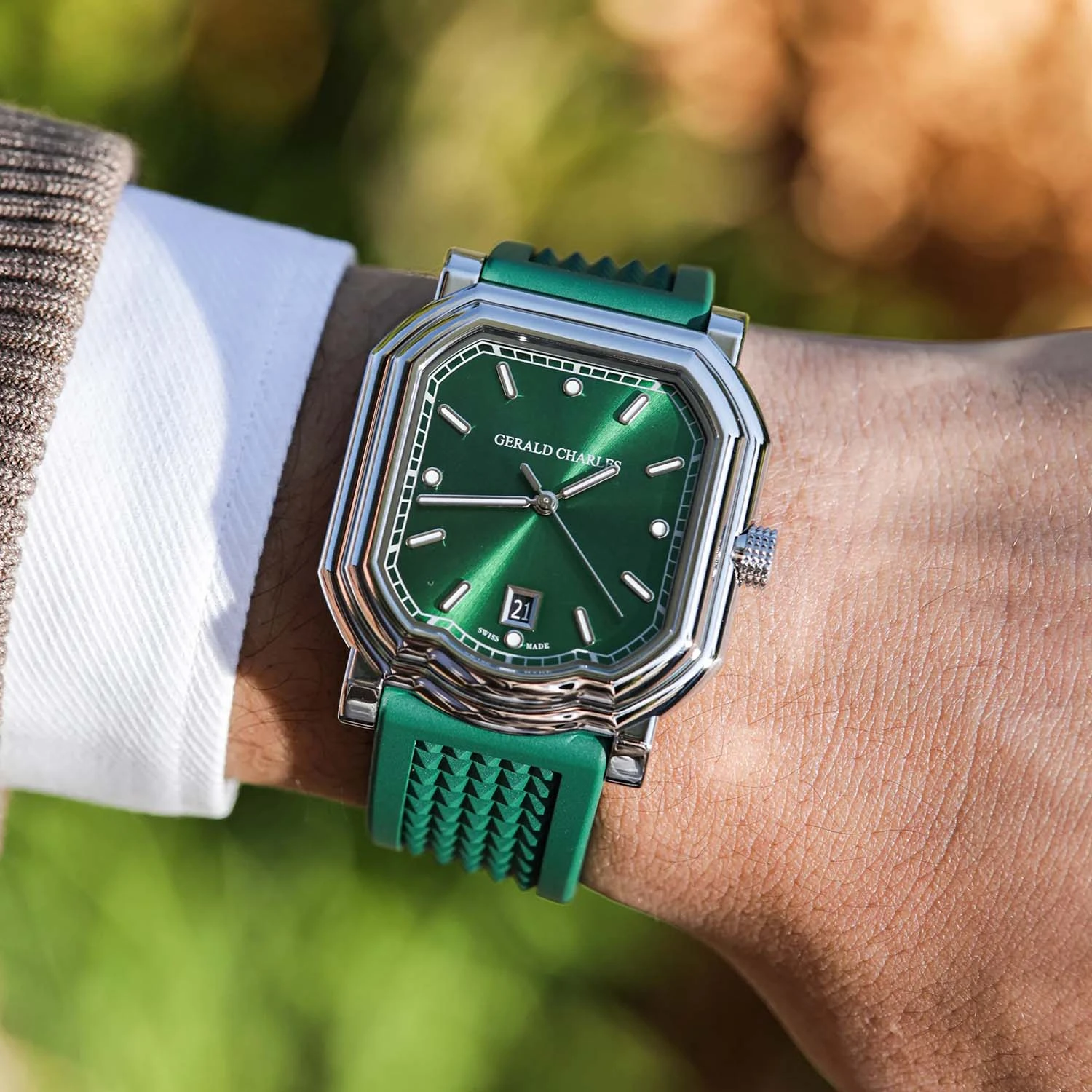 Часы Maestro 2.0 Ultra Thin, мануфактурный механизм с автоподзаводом, корпус диаметром 39x41,7 мм из отполированной вручную стали, задняя крышка из стали с вертикальной полировкой, черный циферблат с узором "солнечные лучи", накладные часовые индексы с белым люминисцентным составом SuperLuminova и зеленым свечением в темное время суток, сапфировое стекло, зеленый каучуковый ремешок с узором Clous de Paris. Функции: часы, минуты, секунды, дата. Запас хода 50 часов. Водонепроницаемость 100.