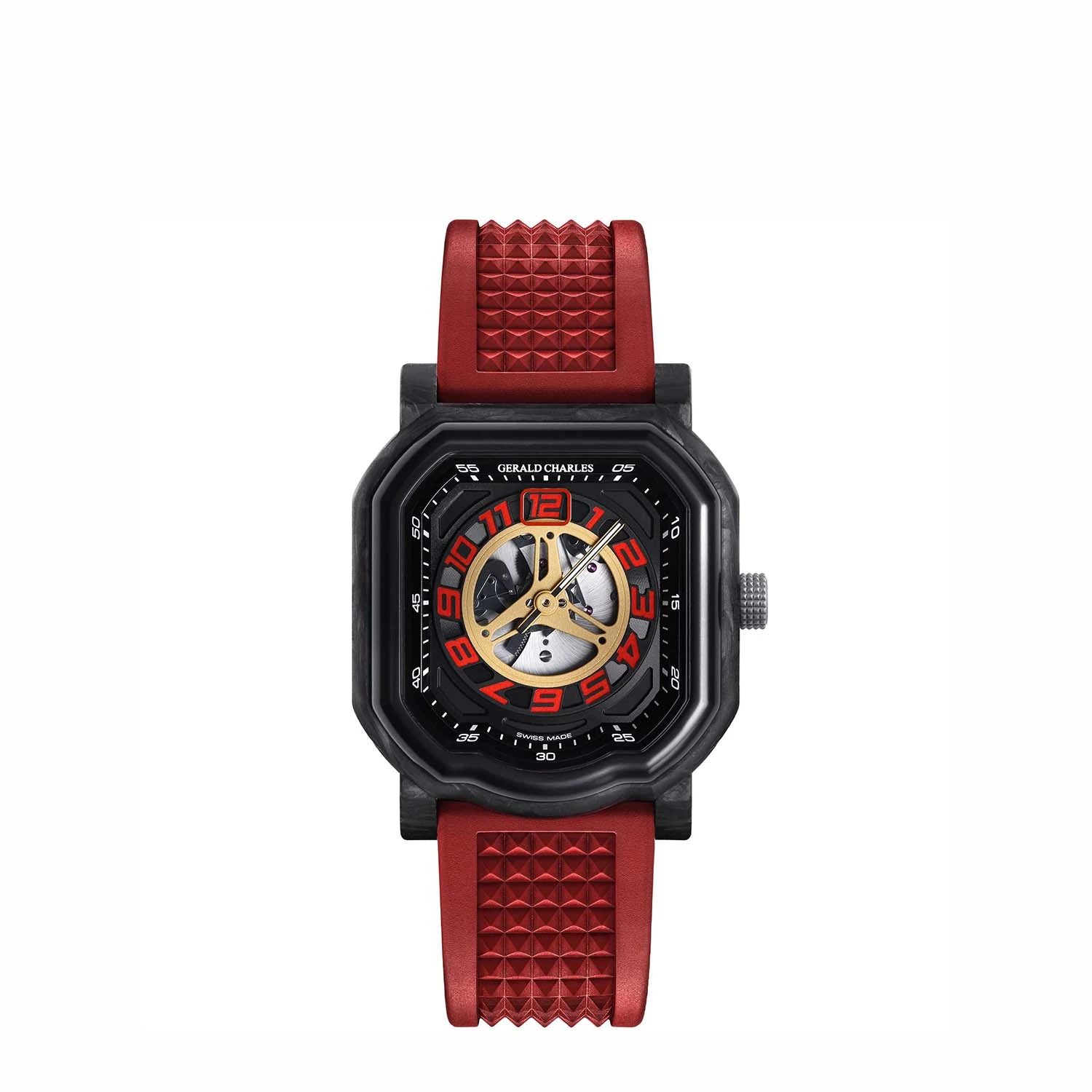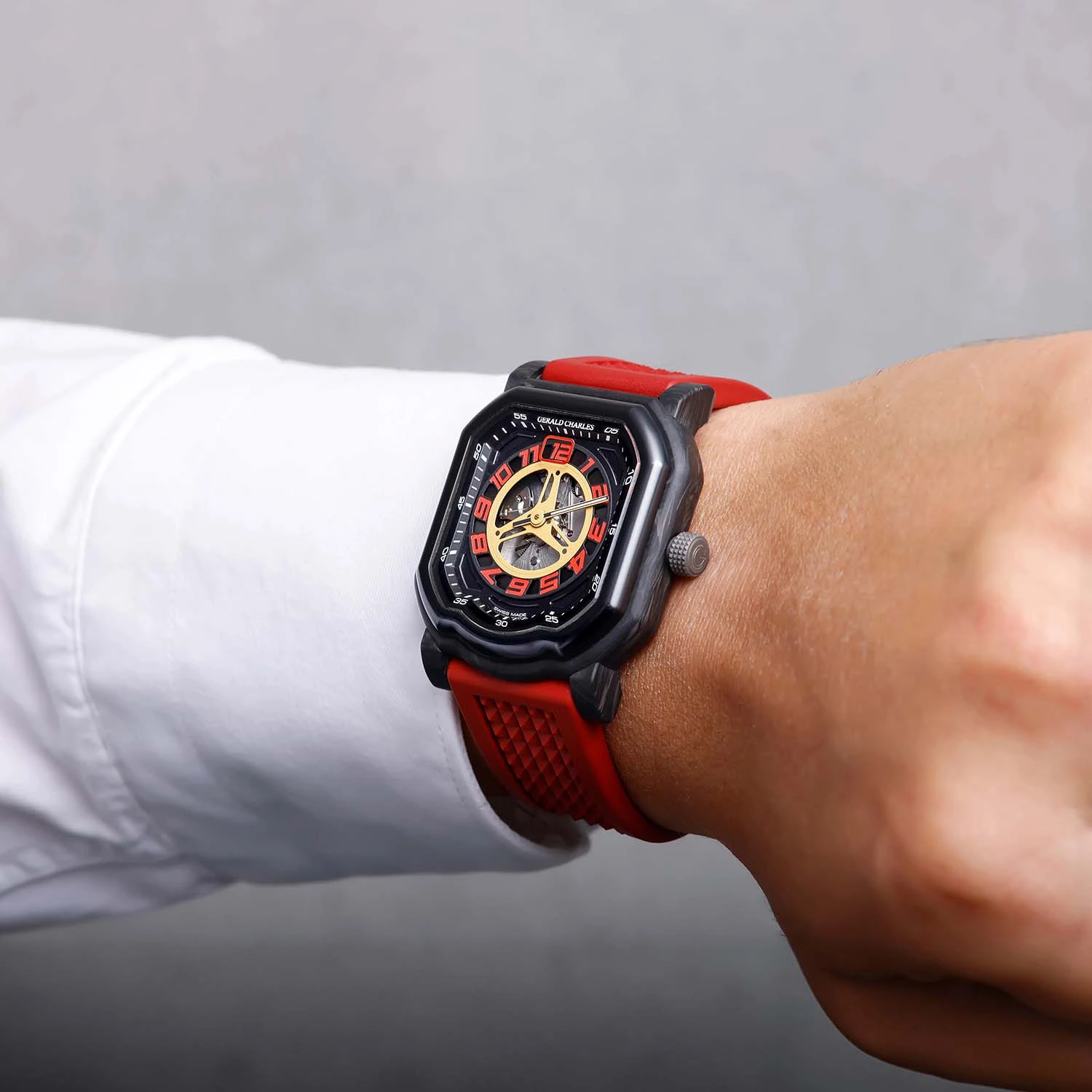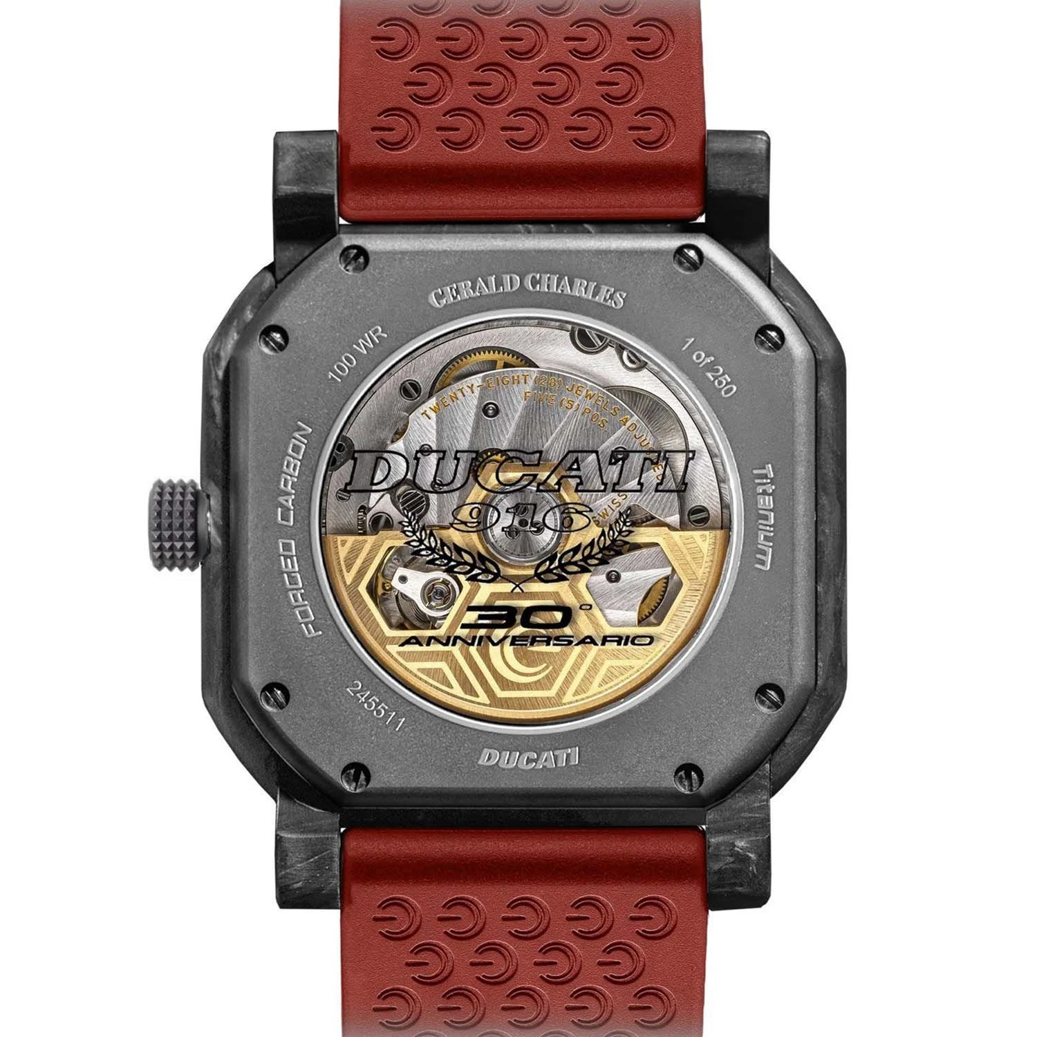 Часы Maestro 4.0 Ducati 30° Anniversario 916 с корпусом из кованого карбона и черным керамическим безелем. Трехуровневый скелетонированный циферблат отсылает к дизайну мотоцикла Ducati 916, центральное колесо напоминает его оригинальный обод. Прыгающий часовой диск вращается против часовой стрелки, отображая все цифры. Минутная стрелка в виде палочки покрыта белым Super-LumiNova® с синей подсветкой.