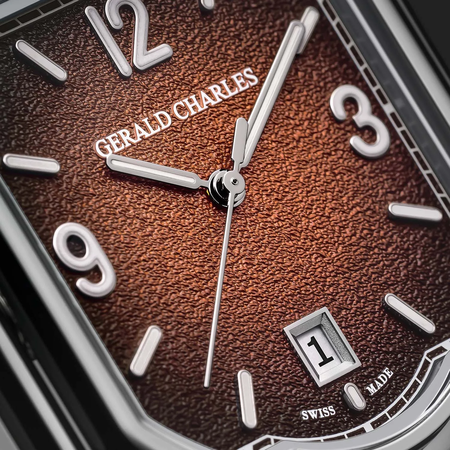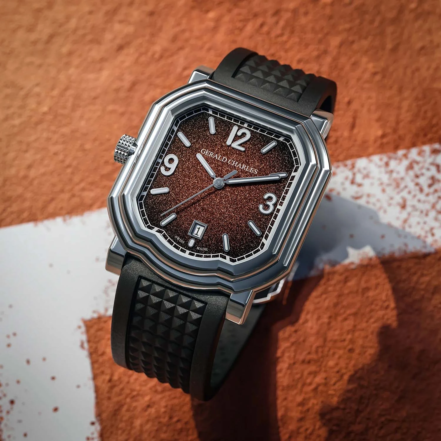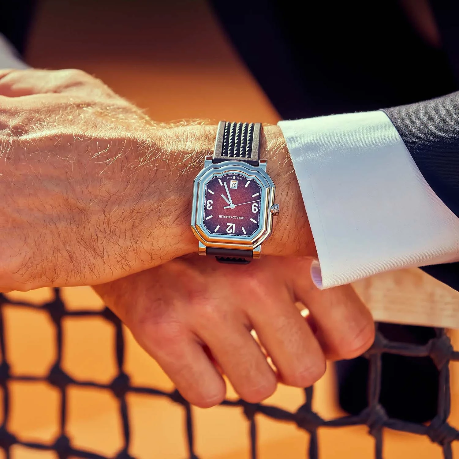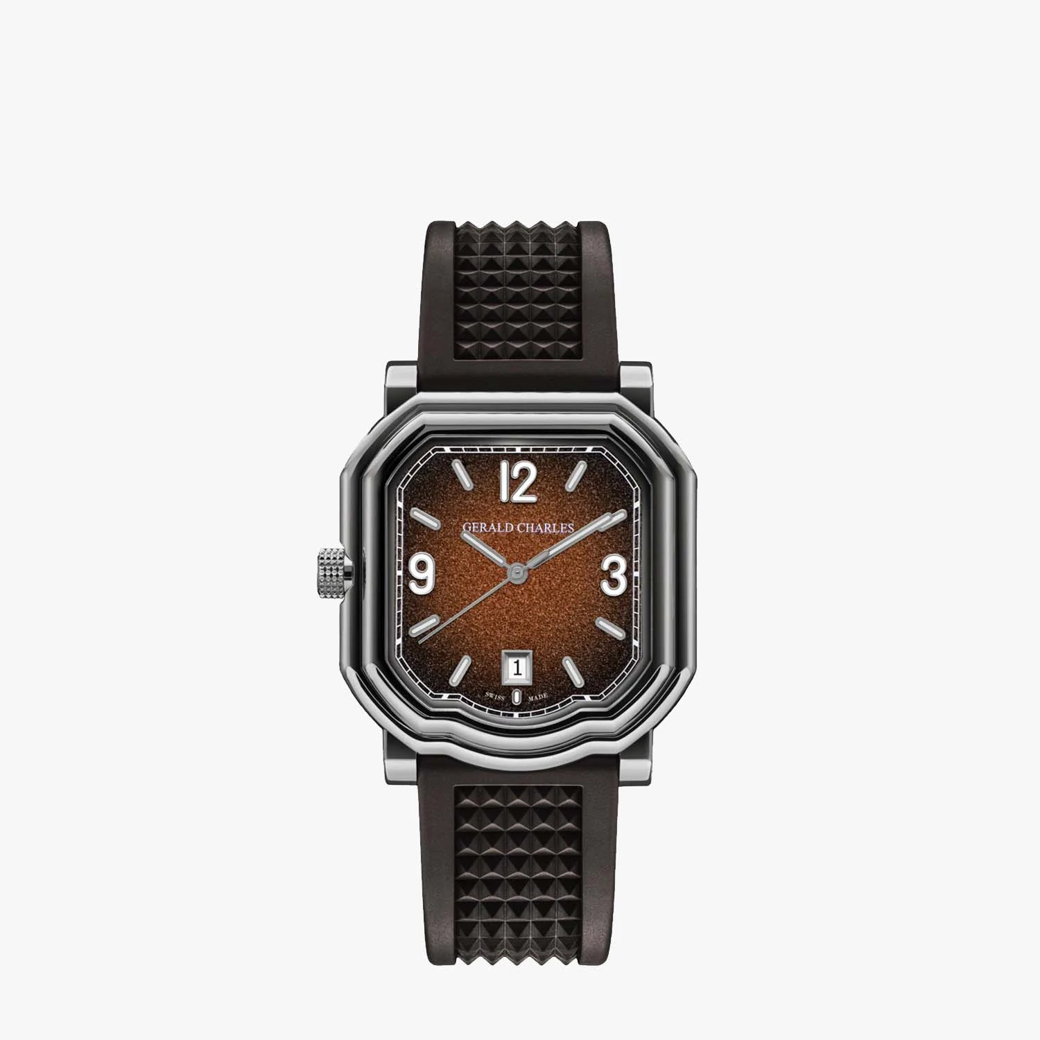 Часы Maestro GC Sport, мануфактурный механизм с автоматическим заводом, корпус диаметром 39х41,7 мм из отполированного вручную титана, задняя крышка с вертикальной полировкой, красновато-коричневый циферблат с нанесенными арабскими цифрами, накладные часовые индексы, заполненные белым люминисцентным составом SuperLuminova и зеленой подсветкой в ночное время, черный каучуковый ремешок с узором Clous de Paris. Функции: часы, минуты, секунды, дата. Запас хода 50 часов. Водонепроницаемость 100 м.