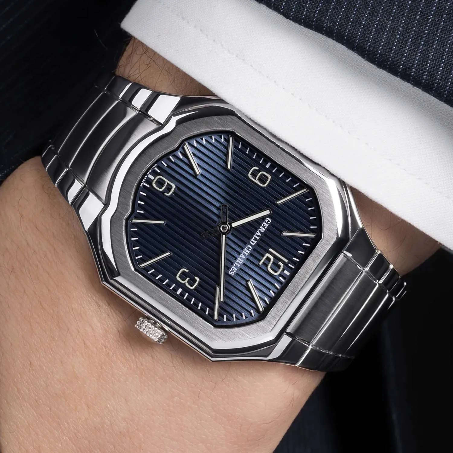 Часы Masterlink Blue, мануфактурный механизм с автоматическим заводом, корпус диаметром 38х38 мм выполненный из стали, интегрированный браслет из стали, синий циферблат с вертикальными полосами. Функции: часы, минуты, секунды. Запас хода 50 часов. Водонепроницаемость 100 м.