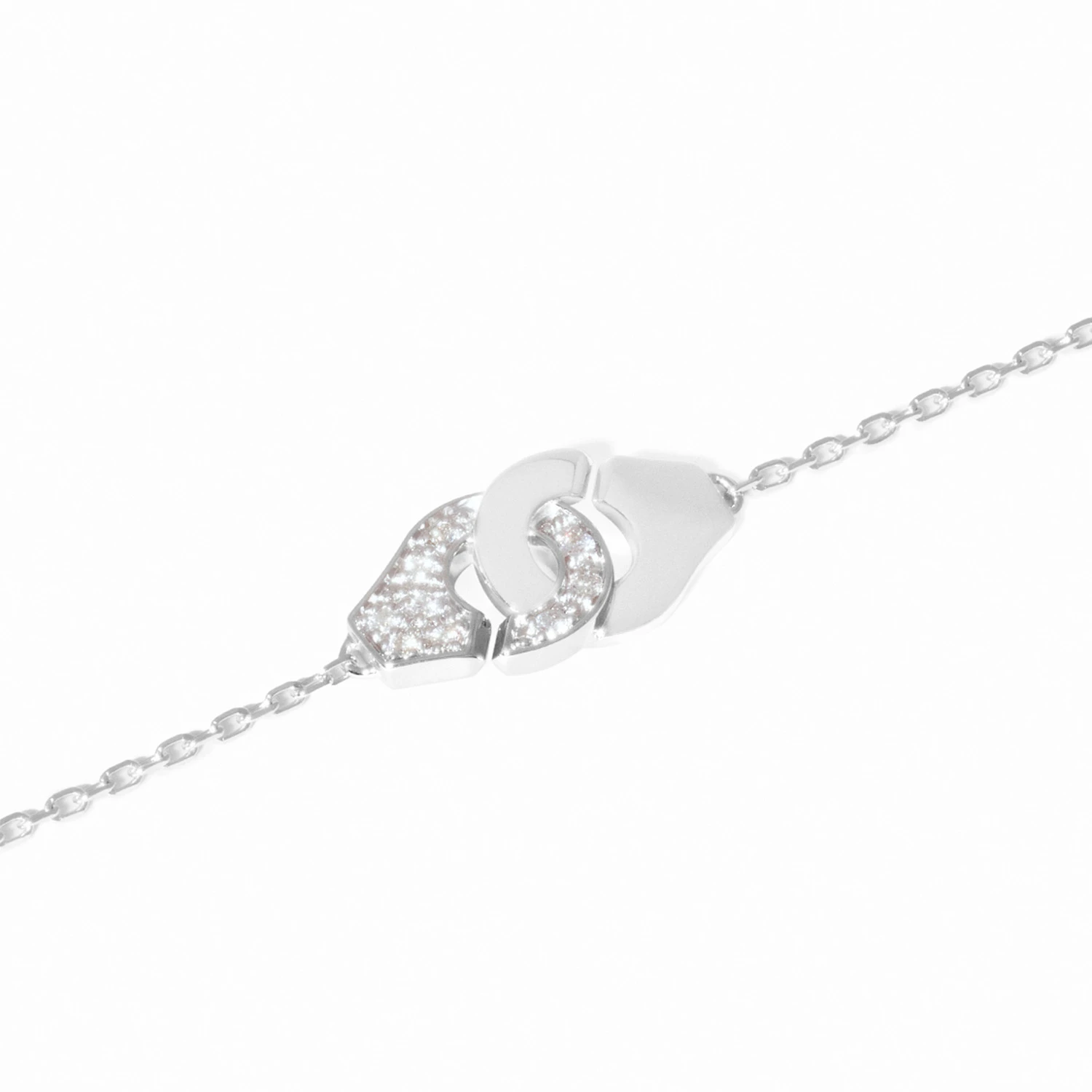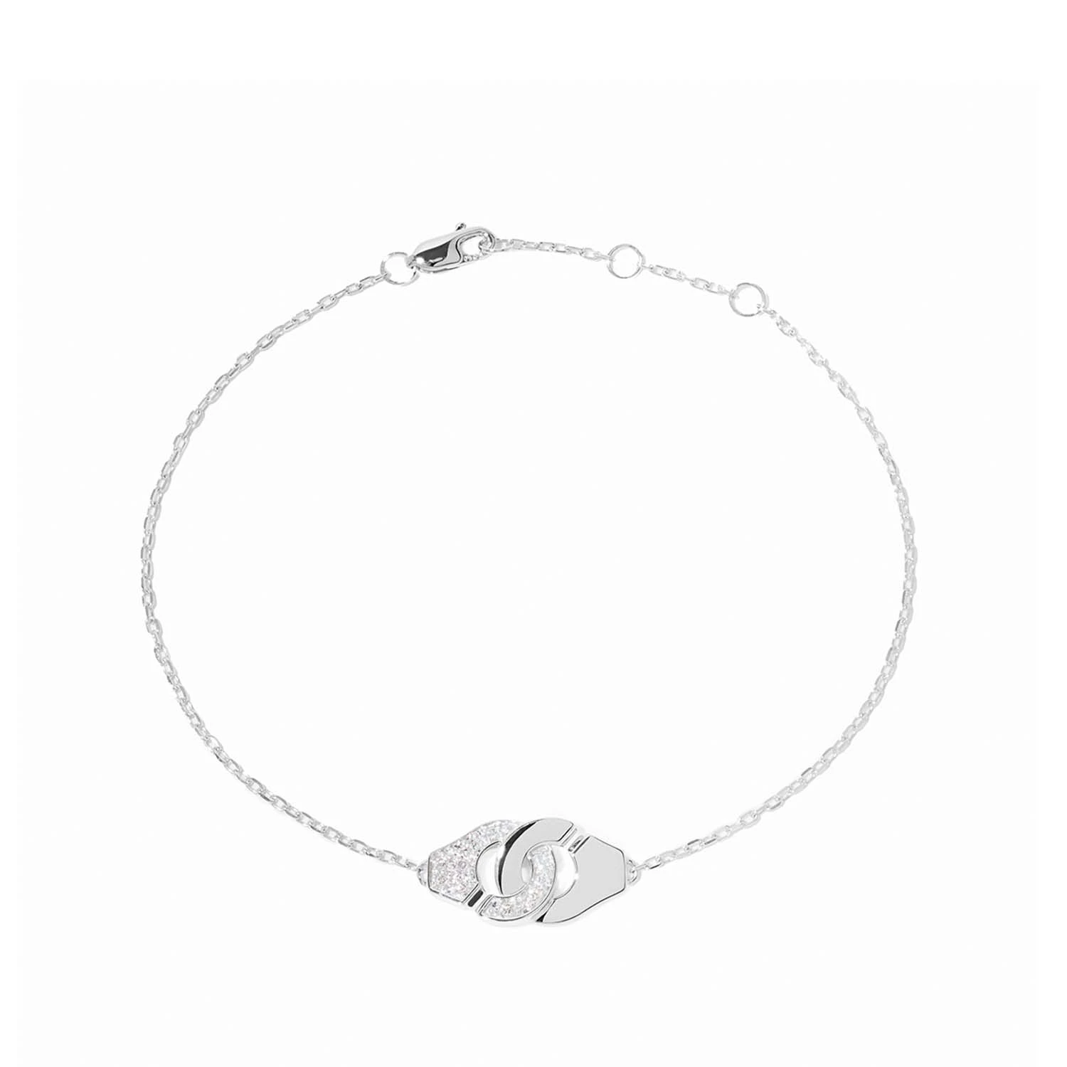 Браслет из белого золота 18 карат с бриллиантами. Мотив Menottes воплощён на тонкой цепочке, а фирменная застёжка, превращённая в декоративный элемент, украшена деликатной бриллиантовой инкрустацией. Контраст сияния белого золота и блеска камней создаёт ощущение современной и сдержанной элегантности. Украшение символизирует драгоценную и нежную связь. Длина: 17 см.