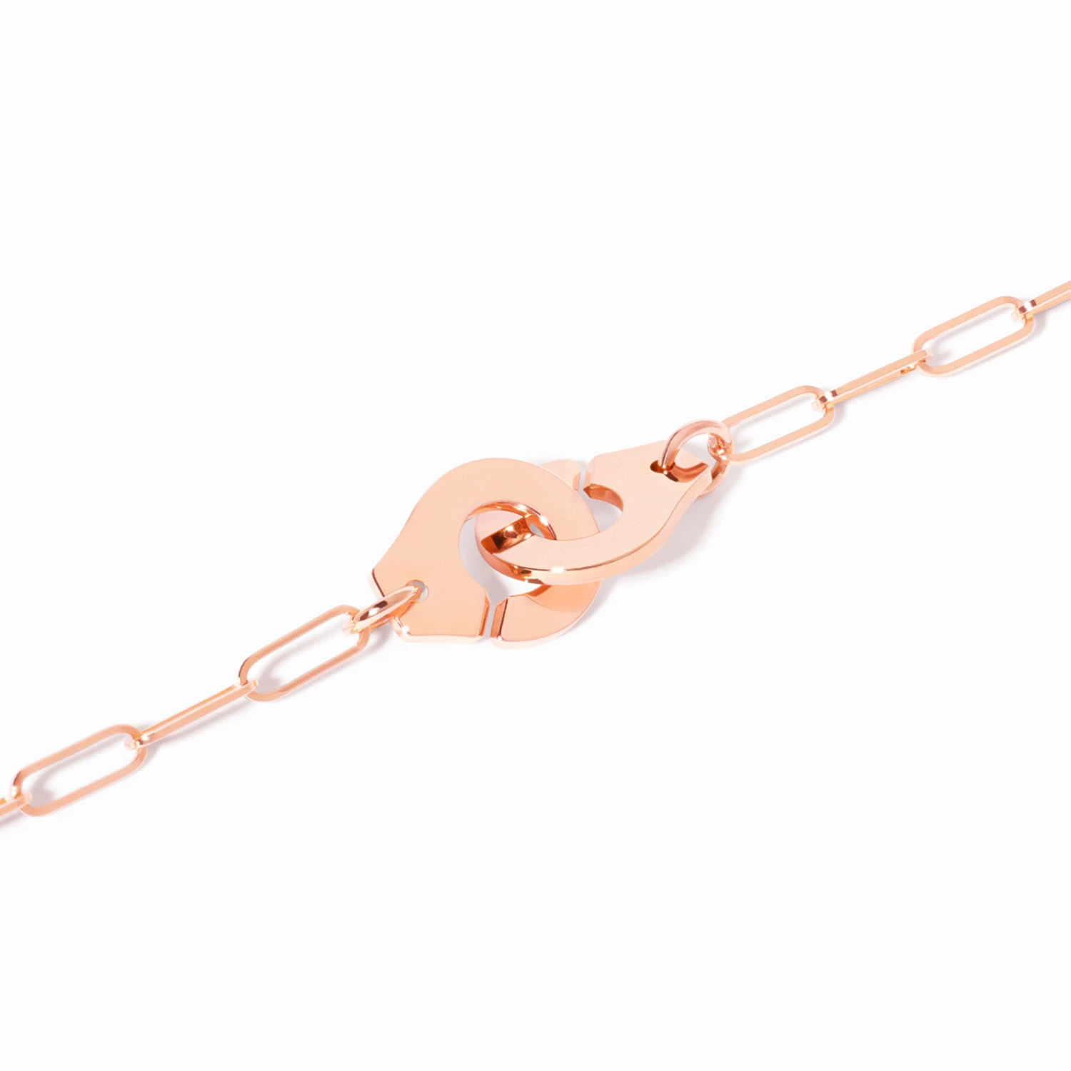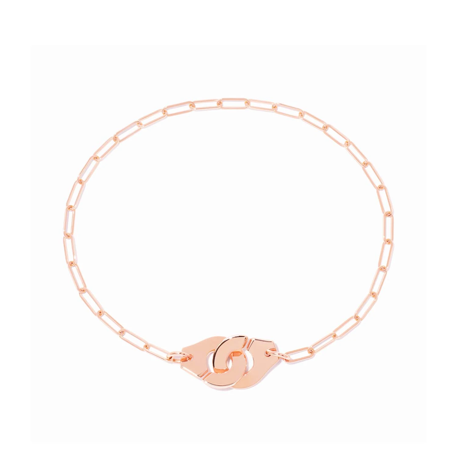 Браслет из розового золота 18 карат. Коллекция Menottes раскрывает фирменный мотив, где застёжка становится главным элементом дизайна. Тонкая цепочка подчёркивает графичный силуэт, создавая баланс изящества и внутренней силы. Тёплое сияние розового золота гармонично соединяет чувственность и минимализм, отражая современный характер украшения. Элегантный и выразительный, браслет станет изысканным акцентом. Длина: 18 см.