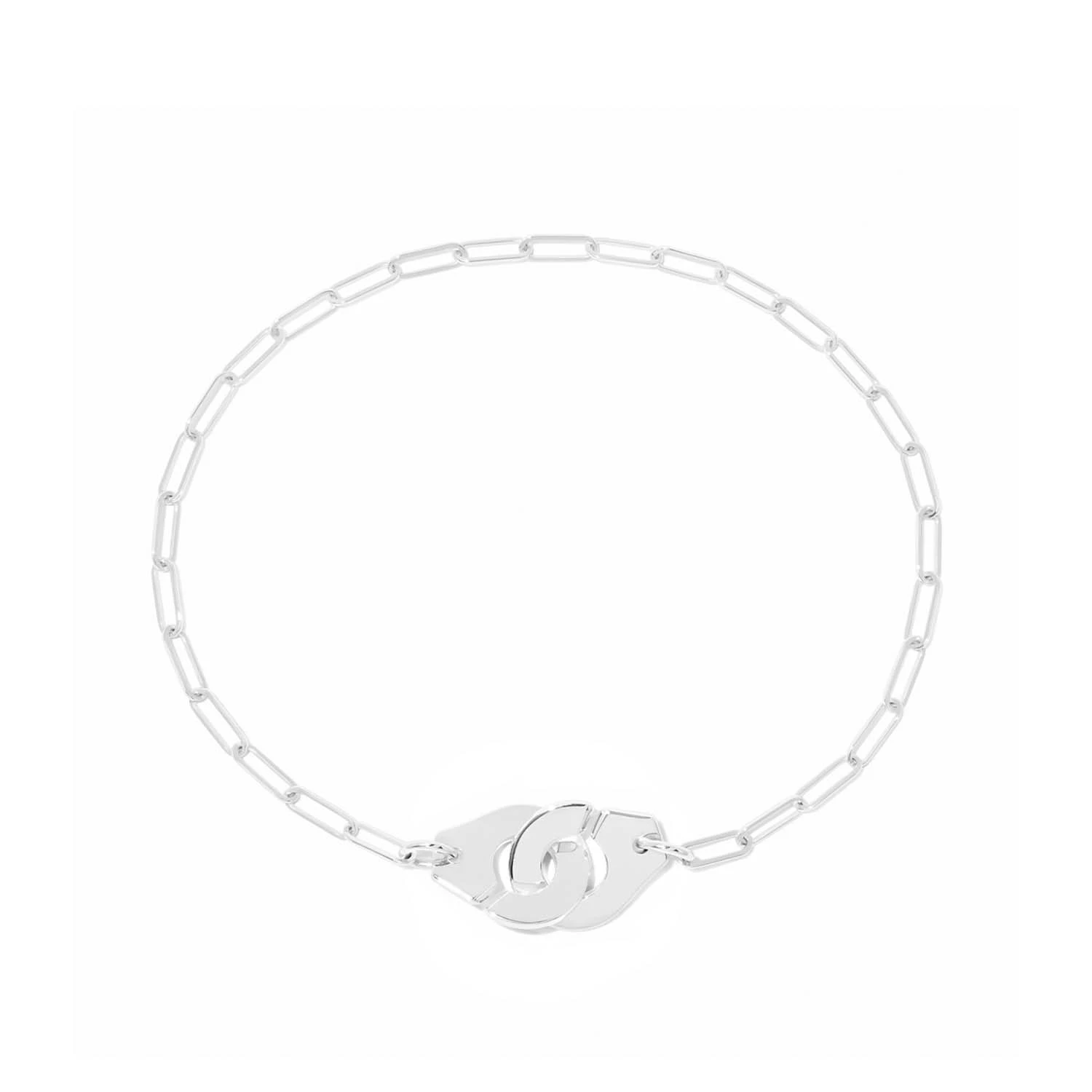 Браслет из белого золота 18 карат. Знаковый мотив Menottes, ставший символом Дома, воплощает идею свободы и смелого характера. Тонкая цепочка изящно подчёркивает застёжку, превращённую в главный элемент дизайна, где функция становится эстетикой. Лаконичный и элегантный, браслет отражает гармонию традиций и современности, раскрывая сдержанную, но выразительную символику. Длина: 18 см.