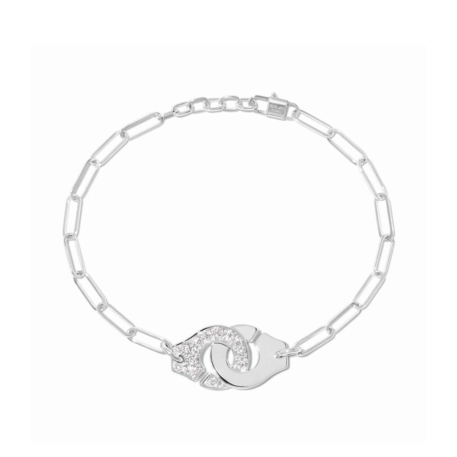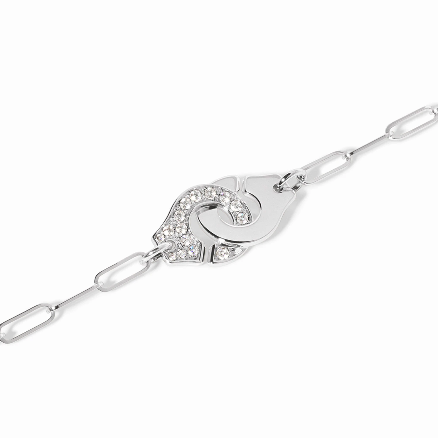 Браслет из белого золота 18 карат с бриллиантами в технике полупаве. Знаковый мотив Menottes становится центральным акцентом и украшен 15 сверкающими бриллиантами, мягко рассеивающими свет. Ритмичная цепочка подчёркивает графичный характер дизайна и современное звучание культового символа. Элегантный и выразительный, браслет воплощает силу избранных связей и утончённую изысканность. Длина: 18 см.