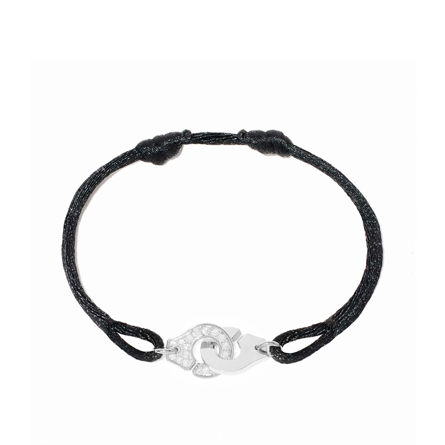 Браслет Menottes на текстильной нити из белого золота 18 карат с бриллиантами — элегантное украшение с узнаваемым мотивом dinh van. Фирменный элемент Menottes, украшенный 16 бриллиантами, придаёт дизайну выразительное сияние. Холодный блеск белого золота и лёгкая текстильная нить создают современный и утончённый акцент.