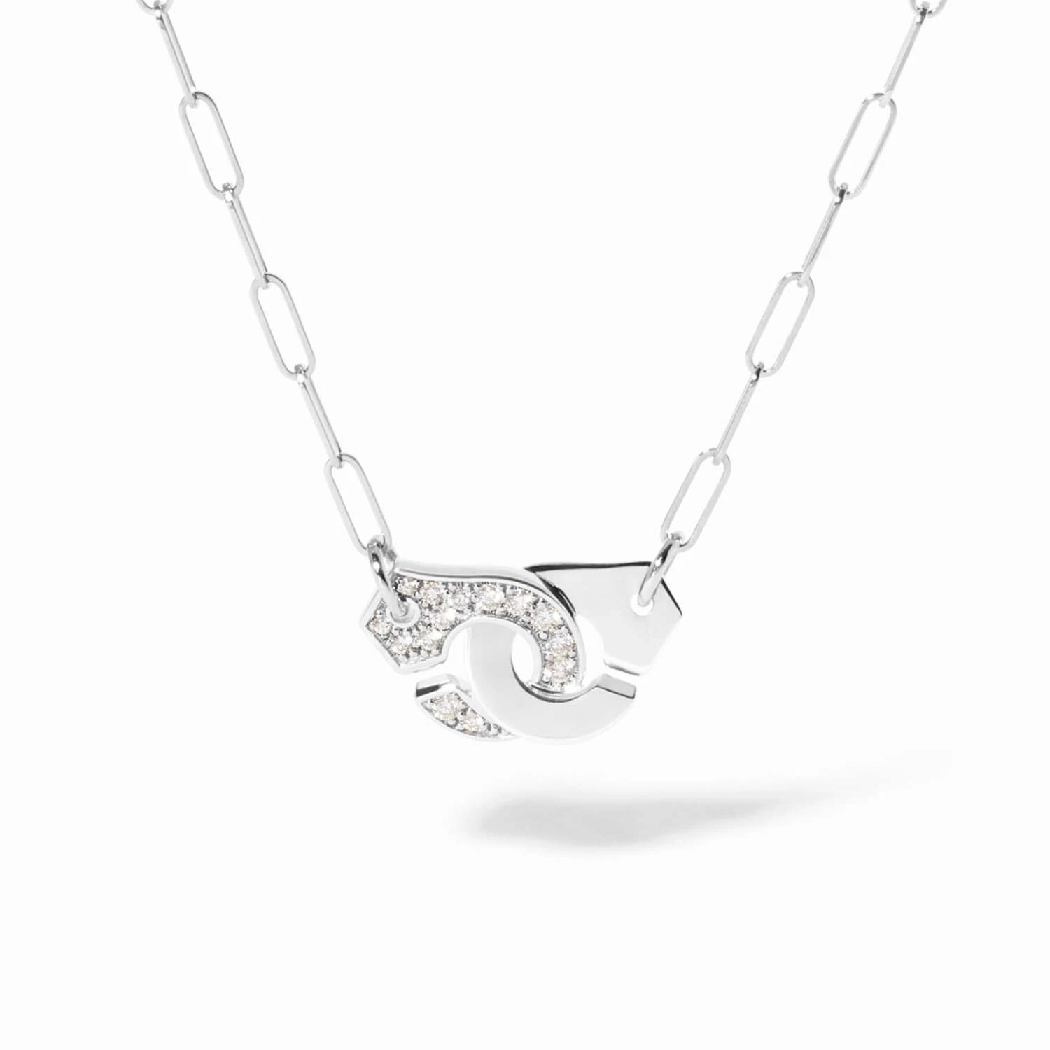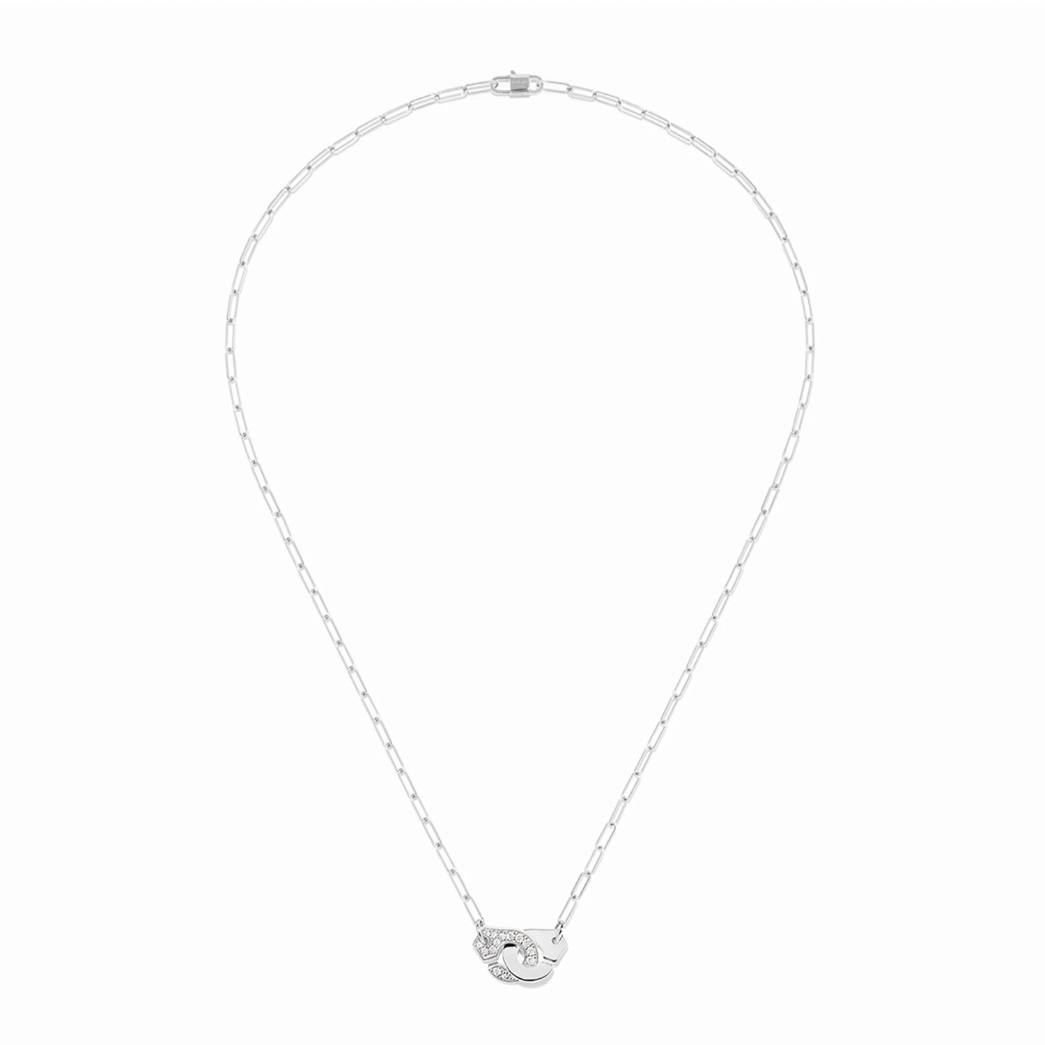 Колье Menottes из белого золота 18 карат, украшенное бриллиантами. Фирменная застёжка, расположенная в центре цепочки и выполненная в версии полупаве, становится символом прочной связи и привязанности. Холодный блеск белого золота подчёркивает чистоту линий, а деликатное сияние бриллиантов придаёт украшению утончённость и световую глубину. Лаконичное и элегантное, колье гармонично дополняет повседневные и вечерние образы. Длина: 42 см.