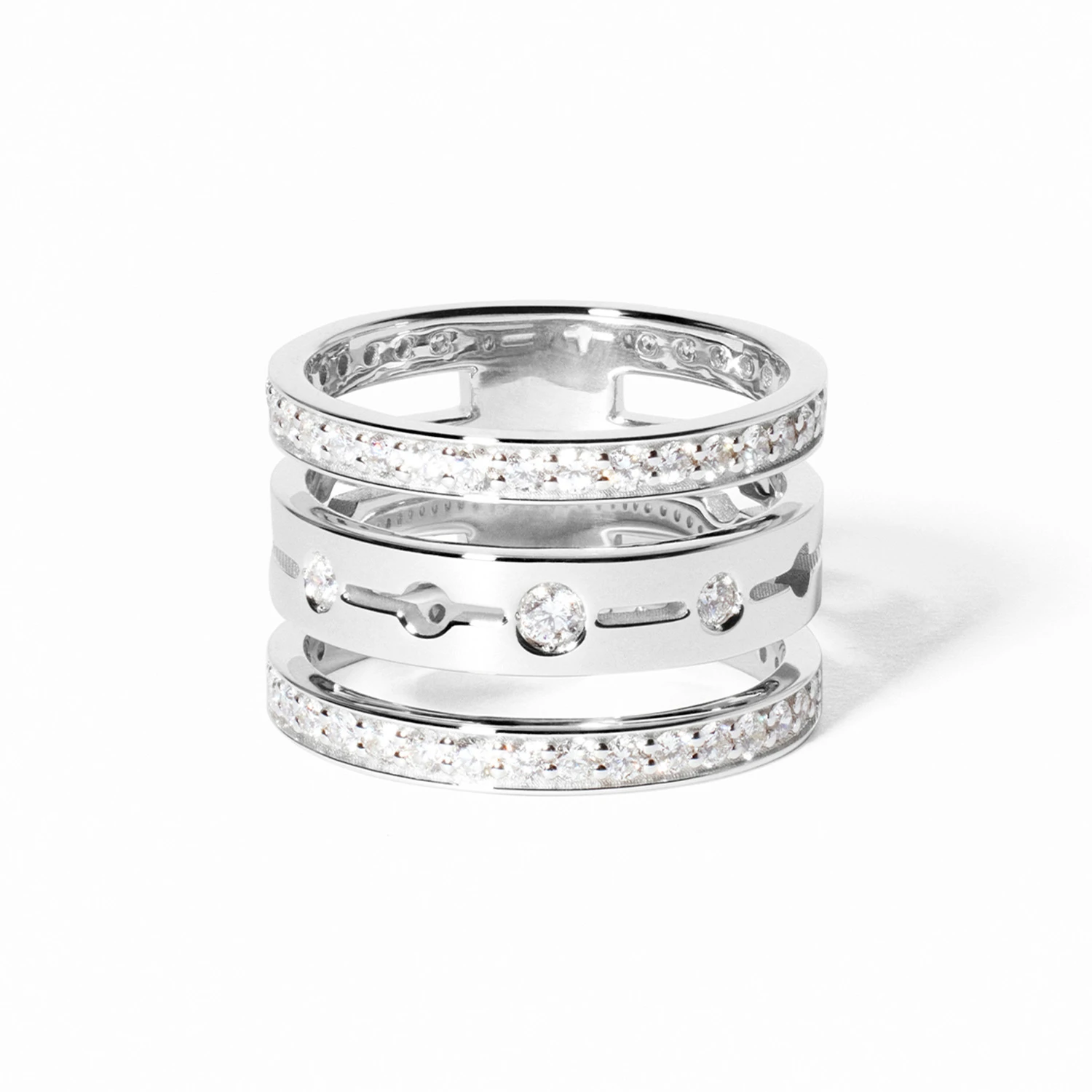 Кольцо Pulse pave 3 ряда из белого золота 18 карат с бриллиантами — выразительная композиция света и формы. Три параллельные линии, инкрустированные бриллиантами, создают эффект непрерывного сияния, подчеркнутого чёткой геометрией и плавными изгибами оправы. Выверенные пропорции формируют уверенный силуэт с современным характером, сохраняя сдержанную элегантность и баланс вне времени.