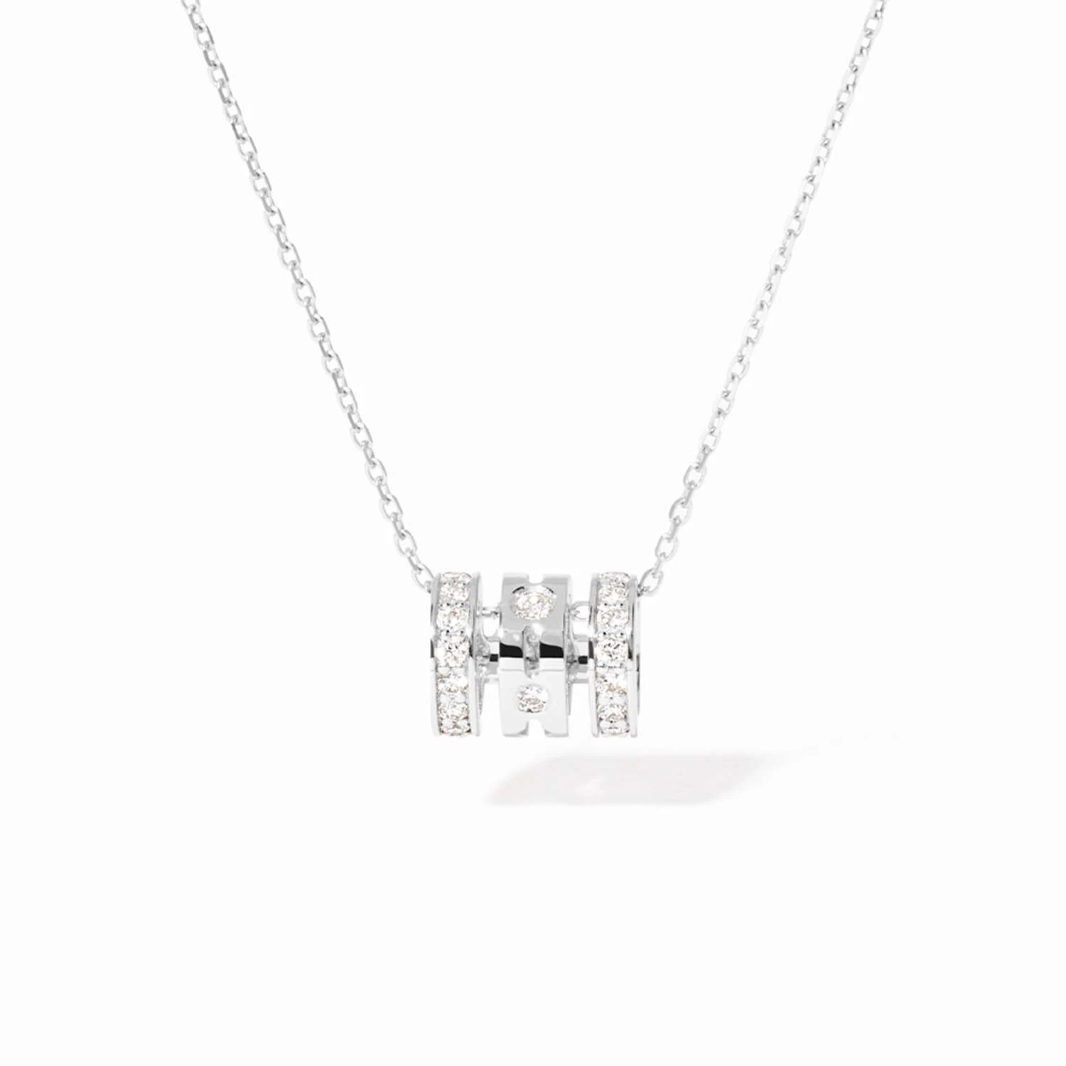 Колье Pulse pave 3 ряда из белого золота 18 карат с бриллиантами — выразительное сочетание ритма и света. Три линии, усыпанные бриллиантами, создают эффект живого сияния, которое подчёркивает лёгкость и графичность формы. Чистые контуры и ажурная конструкция придают украшению современное звучание, объединяя смелый характер и утончённую элегантность вне времени.