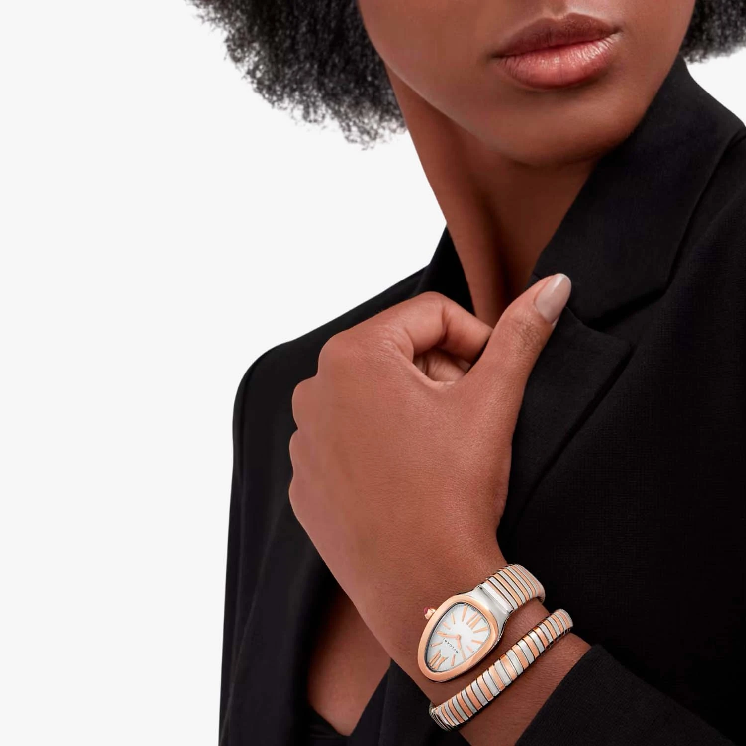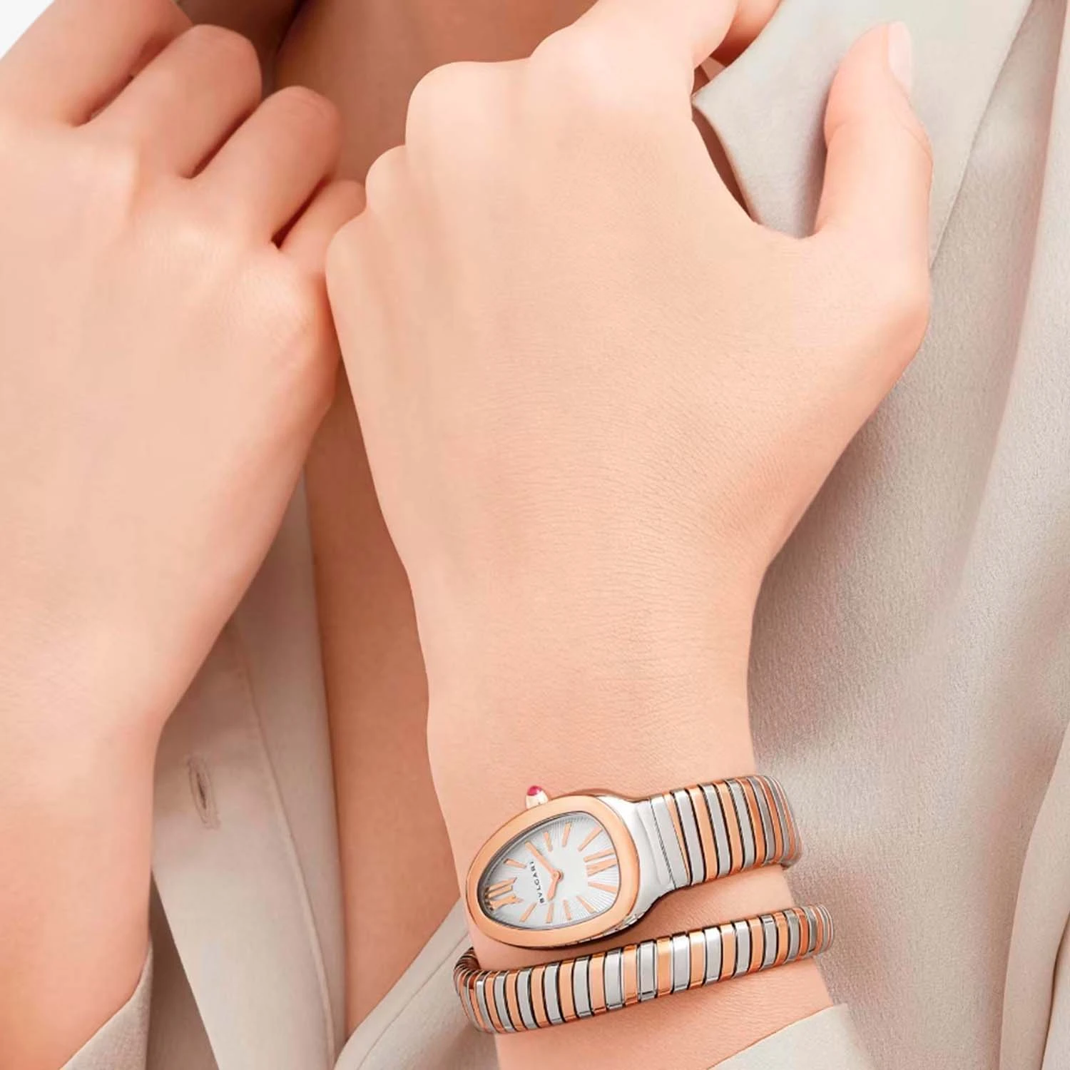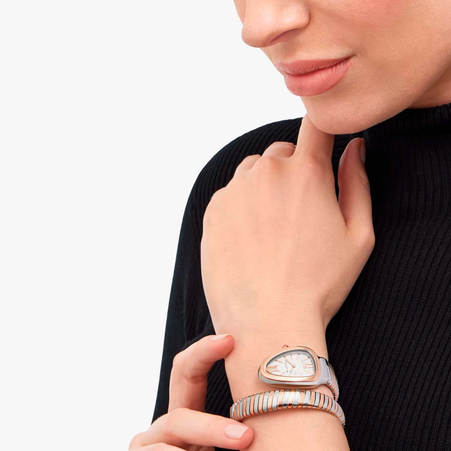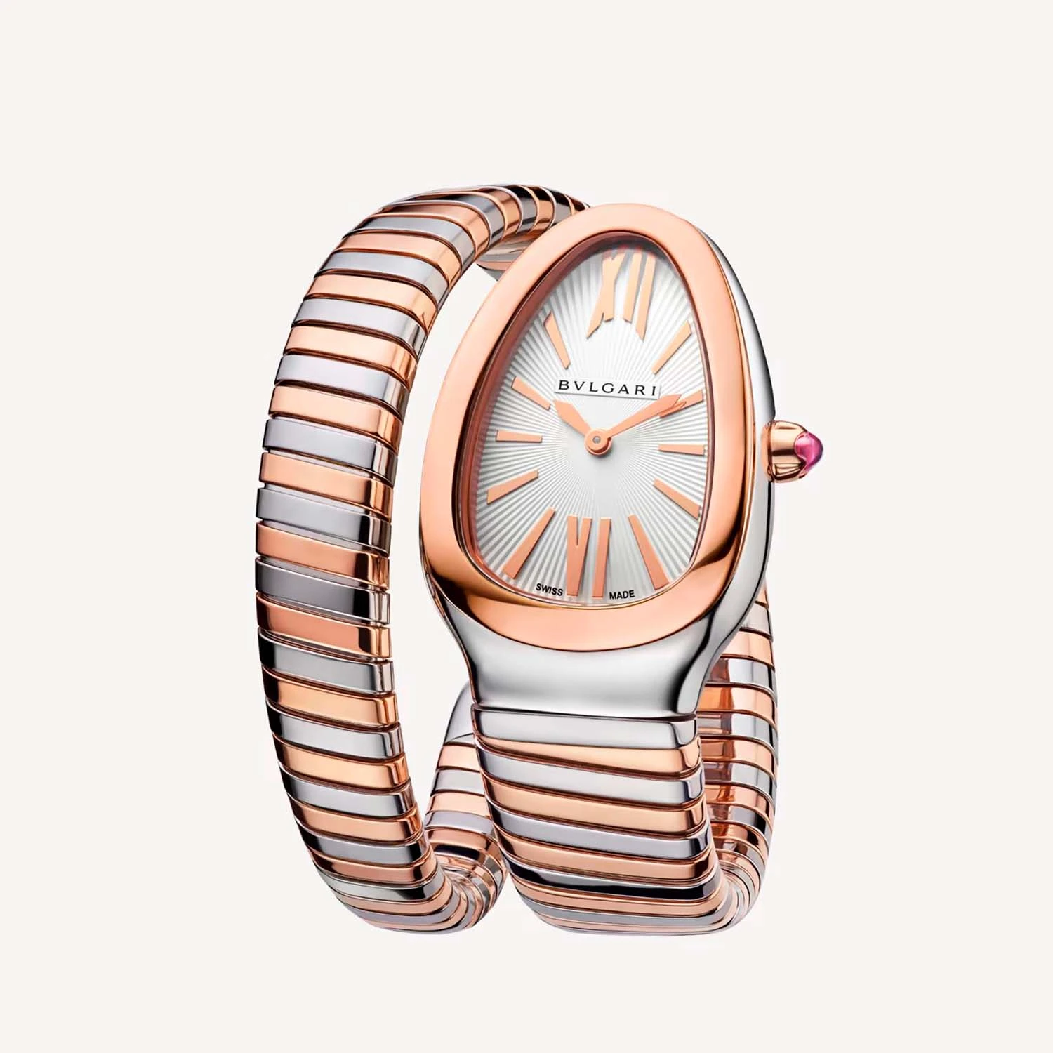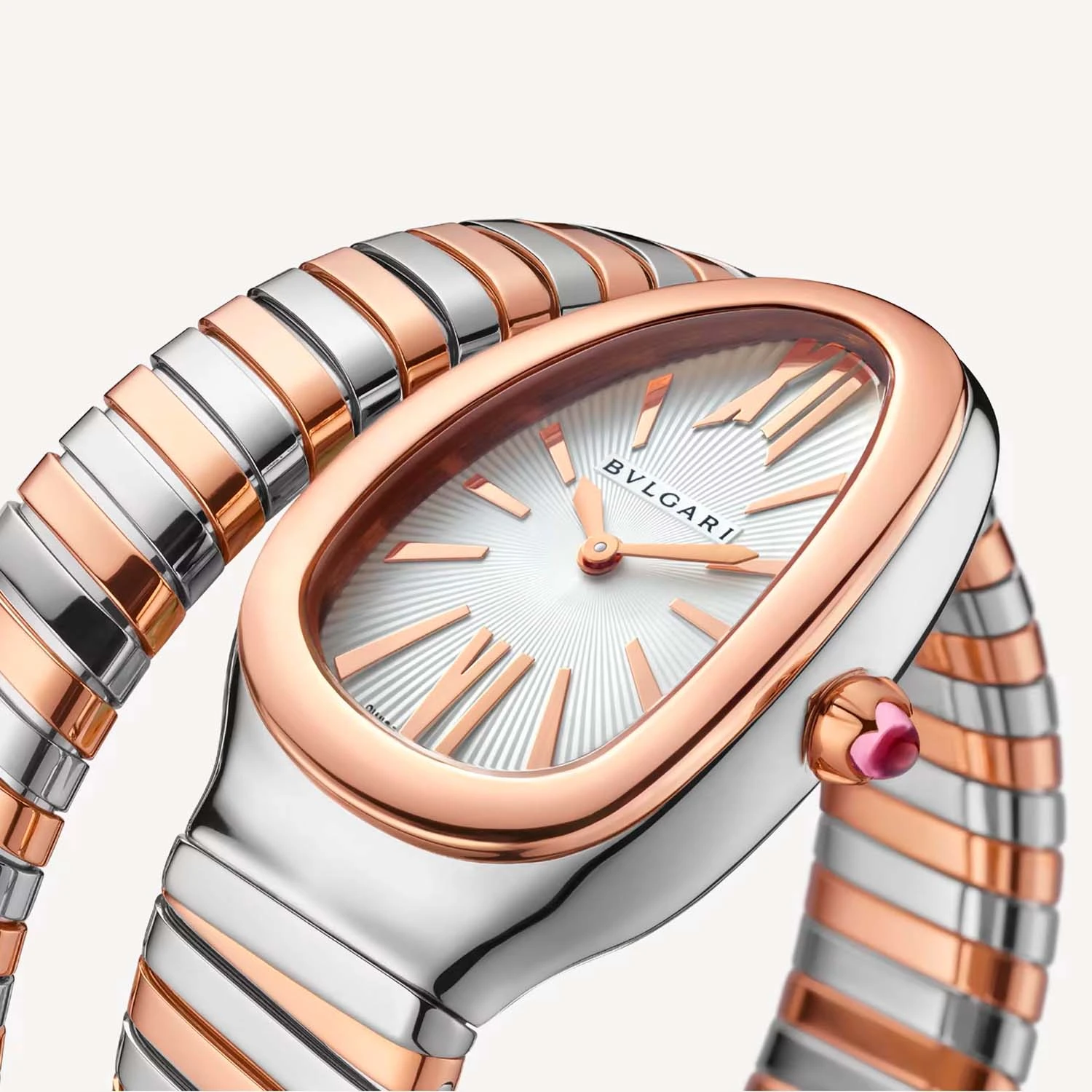 Часы Serpenti Tubogas оснащены кварцевым механизмом и изогнутым каплевидным корпусом из нержавеющей стали. Безель и заводная головка выполнены из розового золота, при этом заводная головка украшена розовым рубеллитом кабошонной огранки. Белый опалиновый циферблат с гильошированным узором soleil и накладными часовыми индексами подчёркивает утончённый характер модели. Одновитковый браслет изготовлен из сочетания розового золота и нержавеющей стали. Функции: часы, минуты. Водонепроницаемость до 30