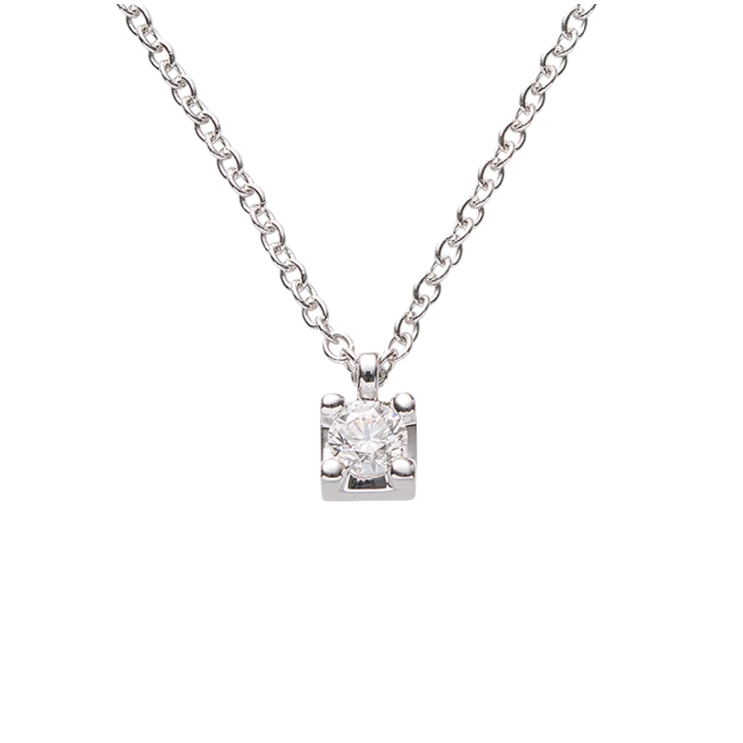 Изысканное колье из белого золота 18 карат, кулон декорирован квадратным бриллиантовым кулоном. Дополните повседневный образ или вечерний наряд бриллиантовым украшением. Общий вес изделия 2,50 гр.