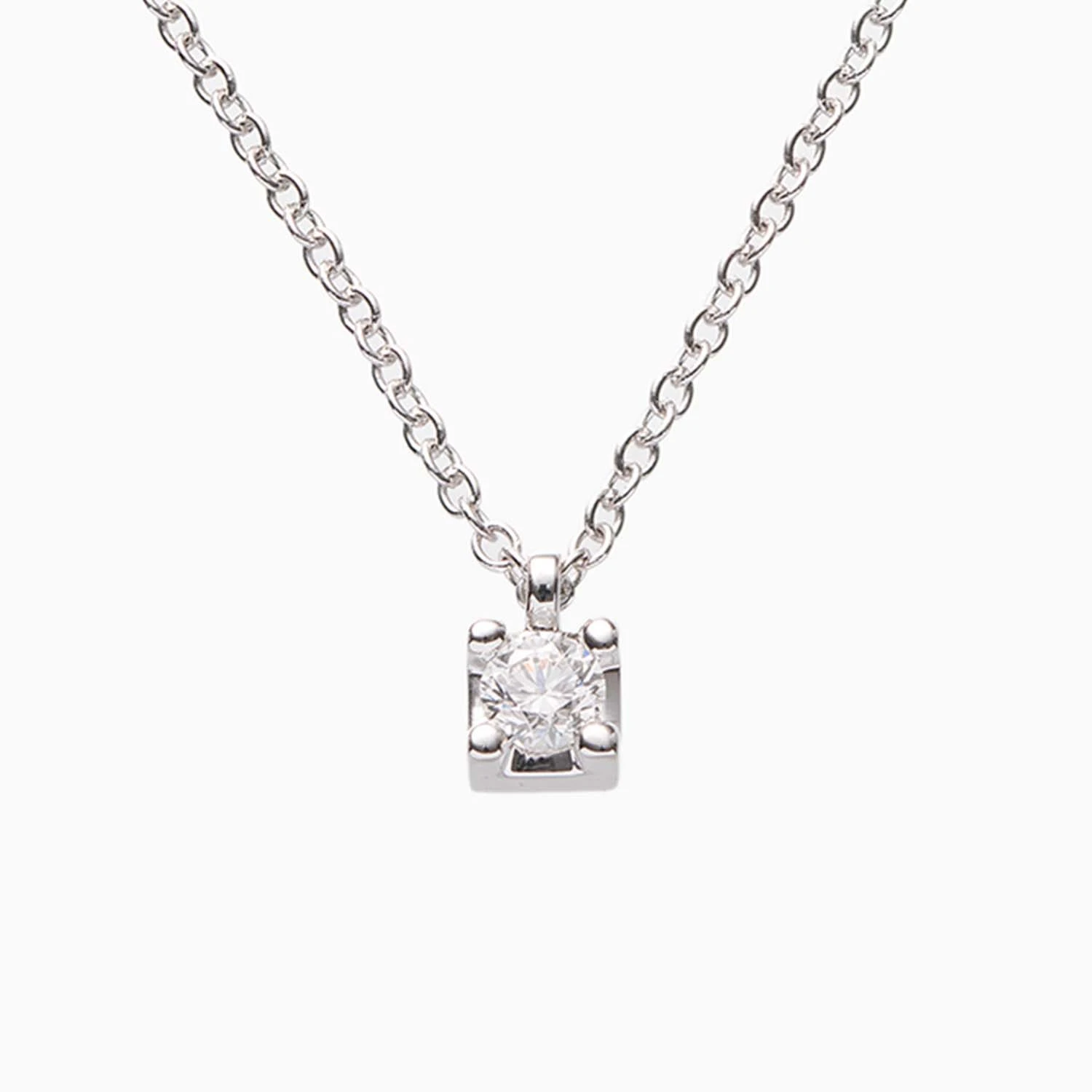 Элегантное колье, украшенное бриллиантом-солитером квадратной огранки. Прочная оправа из 18-каратного белого золота с четырьмя зубцами акцентирует великолепный блеск бриллианта и подчеркивает его исключительное сияние. Общий вес изделия 2,40 гр.
