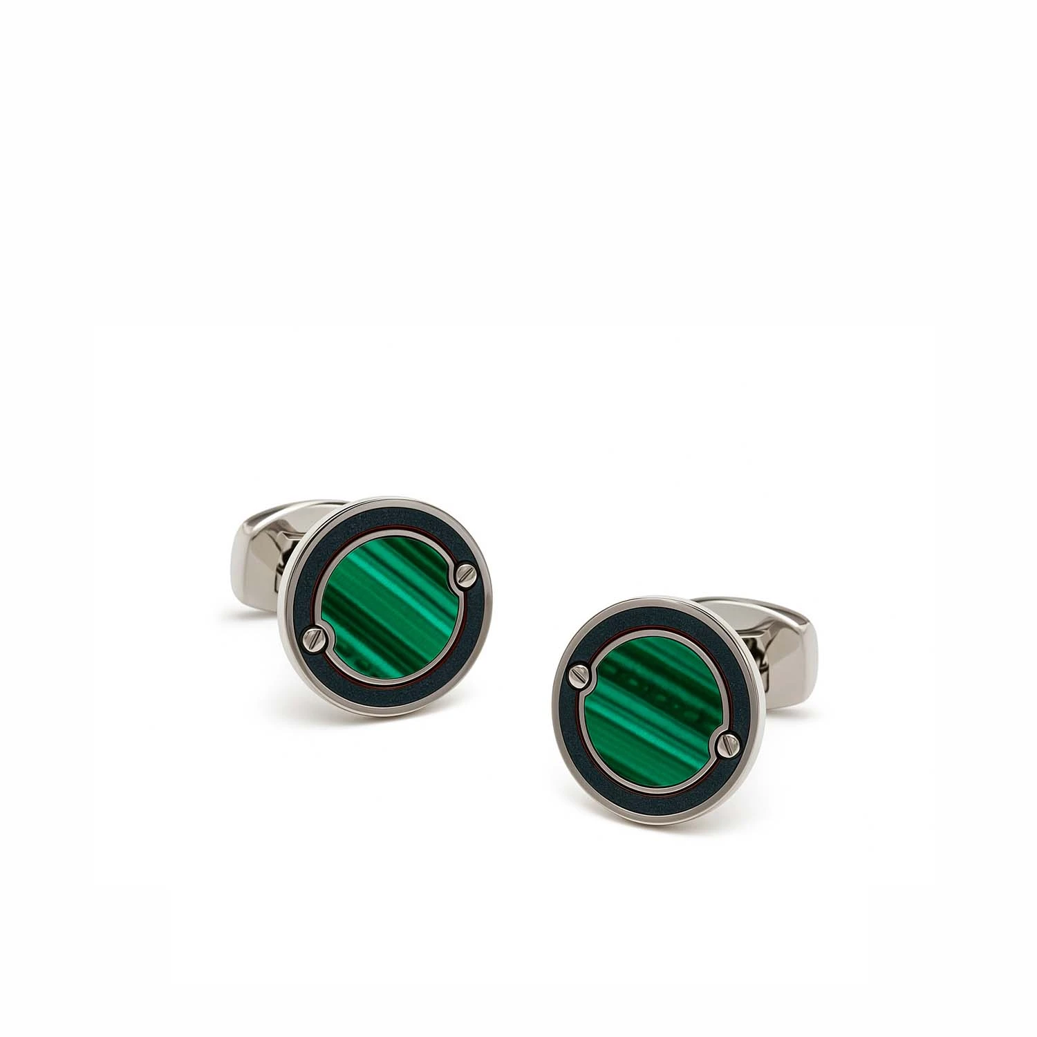 Стильные запонки «England Made Me» выполнены из серебра 925 пробы с покрытием из белого и чёрного родия. Круглая вставка из натурального малахита придаёт аксессуару выразительность, глубину и изысканную элегантность.