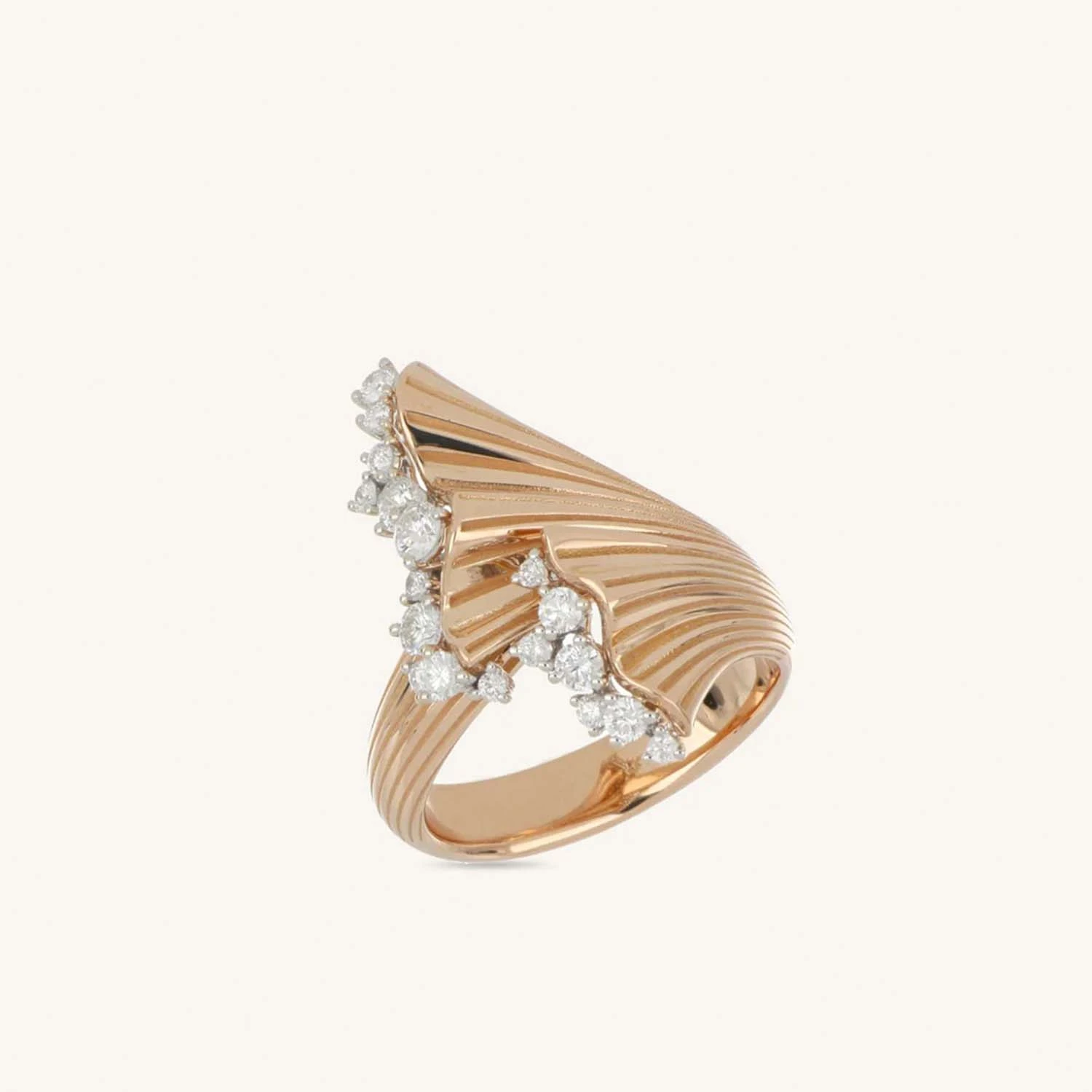 18 karatli qizil oltindan yasalgan, Rays of Sun kolleksiyasiga mansub olmosli uzuk — noyob dizaynga ega bo'lgan elegan taqinchoq. Oltinning egilgan chiziqlari va mat teksturalar yorug'lik va soya o'yinini yaratadi, olmoslar esa hashamat va nafislikni ta'kidlab, uzukni har qanday uslub uchun mukammal aksentga aylantiradi.