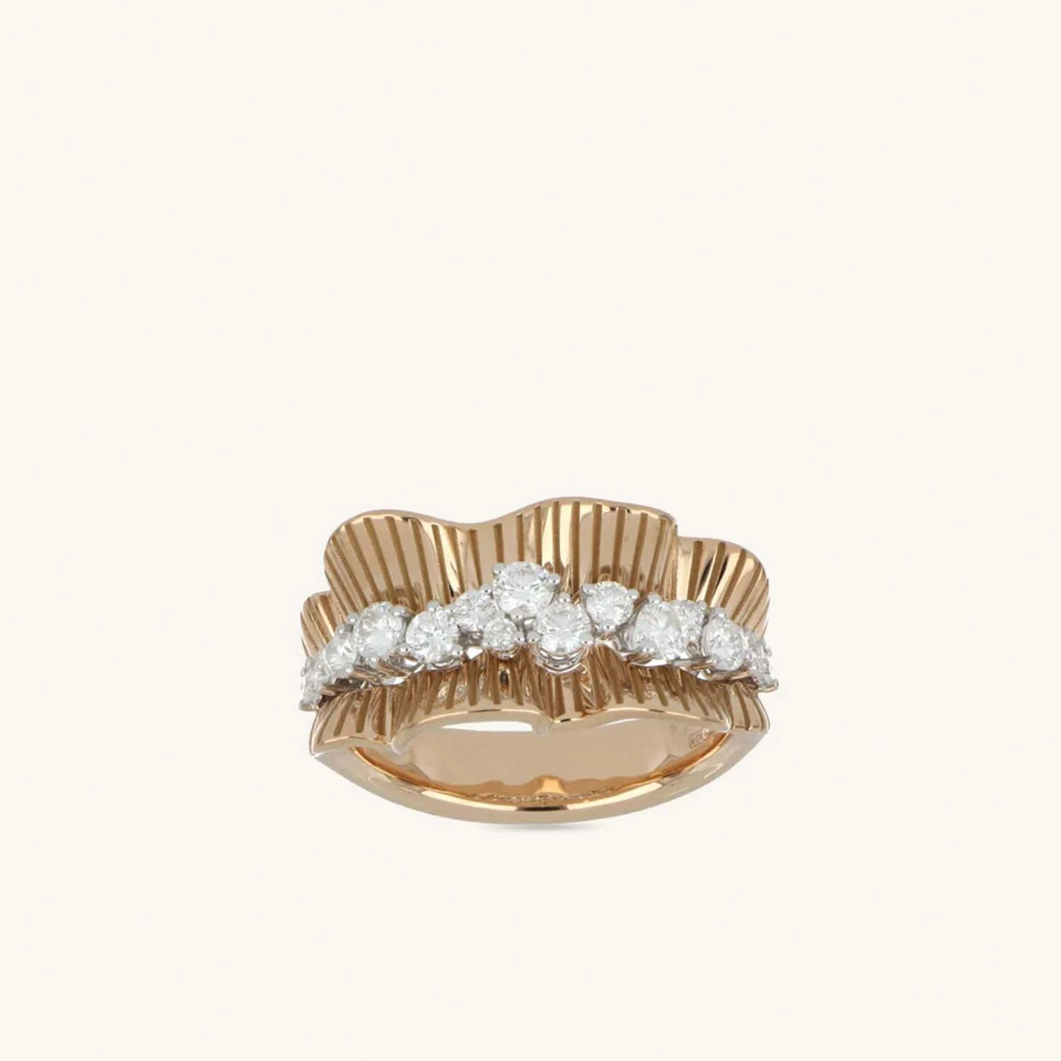 18 karatli qizil oltindan yasalgan, Rays of Sun kolleksiyasiga mansub olmosli uzuk — quyosh nurining sehrini o'zida mujassam etgan noyob taqinchoq. Issiq nurlar yorug'lik va soya o'yinini yaratadi, porlab turgan oltinning egilgan shakllari va silliq chiziqlari mat teksturalar bilan almashib, hayratlanarli porlash effektini yaratadi.