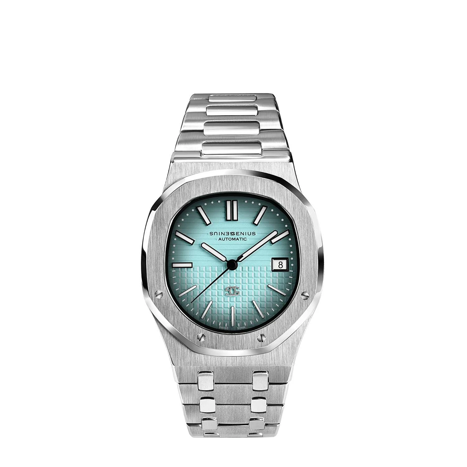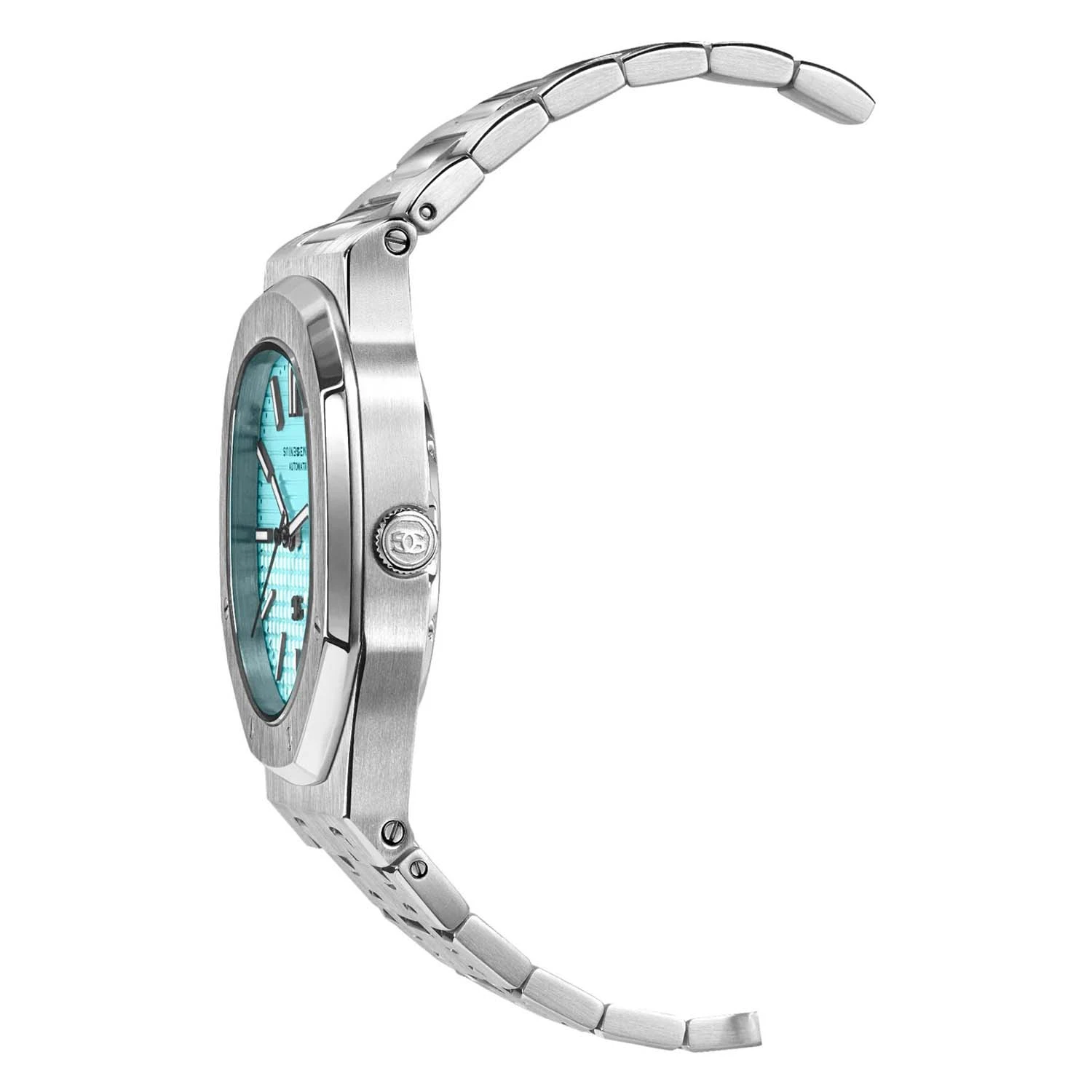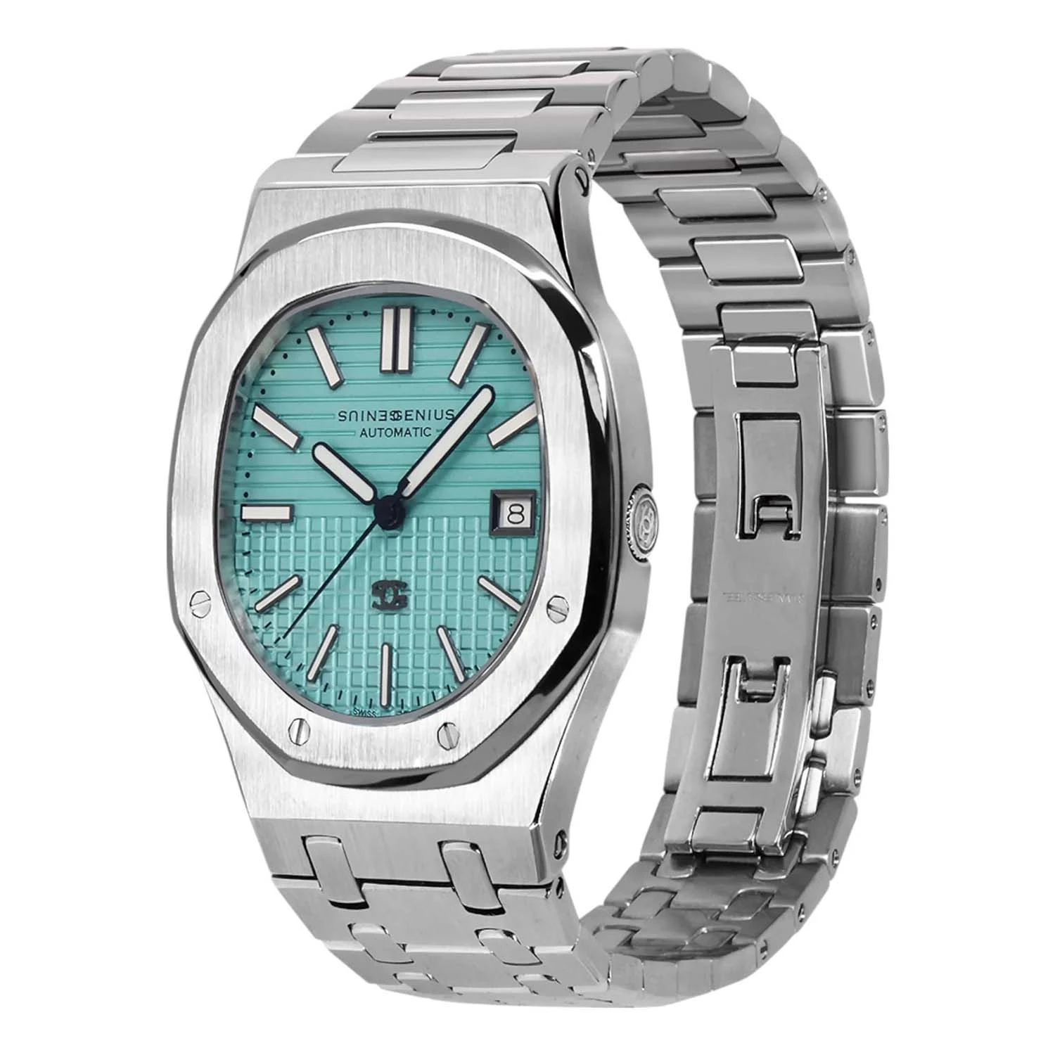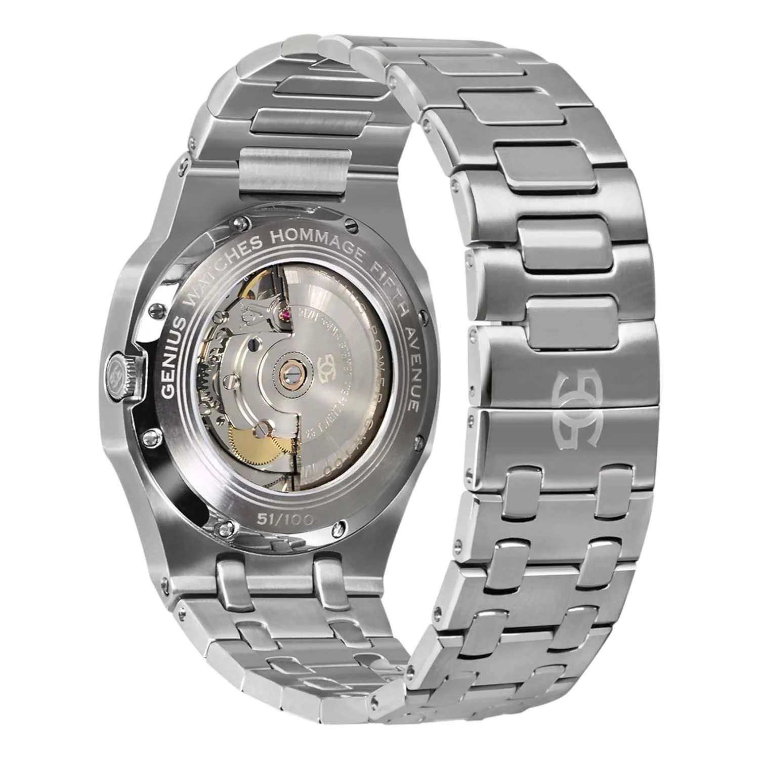 Avtomatik mexanizmli Fifth Avenue soati — 39 х 49,8 х 10,6 mm o‘lchamdagi zanglamaydigan po‘lat korpus va bilaguzuk bilan. Gilyoshe texnikasida ishlangan to‘q ko‘k-yashil teksturali siferblat safir oynasi bilan himoyalangan. Funksiyalari: soat, daqiqa, soniya va sana. 48 soatlik energiya zahirasi hamda 50 metr suv o‘tkazmaslik darajasiga ega. Kuchli kontrast va shahar energiyasini sevuvchilar uchun yorqin moviy-yashil tus — jasur va o‘ziga xos.