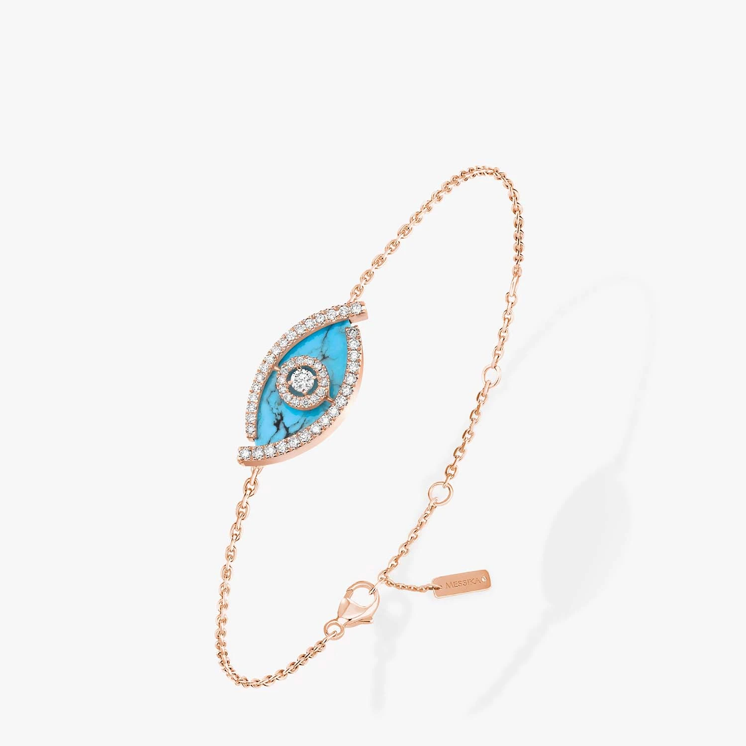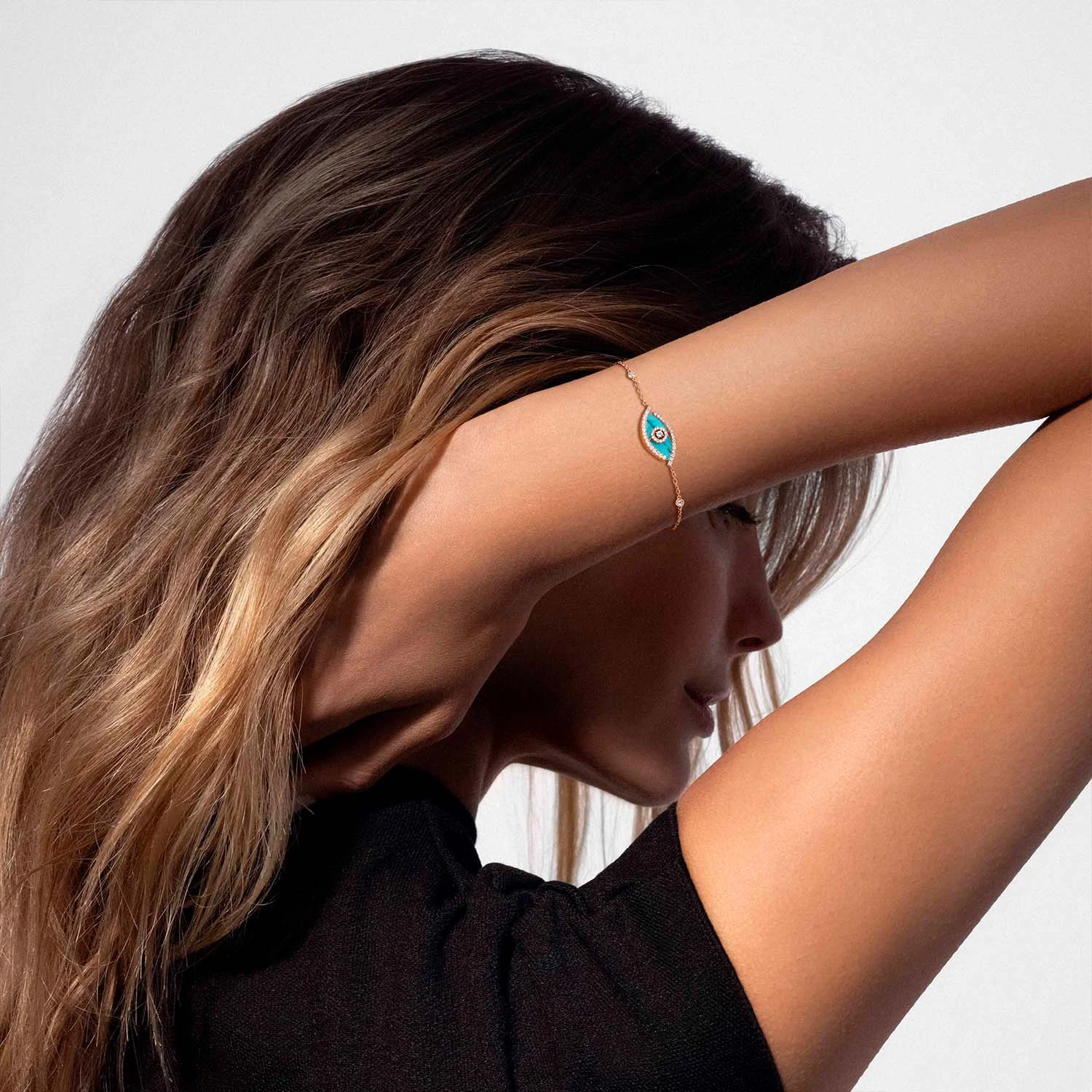 18 karat pushti oltindan yasalgan bilaguzuk, brilliantlar va firuza bilan. Element uzunligi 18 mm.