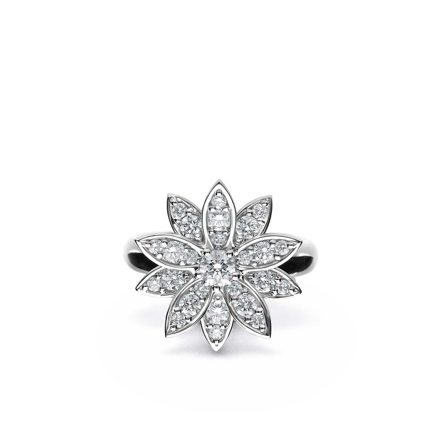 Кольцо из 18-каратного белого золота с бриллиантами. Модель выполнена в виде элегантного цветочного мотива, где лепестки, усыпанные бриллиантами, создают выразительное сияние. Вес золота: 5,63